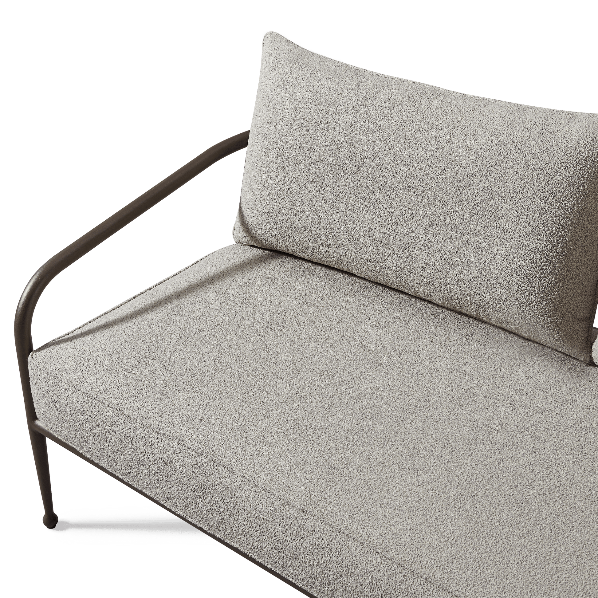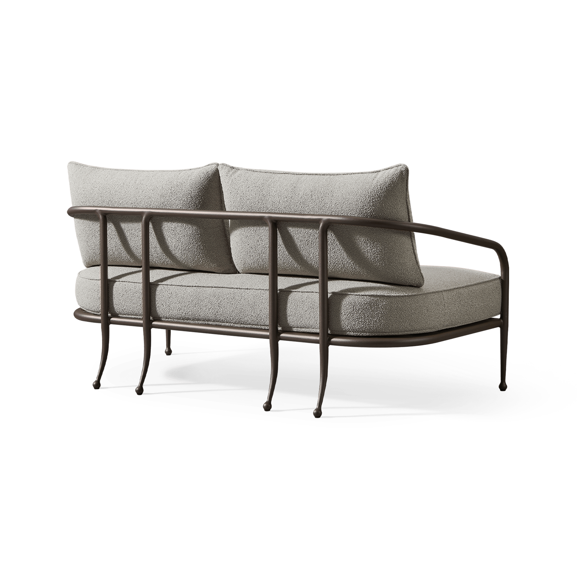 The Andre 2 Seat Sofa is inspired by classic wrought iron European furniture—enjoy a comfortable bench seat cushion with a pair of back pillows on our signature powder coated aluminum frame in a thinner style that creates an airy openness. The gradual slope and subtle curve of the frame add contemporary flair, while the back legs echo this effect with an equally subtle splay design. Details like ball feet and multiple rows of legs inject a contemporary, playful element. Petite in scale but grande in design, this outdoor sofa captures the look and feel of iron in an elegant construction that you might discover sitting in the garden of a five–star hotel in the South of France.