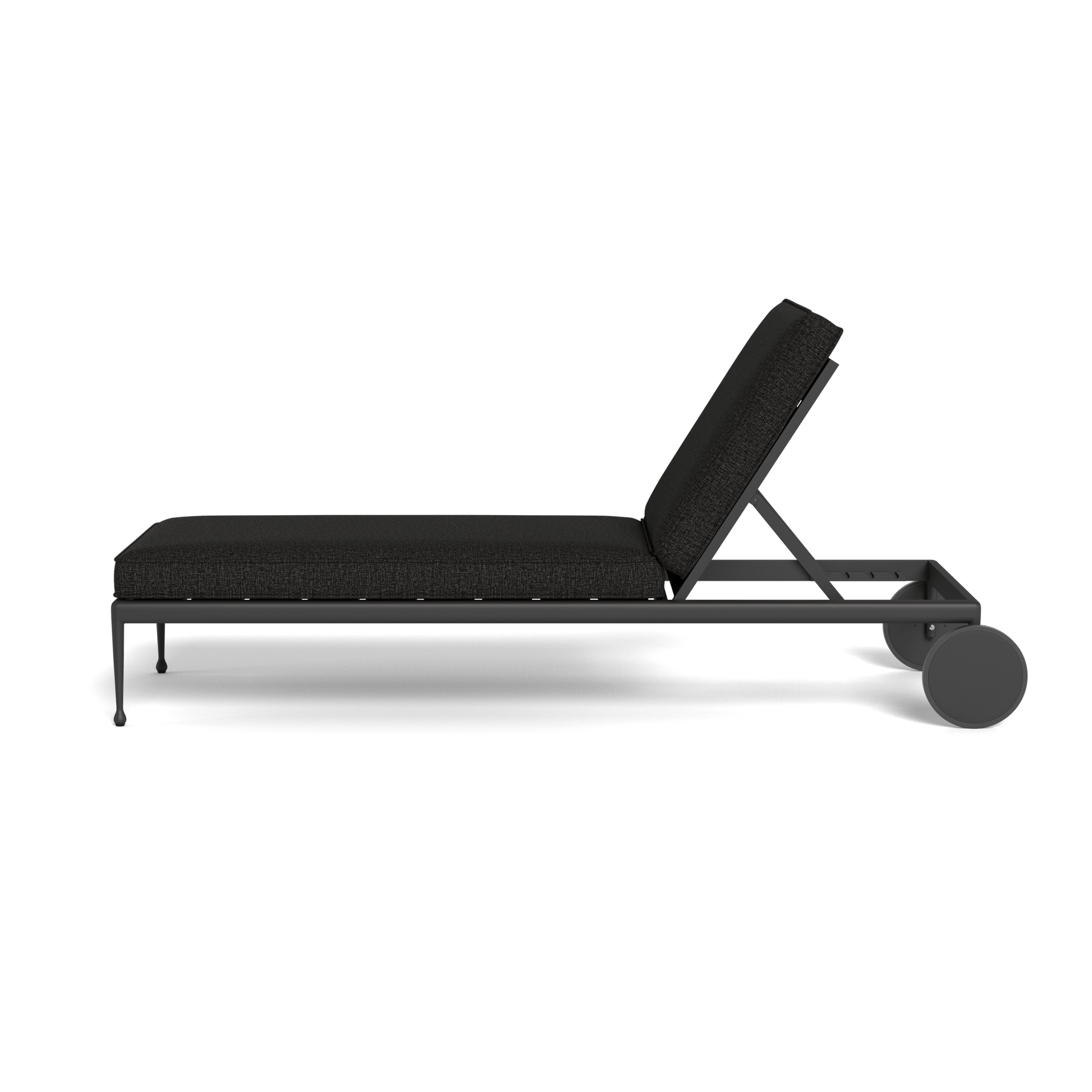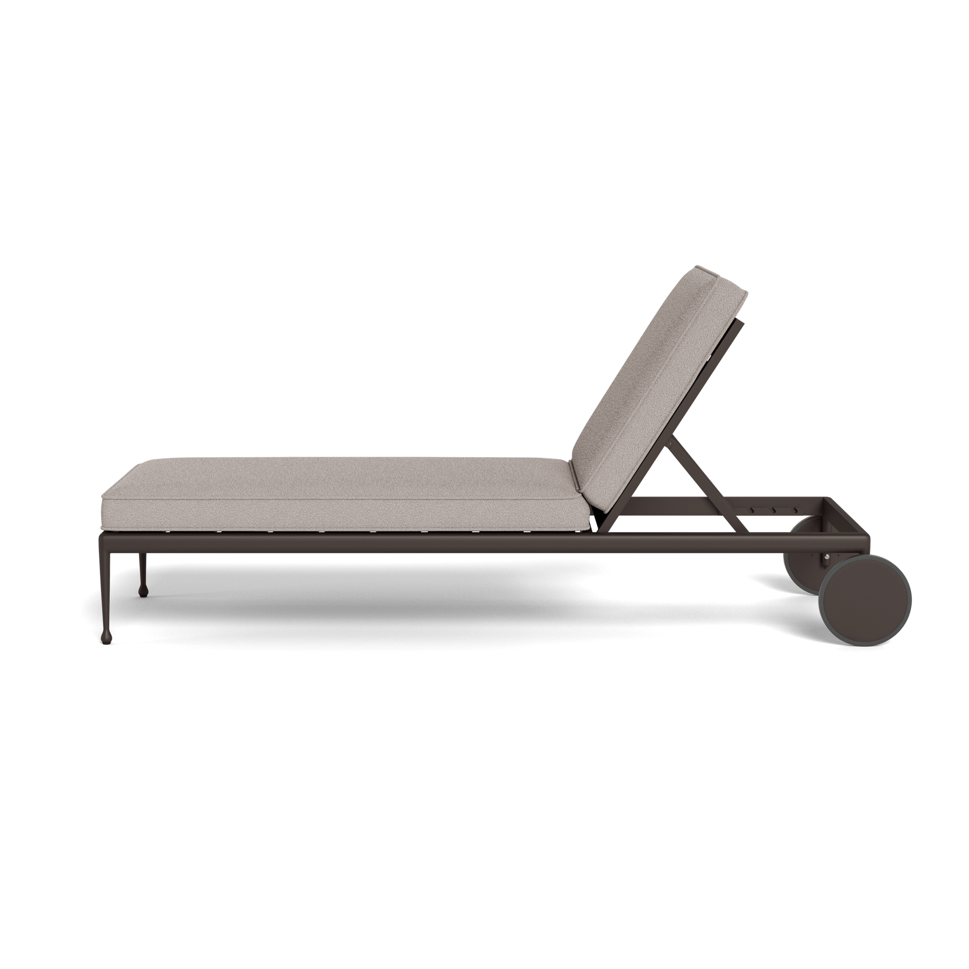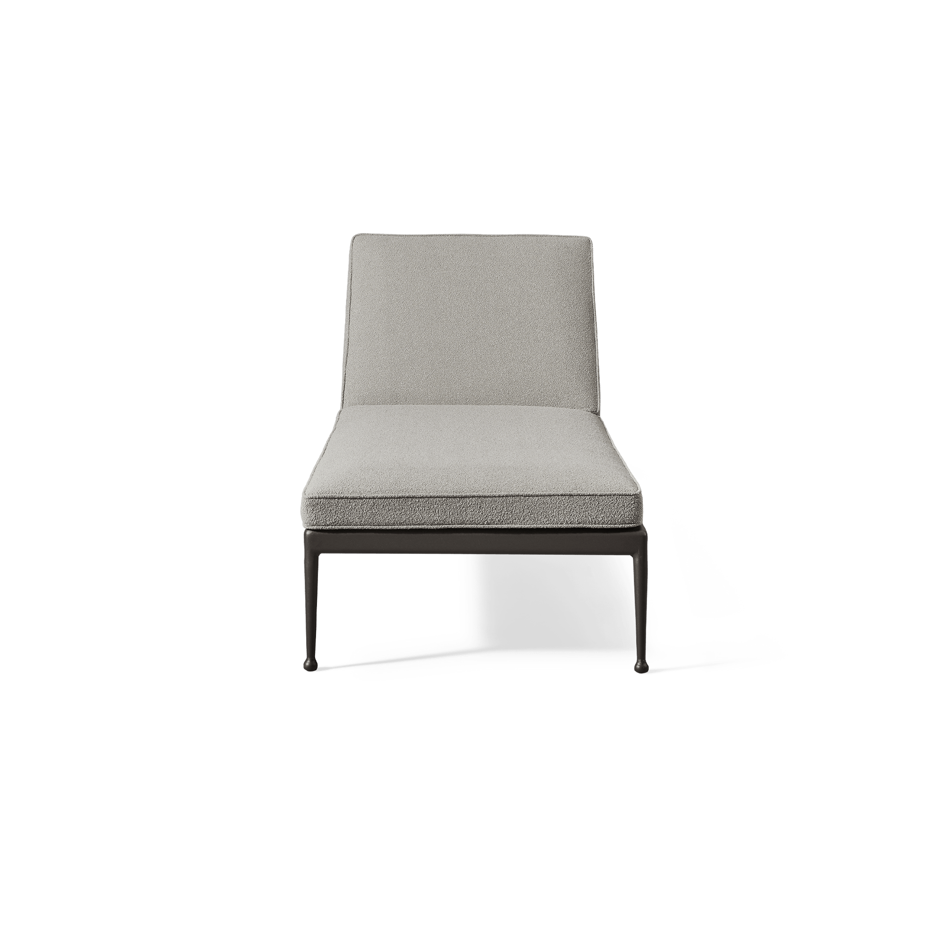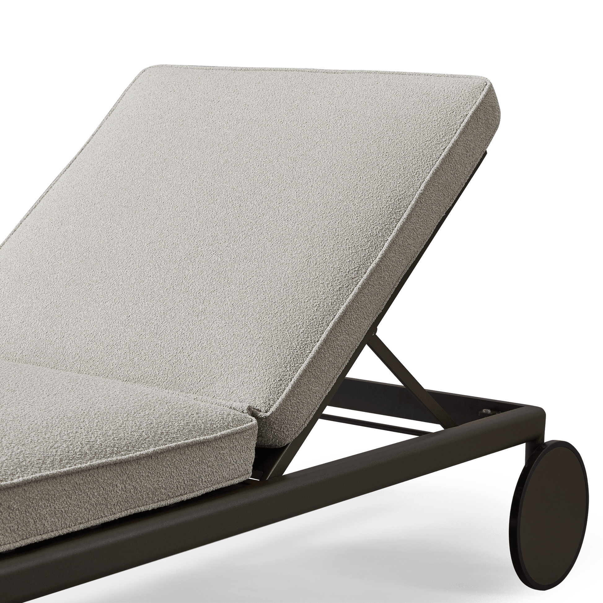 The Andre Sun Lounge is inspired by classic wrought iron European furniture—enjoy a comfortable hinged lounge cushion on our signature powder coated aluminum frame in a thinner style that creates an airy openness. The gradual slope and subtle curve of the frame add contemporary flair, while the back legs echo this effect with an equally subtle splay design. Details like ball feet and a garden–style wheel inject a contemporary, playful element. With an adjustable back for maximum relaxation, this sun lounge captures the look and feel of iron in an elegant construction that you might discover sitting in the garden of a five–star hotel in the South of France.