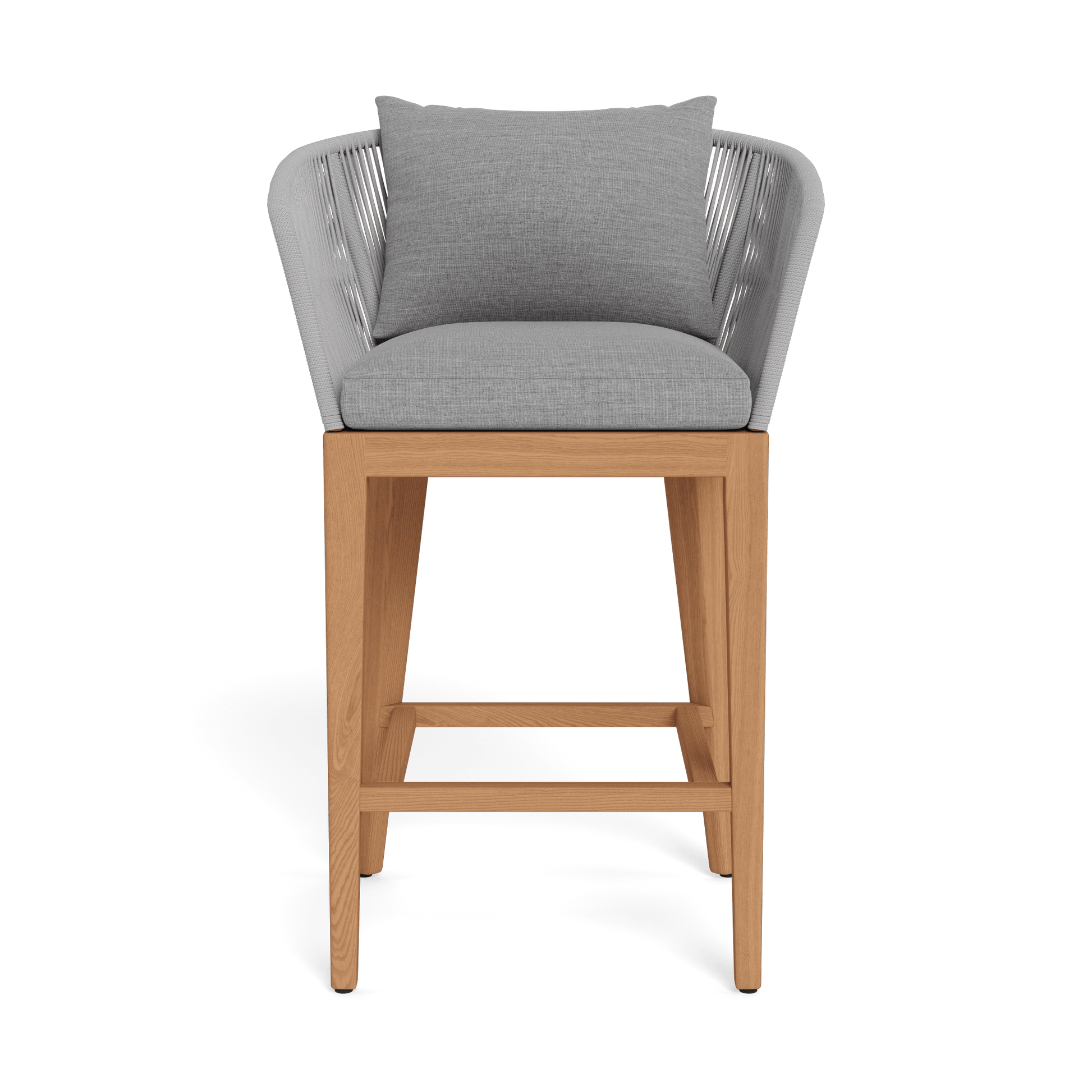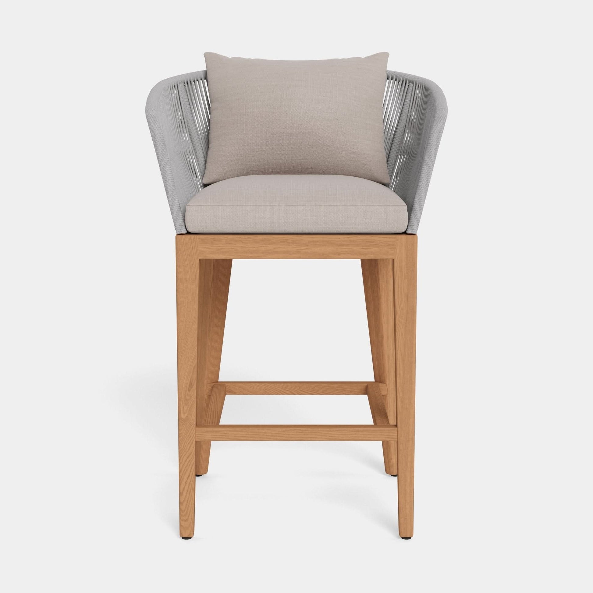 A nod to the Australian surf town of Avalon Beach, our Avalon collection pairs clean lines with practical design for surfside relaxation anywhere. The Avalon Bar Stool was designed as the perfect everyday seat for bar tables and spaces — featuring a solid teak frame in Natural with tapered legs, signature sculptural back contours and double–layered woven Olefin rope accents in Light Grey. Enjoy a pair of all–weather seat and back cushions available in a range of neutral tones for total comfort. This effortless outdoor bar–height stool with subtle mid–century touches is made to be incredibly versatile, elevating any space.