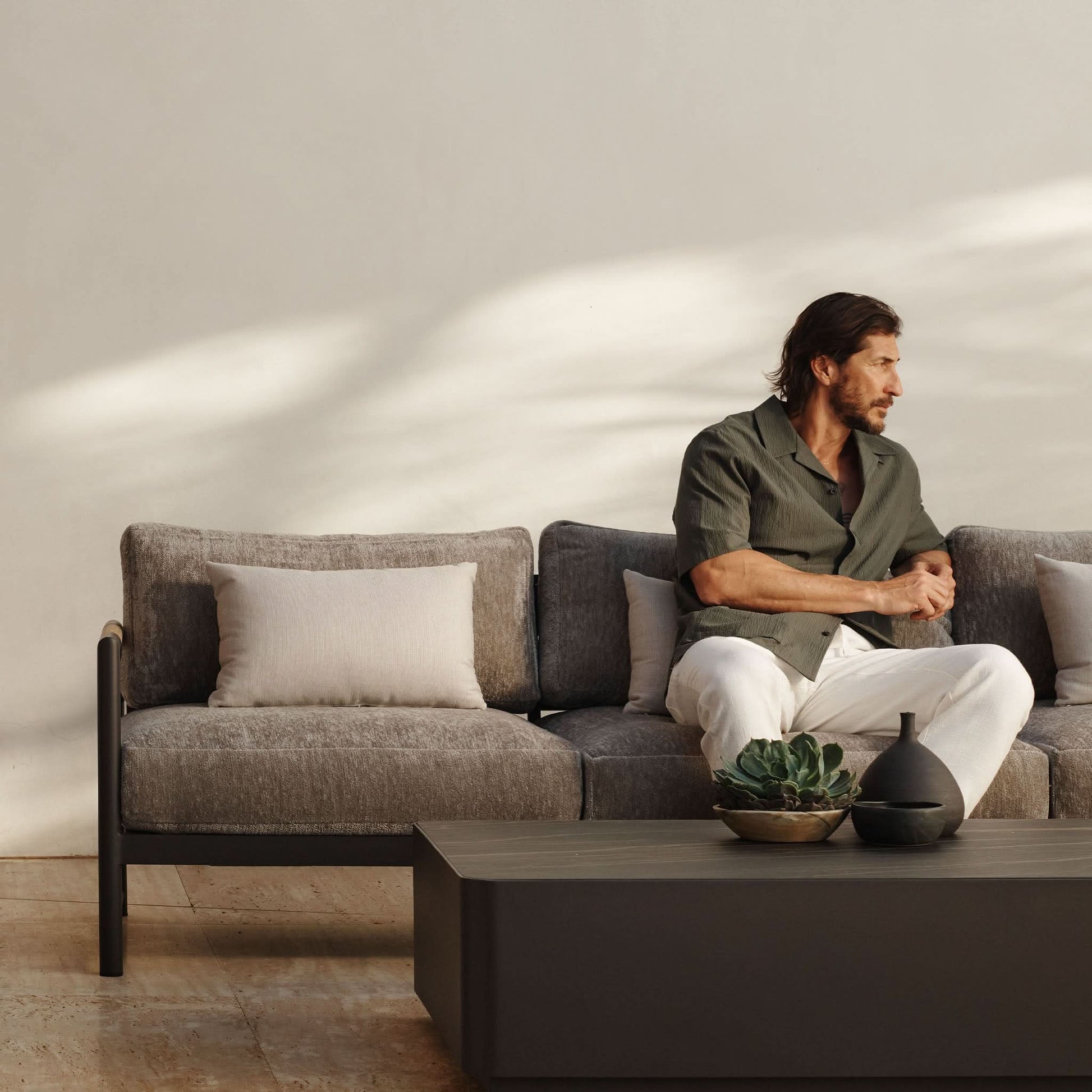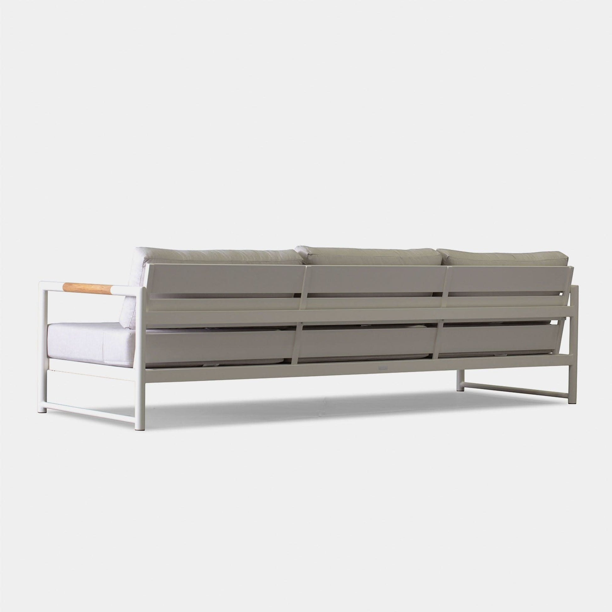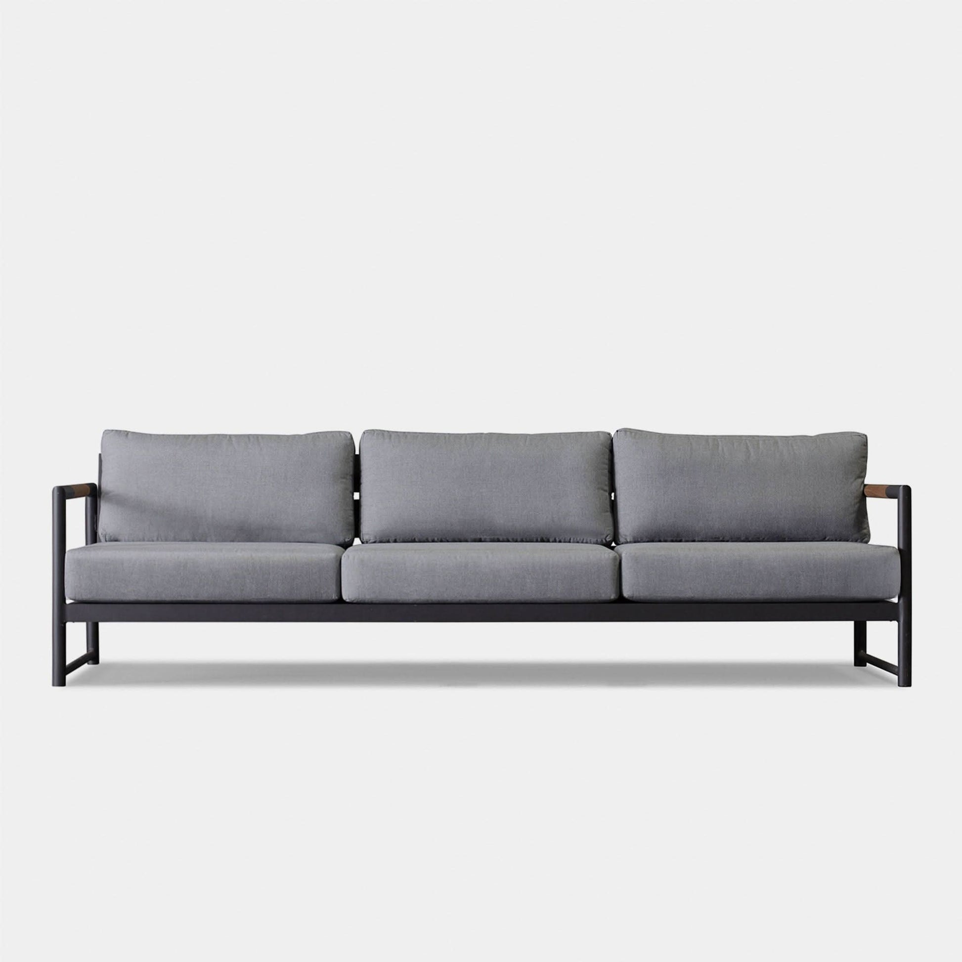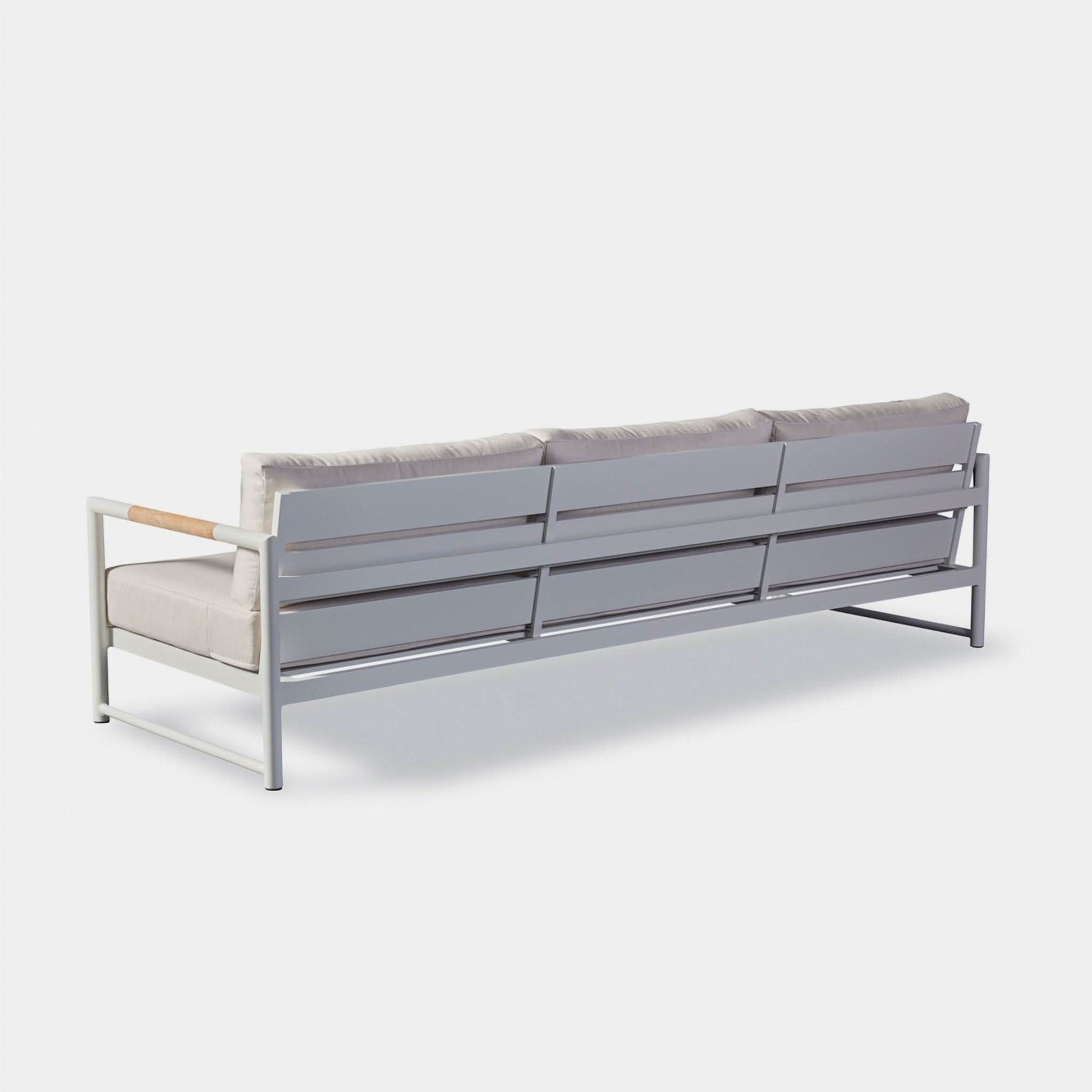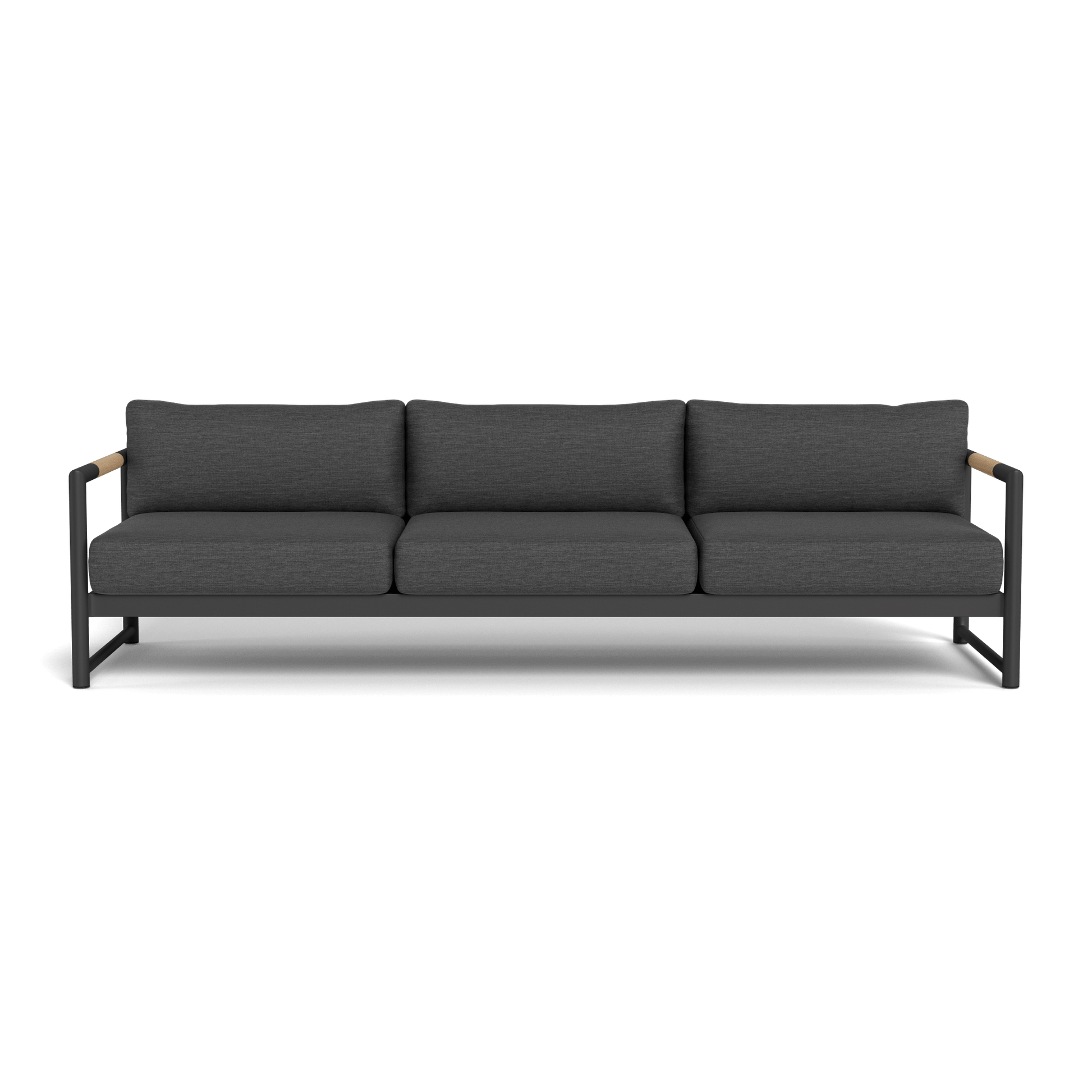 A signature Harbour collection, our Breeze XL line mixes tubular aluminum construction with solid teak accents for an alluring simplicity. The low–profile Breeze XL 3 Seat Sofa is modern comfort — enjoy plush cushions on a powder coated extruded aluminum frame with an aluminum slatted suspension, plus solid teak arm inlays that help cool the armrest. This elegant piece sets the tone for grander spaces.
