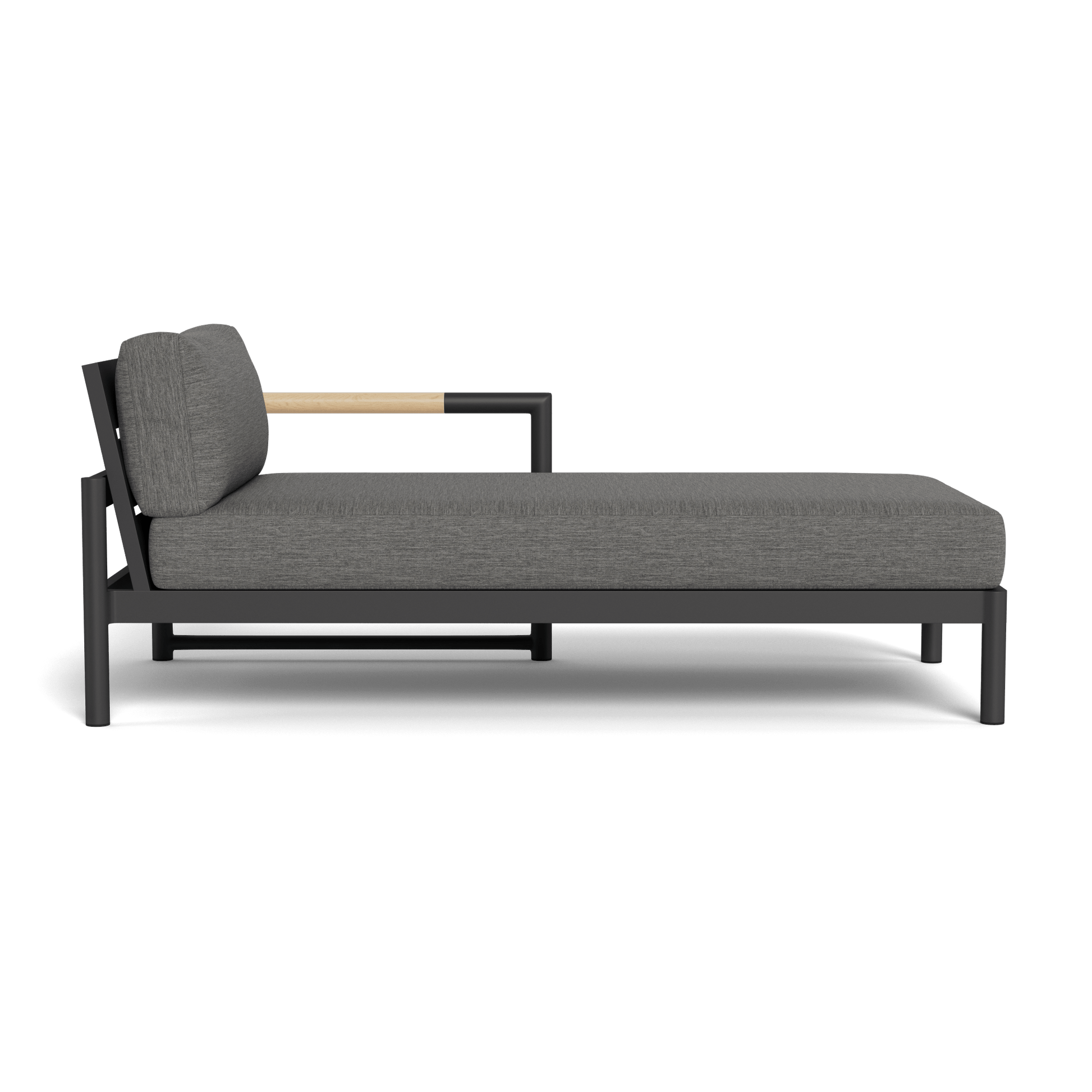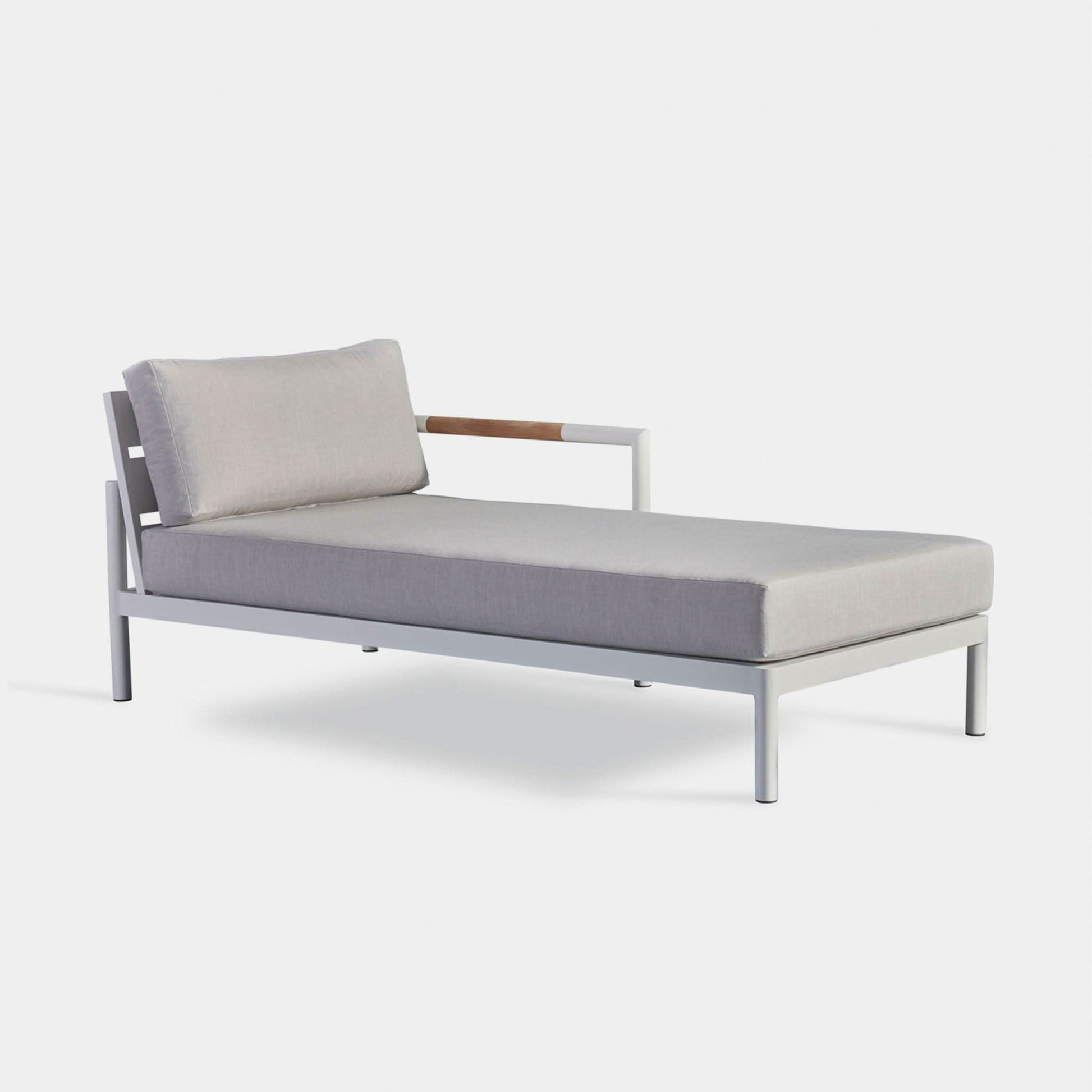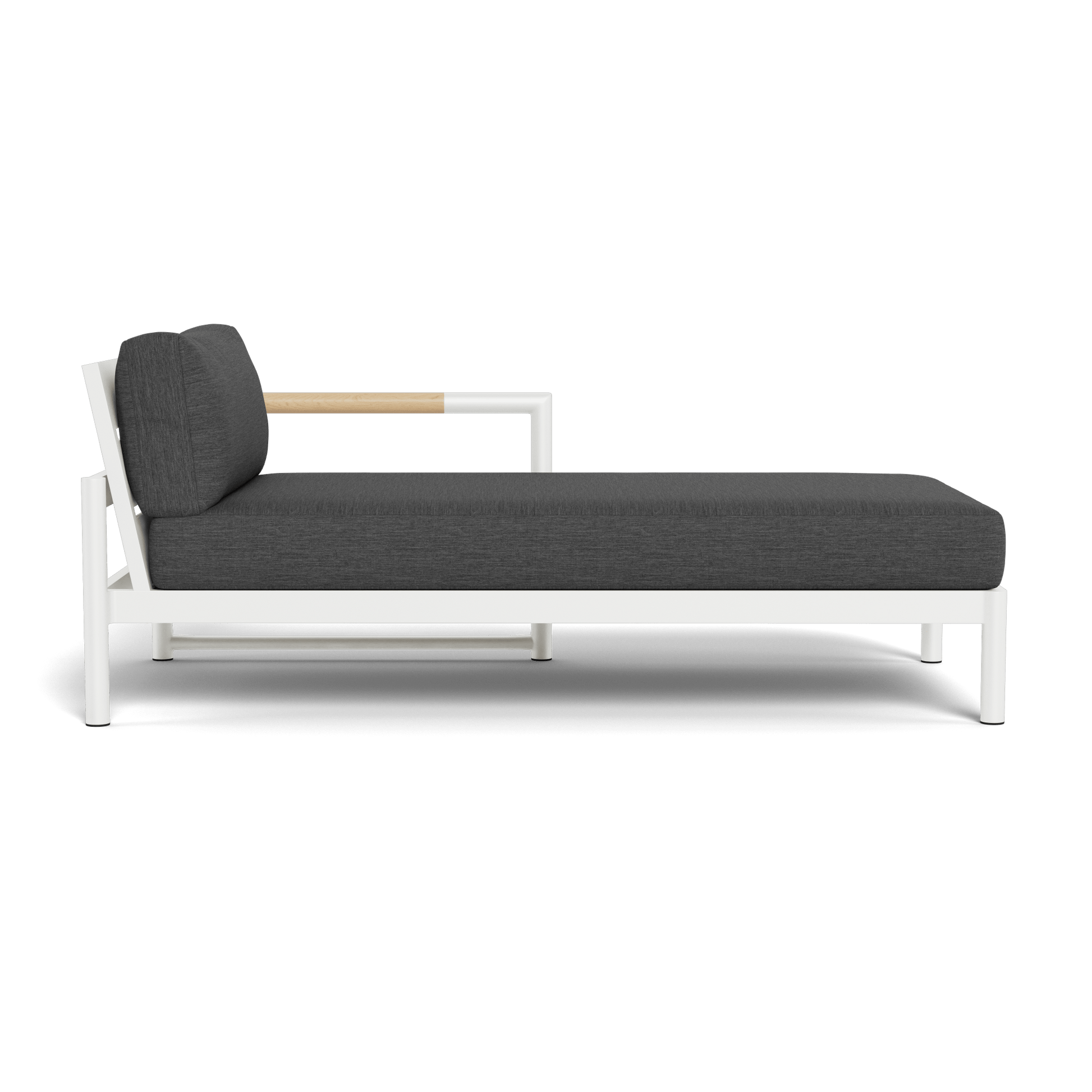 A signature Harbour collection, our Breeze XL line mixes tubular aluminum construction with solid teak accents for an alluring simplicity. Part of our sectional collection, the low–profile Breeze XL Chaise Right is modern comfort — enjoy plush cushions on a powder coated extruded aluminum frame with an aluminum slatted suspension, plus solid teak arm inlays that help cool the armrest. This elegant piece sets the tone for smaller spaces. Pair it with an opposite 2 Seat 1 Arm to create a classic L–shaped sectional.