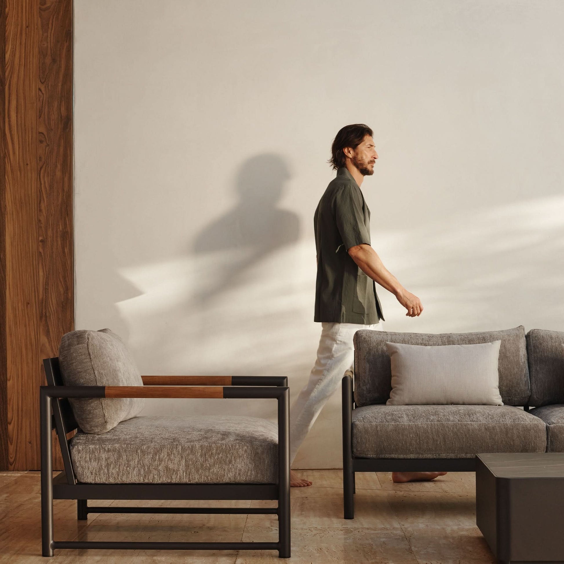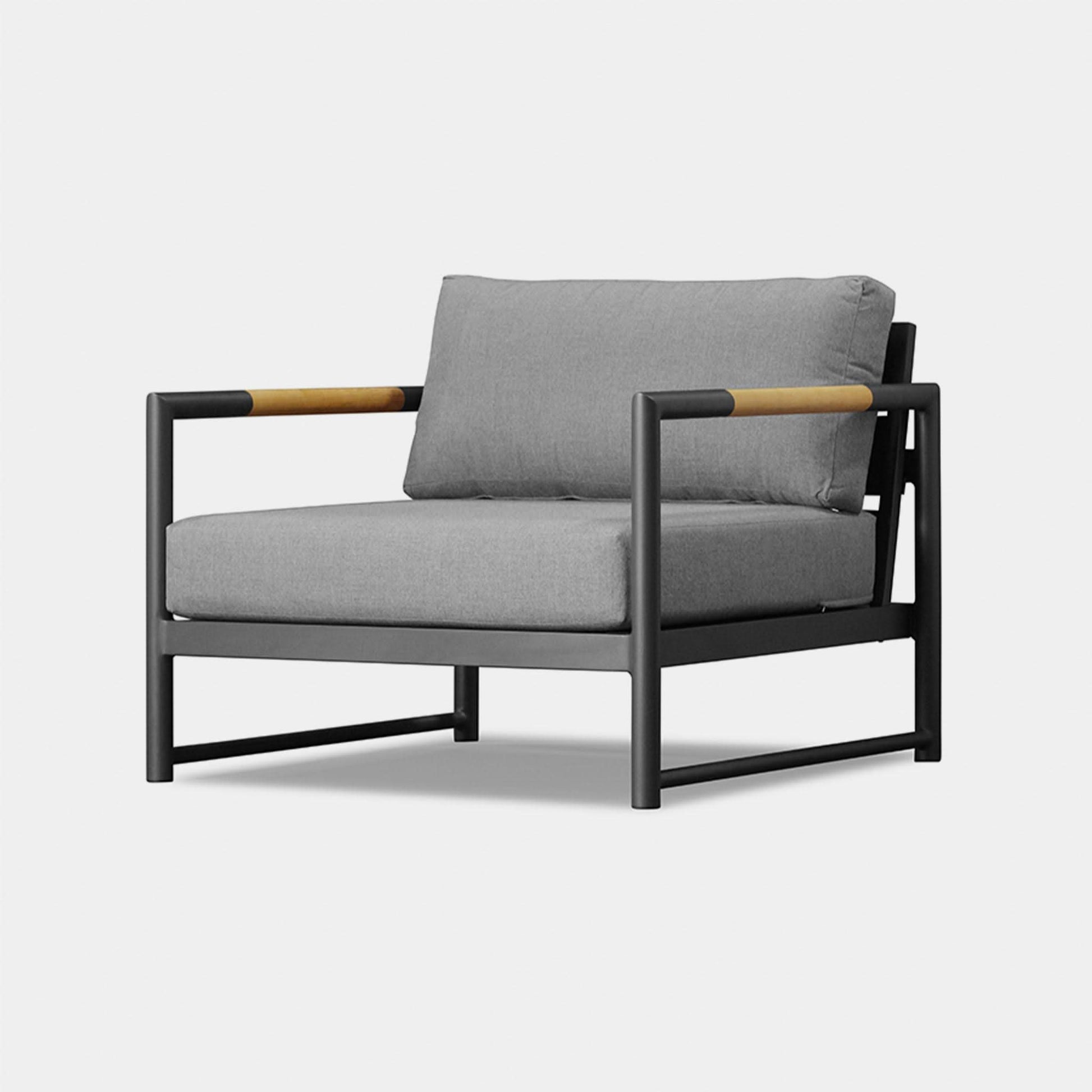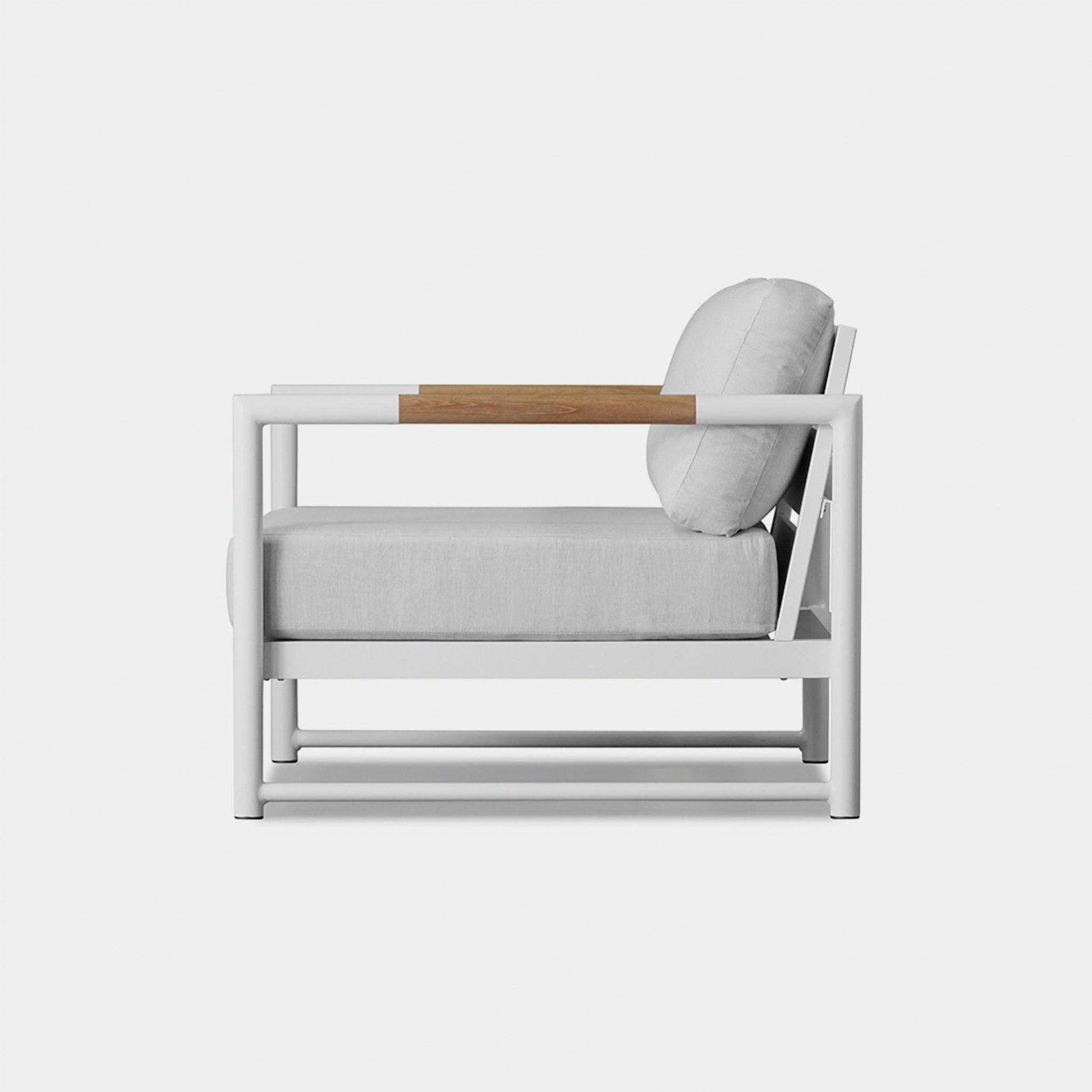 A signature Harbour collection, our Breeze XL line mixes tubular aluminum construction with solid teak accents for an alluring simplicity. The classic Breeze XL Lounge Chair is modern comfort — enjoy plush cushions on a powder coated extruded aluminum frame with an aluminum slatted suspension, plus solid teak arm inlays that help cool the armrest. This Harbour bestseller sets the tone for smaller spaces.