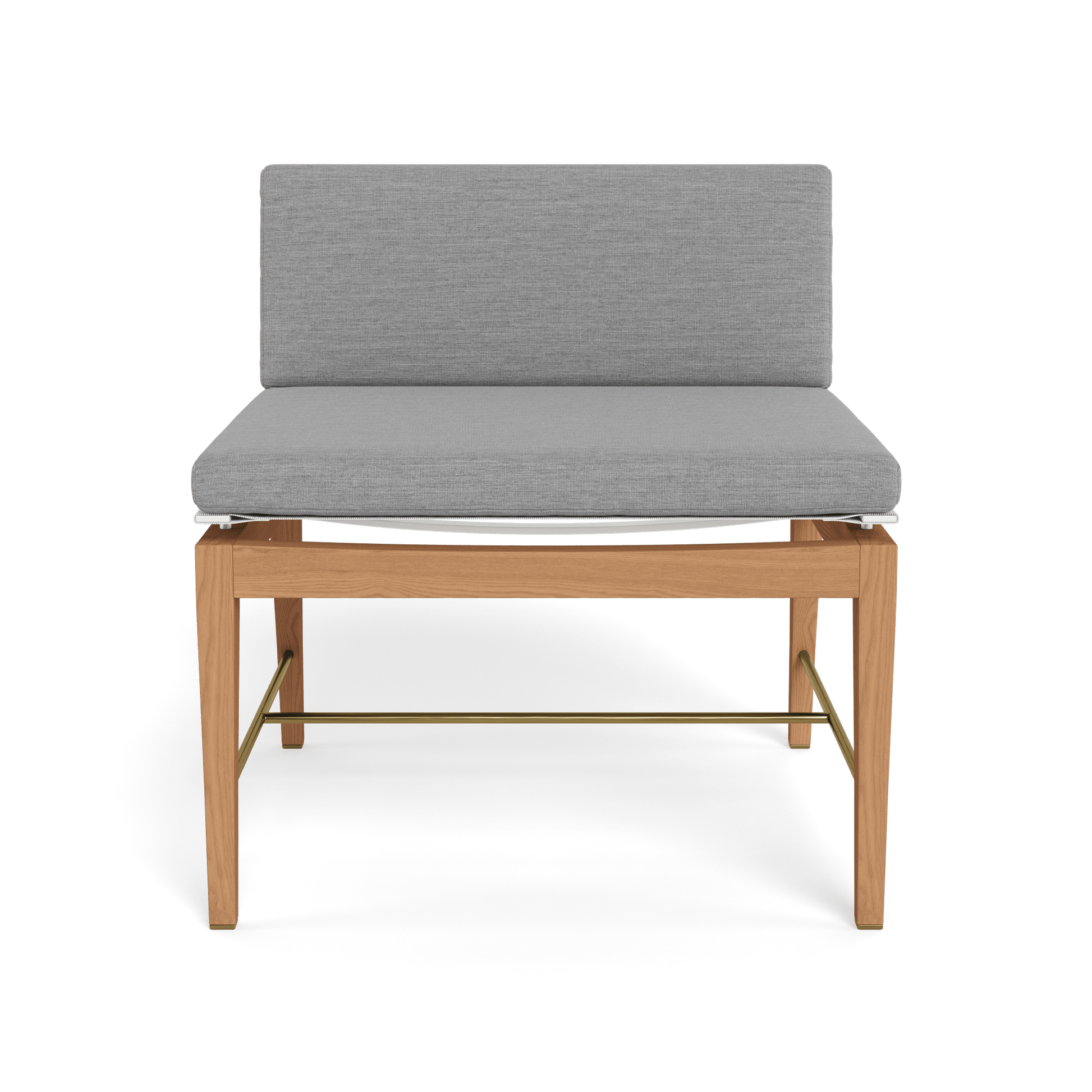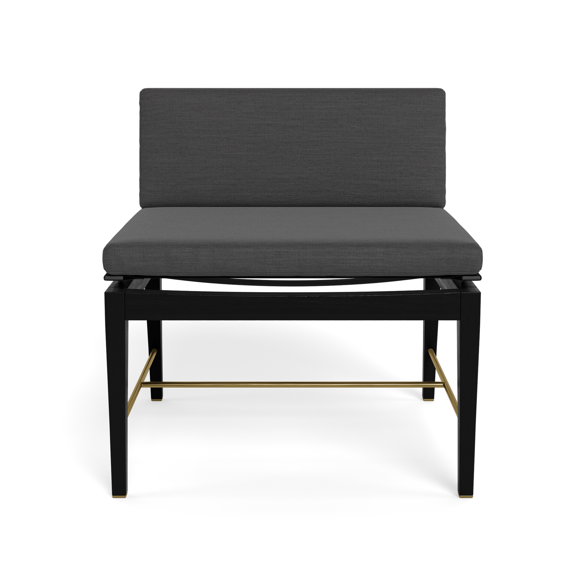 Our Byron collection blends sophisticated styling with an architectural play of angles to create exceptional design. The Byron Easy Chair was designed as the perfect outdoor seating — enjoy plush seat and back cushions supported by an all–weather Batyline sling suspension and a handcrafted solid Indonesian teak frame, though it's equally as comfortable without cushions. Brass–toned accents highlight the luxury inherent in the craft and really set this chair apart. With a subtle elegance and small footprint, this highly usable piece instantly enhances any space, especially smaller spaces like balconies, and makes great extra seating. Also available in a lounge chair.