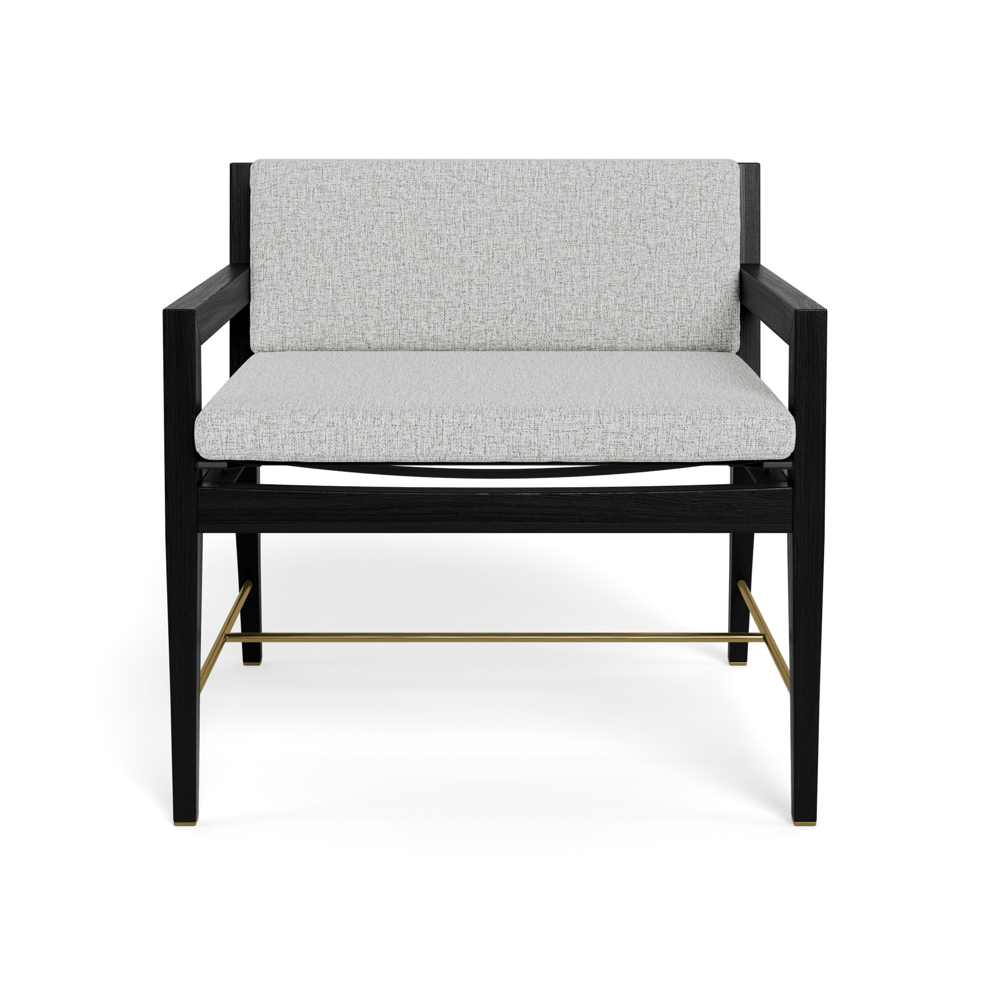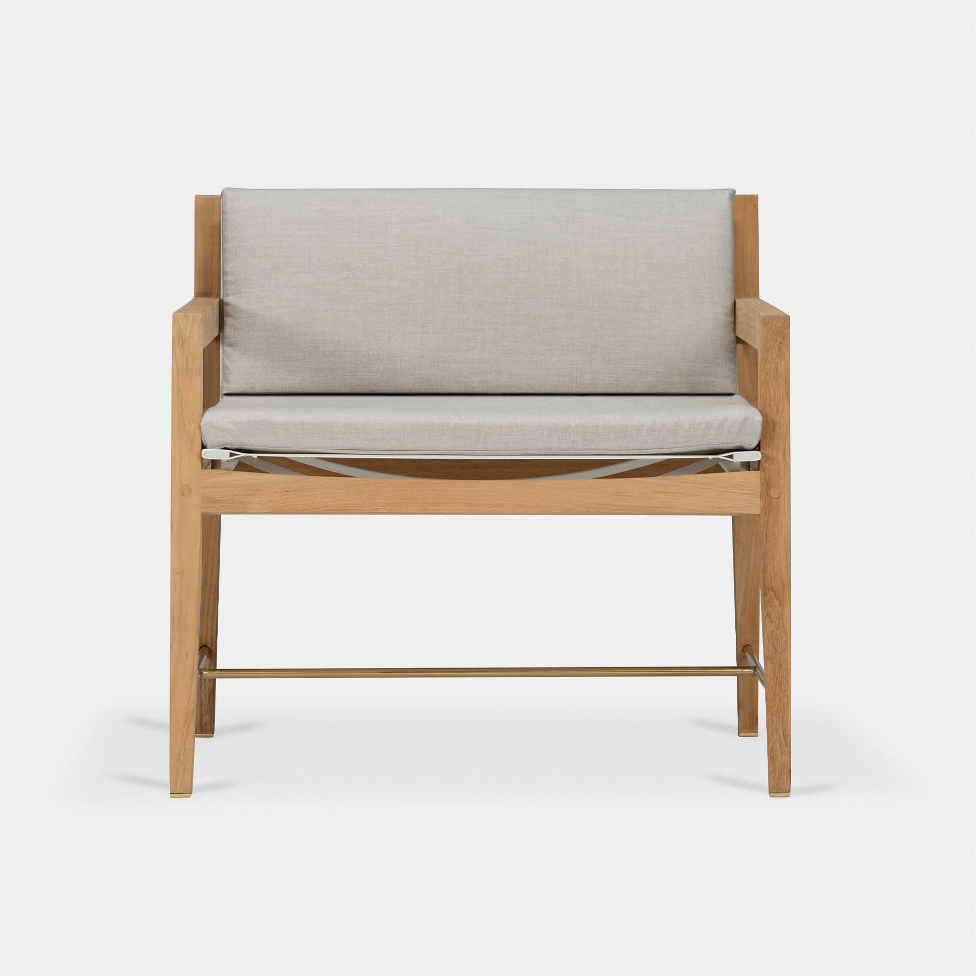 Our Byron collection blends sophisticated styling with an architectural play of angles to create exceptional design. The Byron Lounge Chair was designed as the perfect outdoor seating — enjoy plush seat and back cushions supported by an all–weather Batyline sling suspension and a handcrafted solid Indonesian teak frame, though it's equally as comfortable without cushions. Brass–toned accents highlight the luxury inherent in the craft and really set this chair apart. With a subtle elegance and small footprint, this highly usable piece instantly enhances any space, especially smaller spaces like balconies. Also available in an armless lounge chair.