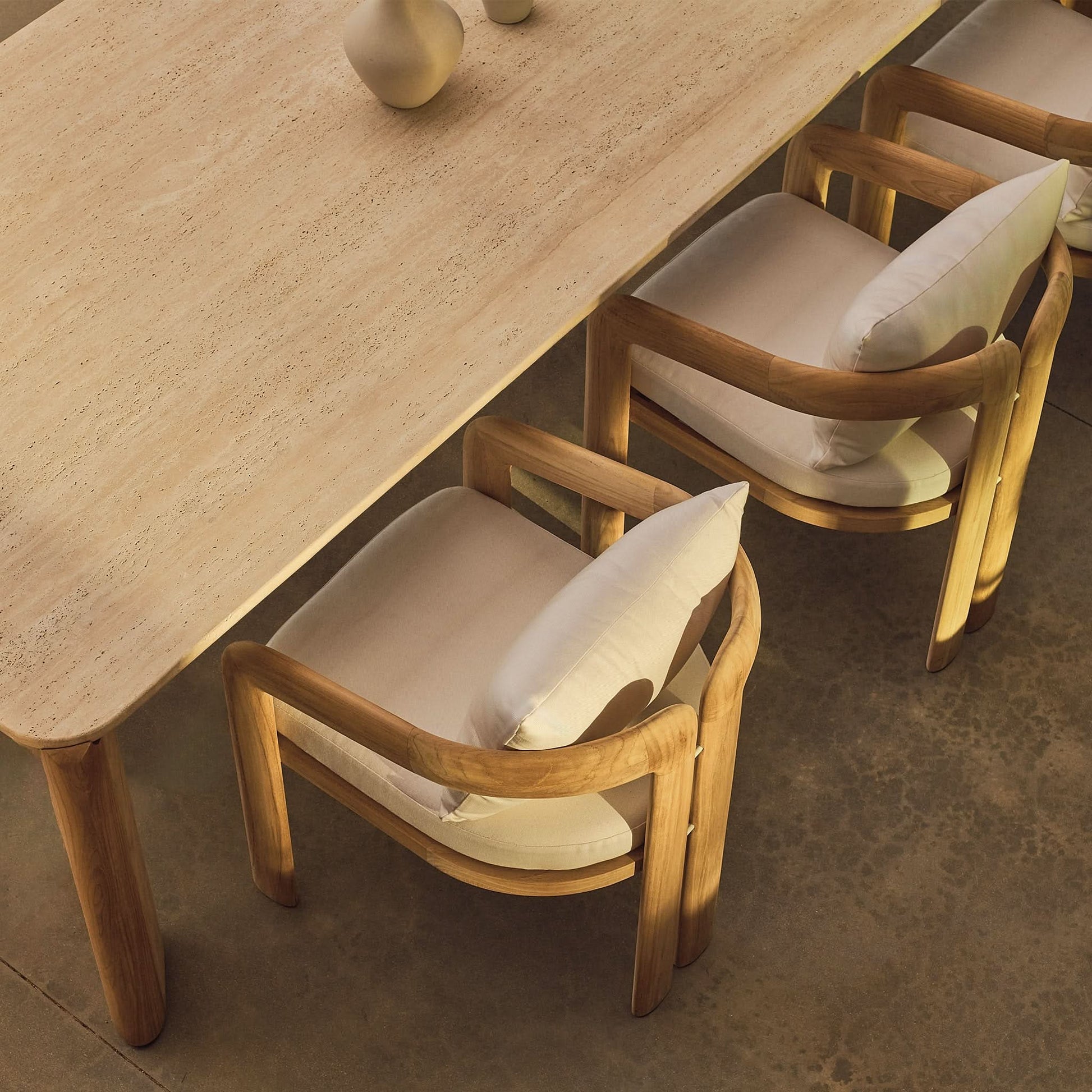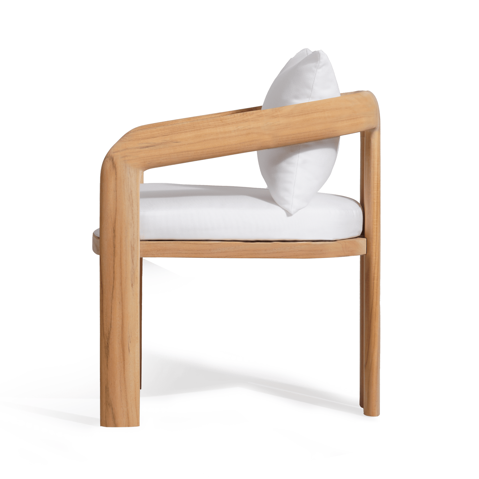 An elegant study in modern contemporary design with scale and proportion in perfect harmony. Feminine in spirit but contemporary in feel, the Chloe Dining Chair is a sophisticated and inviting piece—enjoy a sink–in seat cushion with a knife–edge pillows atop a slatted suspension, all supported by a uniquely curved solid teak frame. Almond–shaped armrests slope upward, while the legs double up in homage to a tripod style for visual interest. A truly beautiful piece of craftsmanship, this outdoor sofa instantly elevates any space.