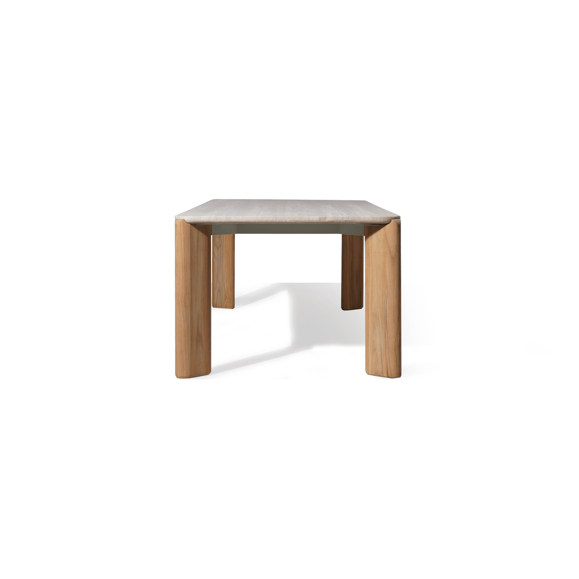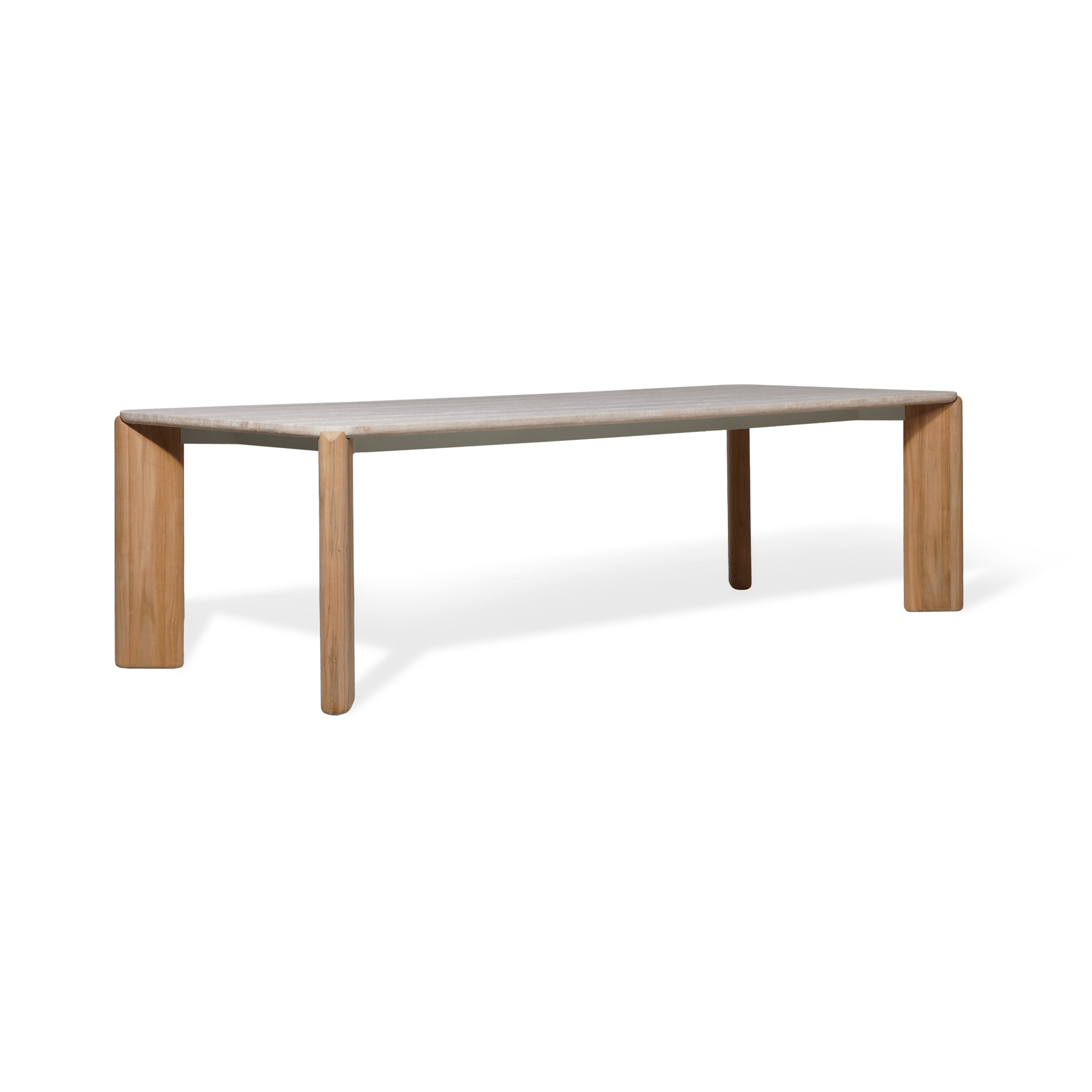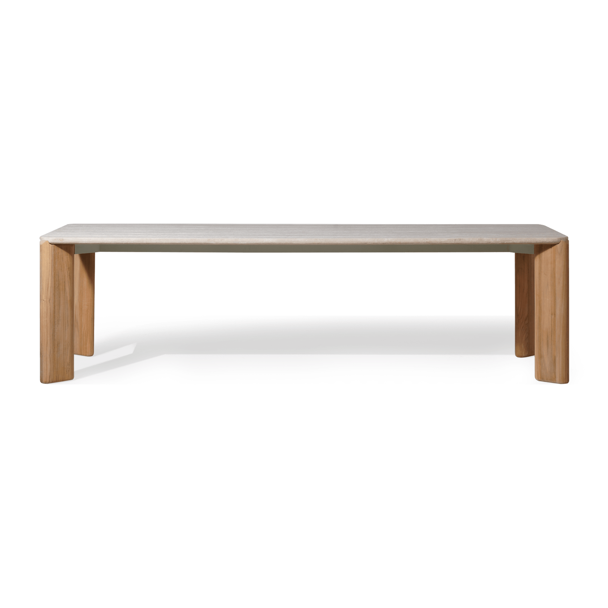 An elegant study in modern contemporary design with scale and proportion in perfect harmony. Feminine in spirit but contemporary in feel, the Chloe Rectangle Dining Table is a sophisticated and subtle piece—crafted in solid teak with a travertine top with a reverse rounded demi–bullnose design, it features the collection’s signature frame shape with subtle curves. The top showcases a soft rectangle design, lacking right angles and bulging slightly between the ends. With mixed materials creating a luxe and versatile design, this outdoor dining table easily seats eight and complements a range of styles. Complete your outdoor dining set with the matching dining chairs.
