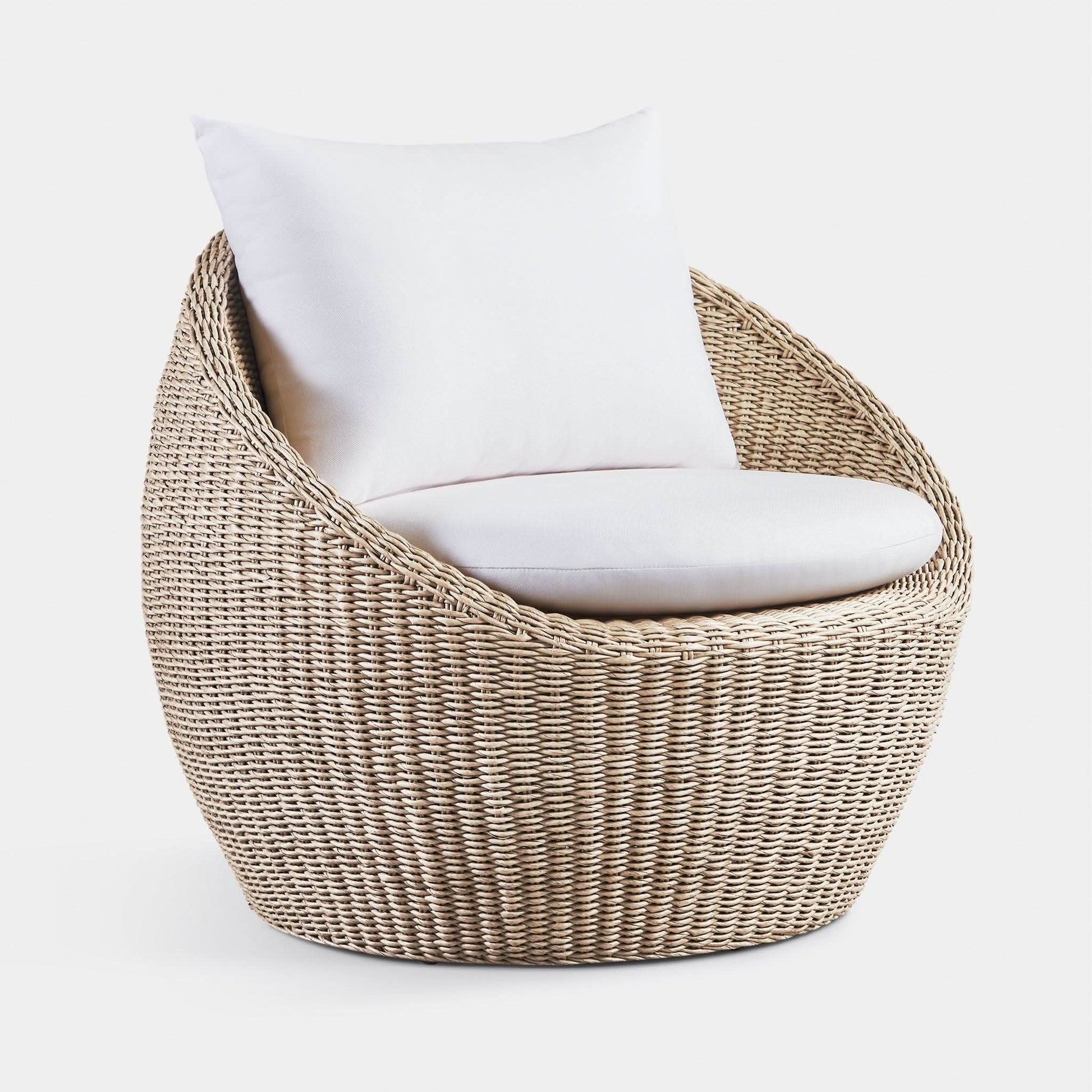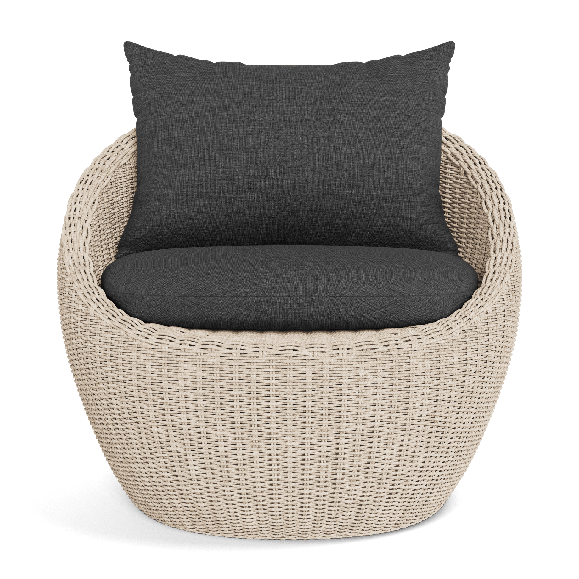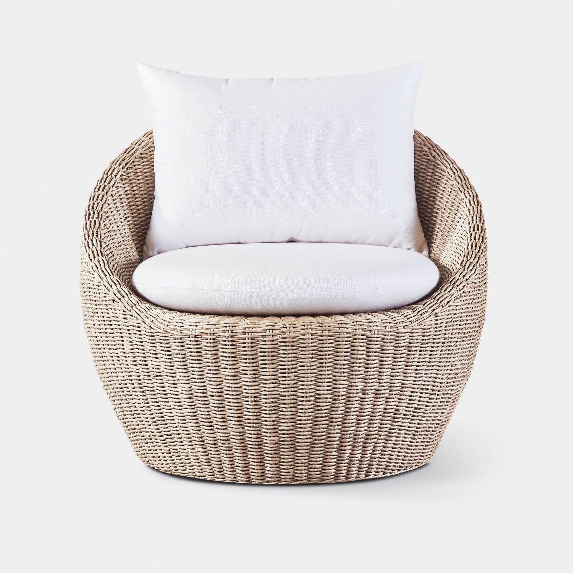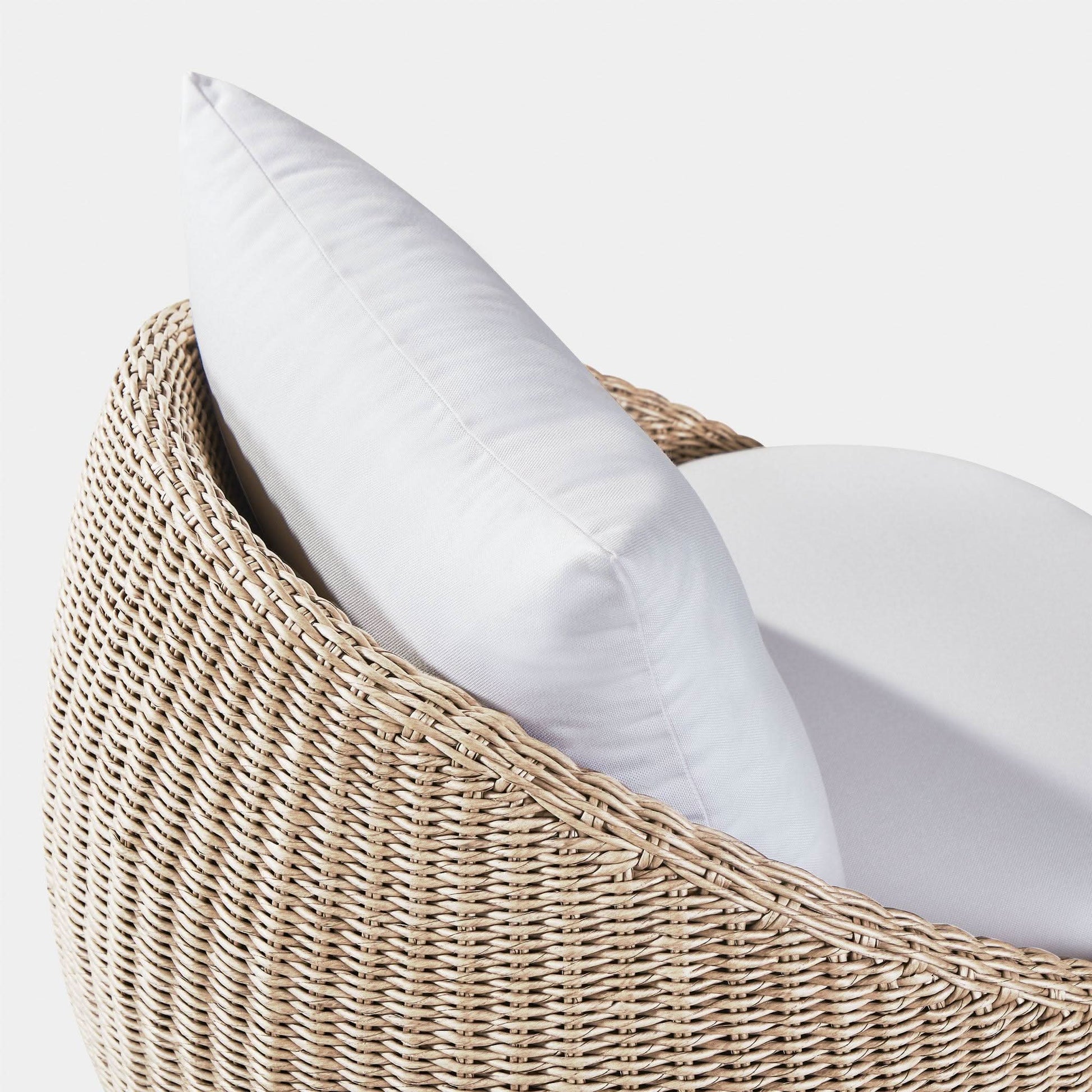Sculptural rounded shapes in sandy hues echo the architecture of Spain’s sun–drenched Cordoba region and make a big impression — with a petit profile made for smaller spaces. The Cordoba Lounge Chair brings texture and style to the outdoors — enjoy a round cushion supported with a knife–edge back cushion on an all–weather twisted resin frame woven to look like banana leaf and bleached in an oyster hue. Created with a small footprint for balconies and apartments, this chair expands the design possibilities for any space.