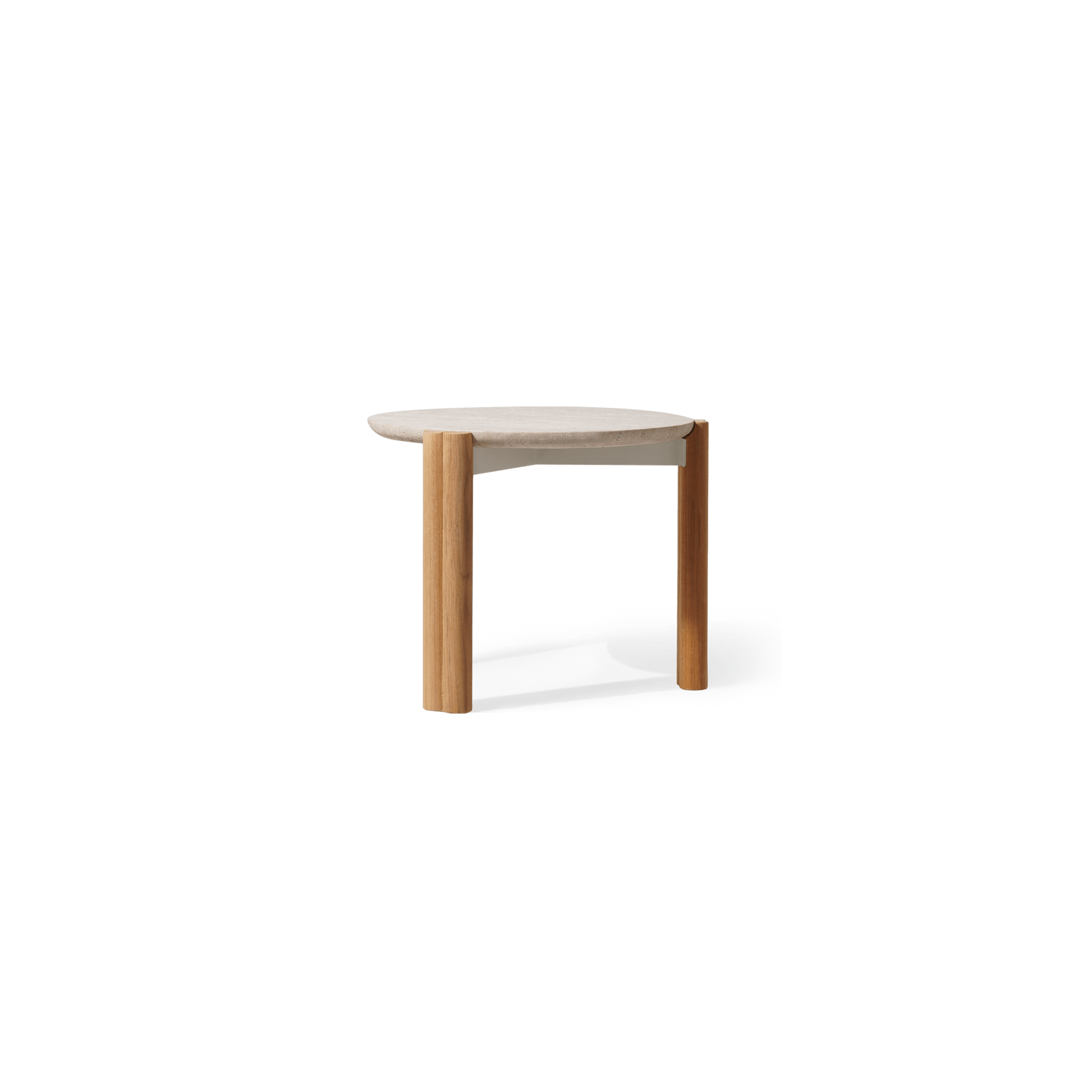 Influenced by modern Australian architecture and landscapes, our Cove Teak collection features special details like double cylindrical legs and curved edges that create soft sculptural silhouettes. The mixed material Cove Teak Side Table completes your outdoor seating set, featuring a solid Indonesian teak frame with an architectural double leg detail suspending an organic travertine stone top. A classic round side table, this piece is built for outdoor living by the pool or in nature.