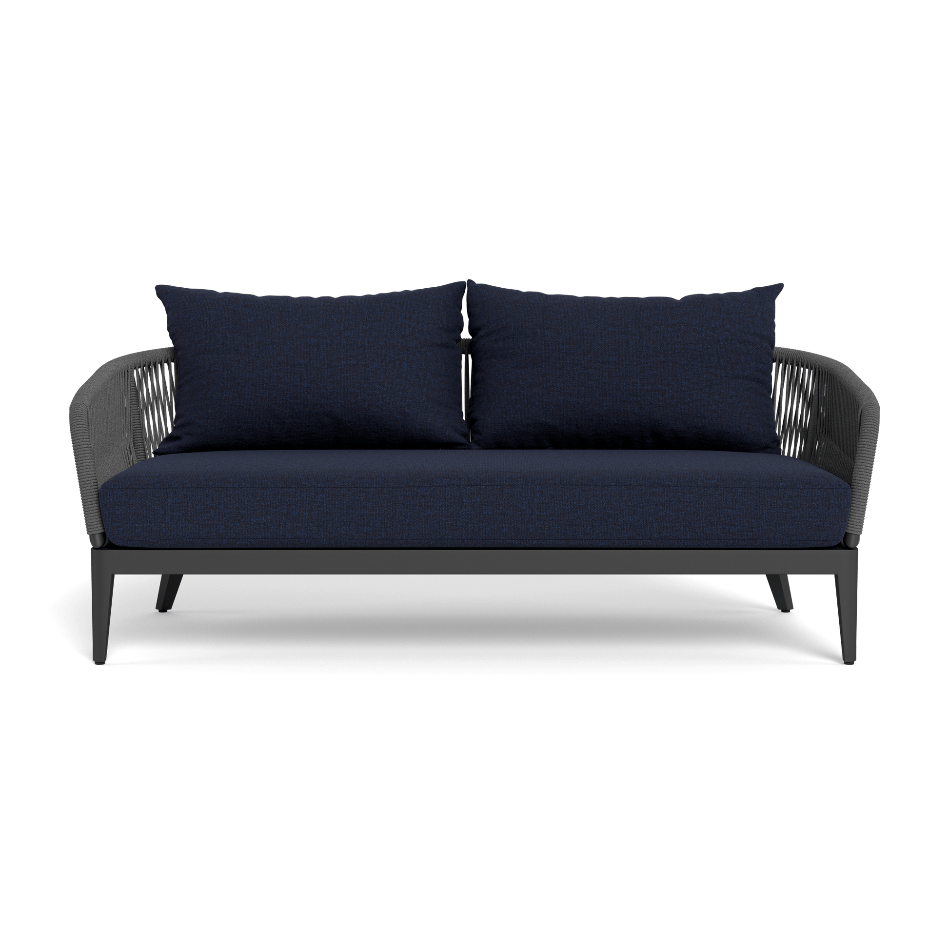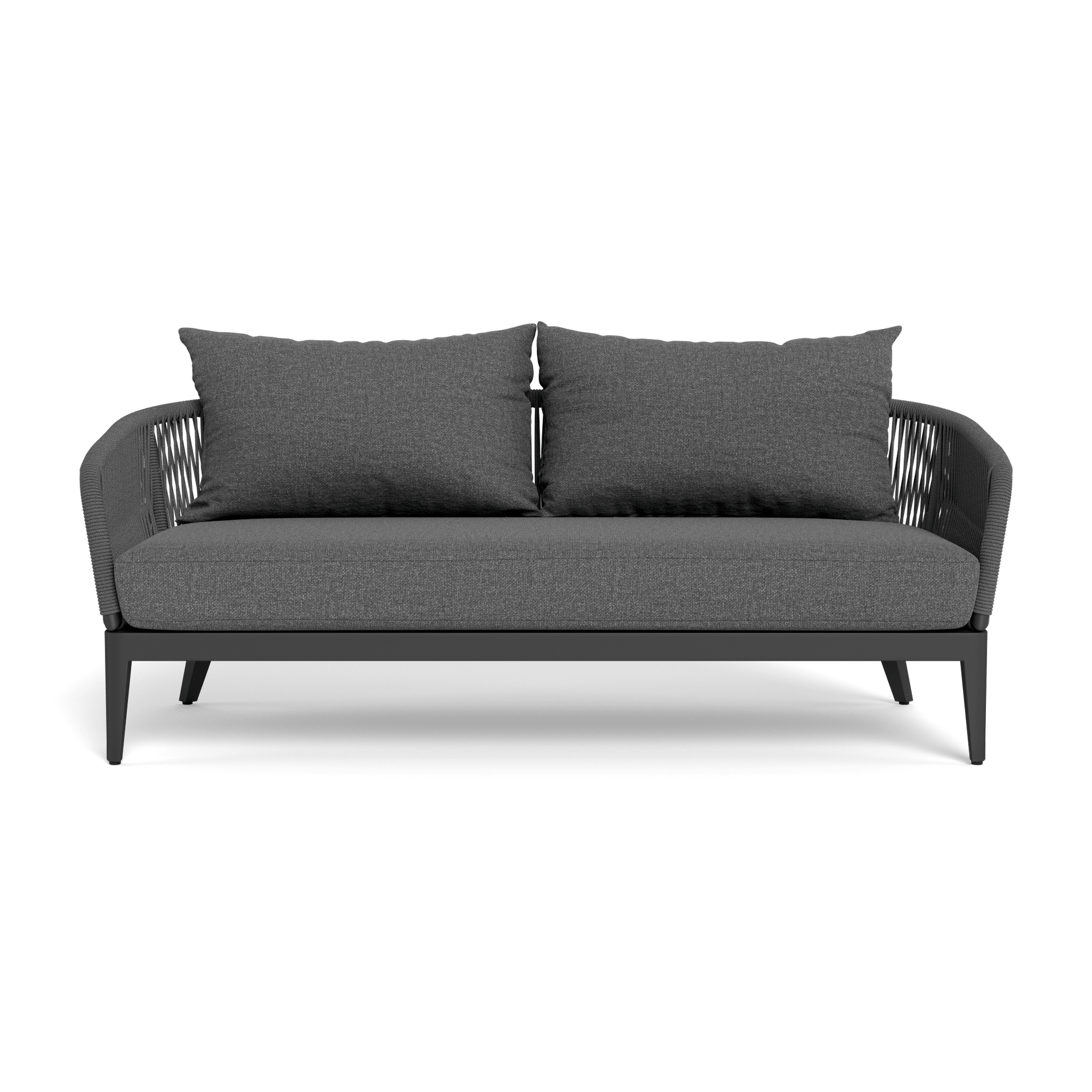 Our Hamilton collection pairs clean lines with practical design. The Hamilton 2 Seat Sofa is contemporary comfort — featuring an extruded aluminum frame in Asteroid or Taupe with tapered legs, sculptural back rest contours and double–layered woven Olefin rope accents in Dark or Light Grey. Enjoy a plush all–weather bench cushion with knife–edge back cushions available in a range of neutral tones for total comfort. This effortless contemporary sofa is made to be incredibly versatile, elevating any outdoor space.