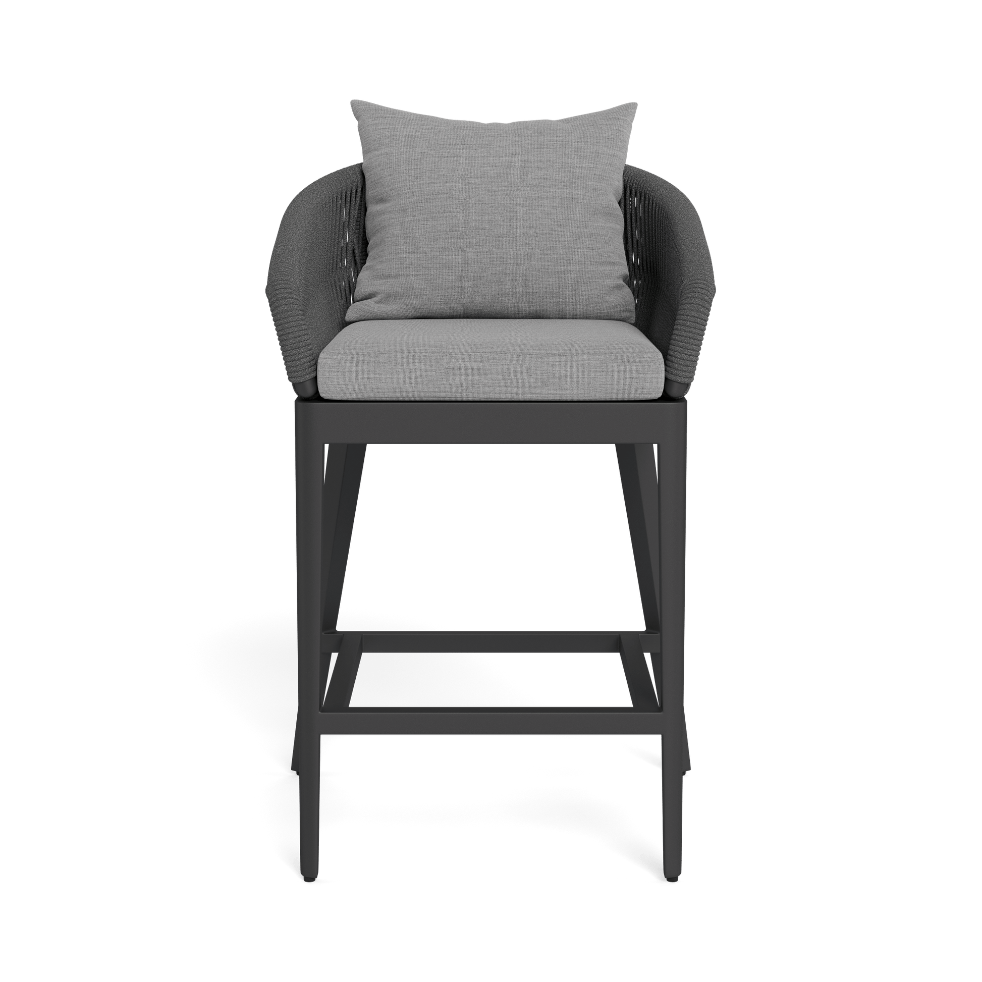 Our Hamilton collection pairs clean lines with practical design. The Hamilton Counter Stool was designed as the perfect everyday seat for counter spaces — enjoy an extruded aluminum base in Asteroid or Taupe with tapered legs, a sculptural contoured back rest and double–layered woven Olefin rope accents in Dark or Light Grey. Enjoy a pair of plush all–weather seat and back cushions available in a range of neutral tones for added comfort. This effortless contemporary counter–height stool is made to be incredibly versatile, elevating any outdoor space.