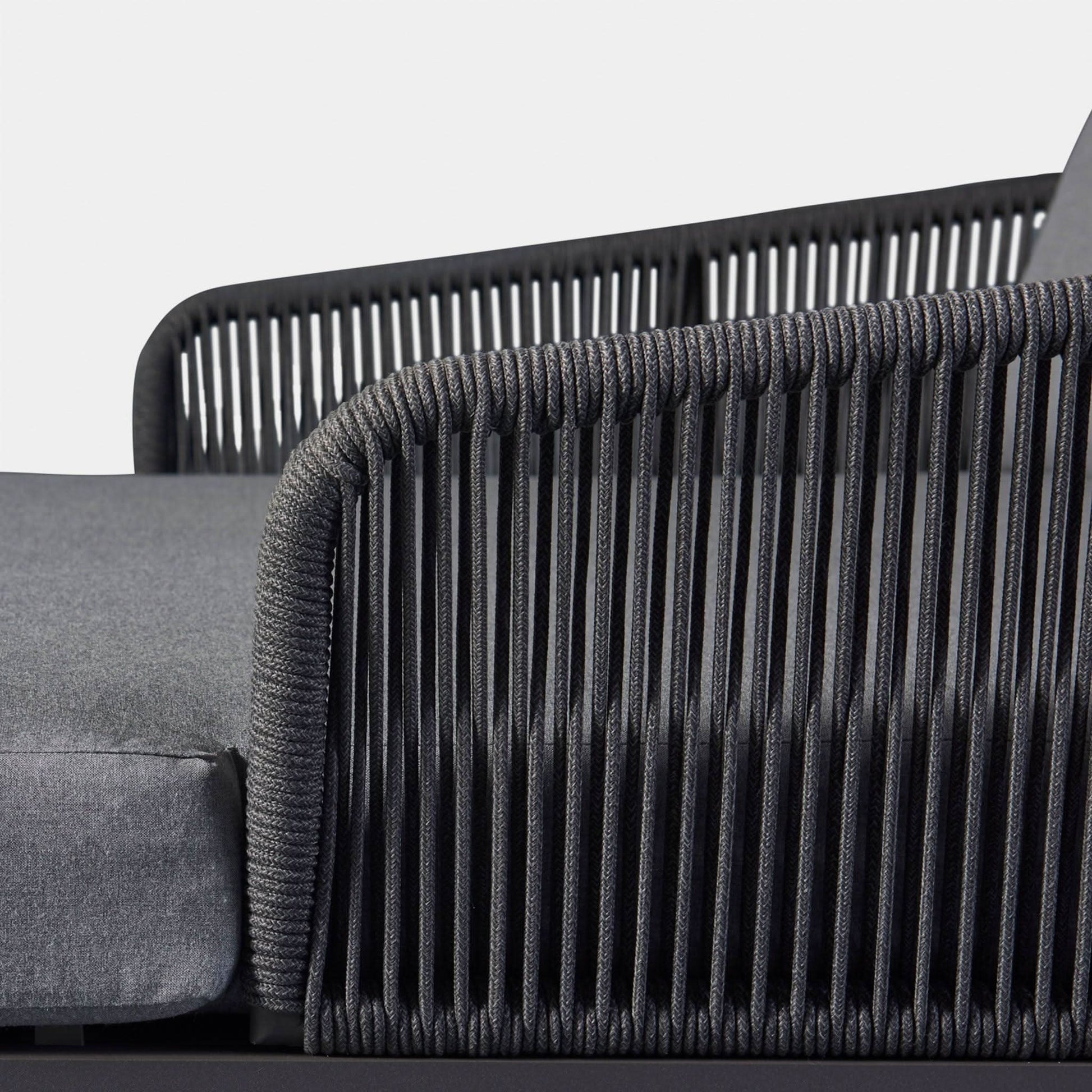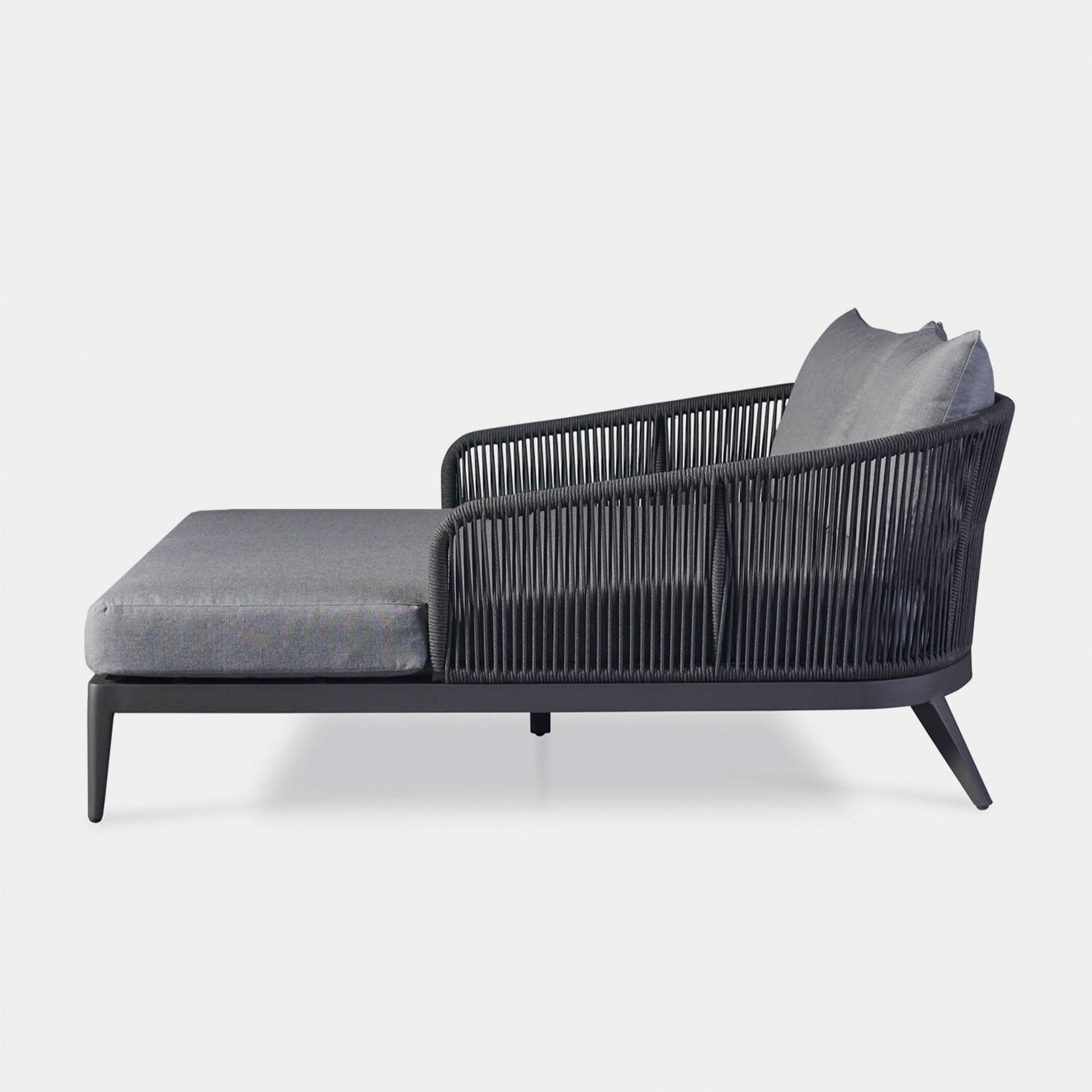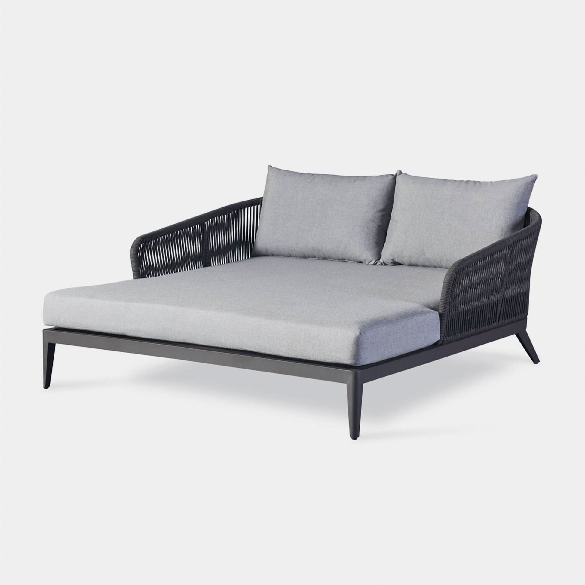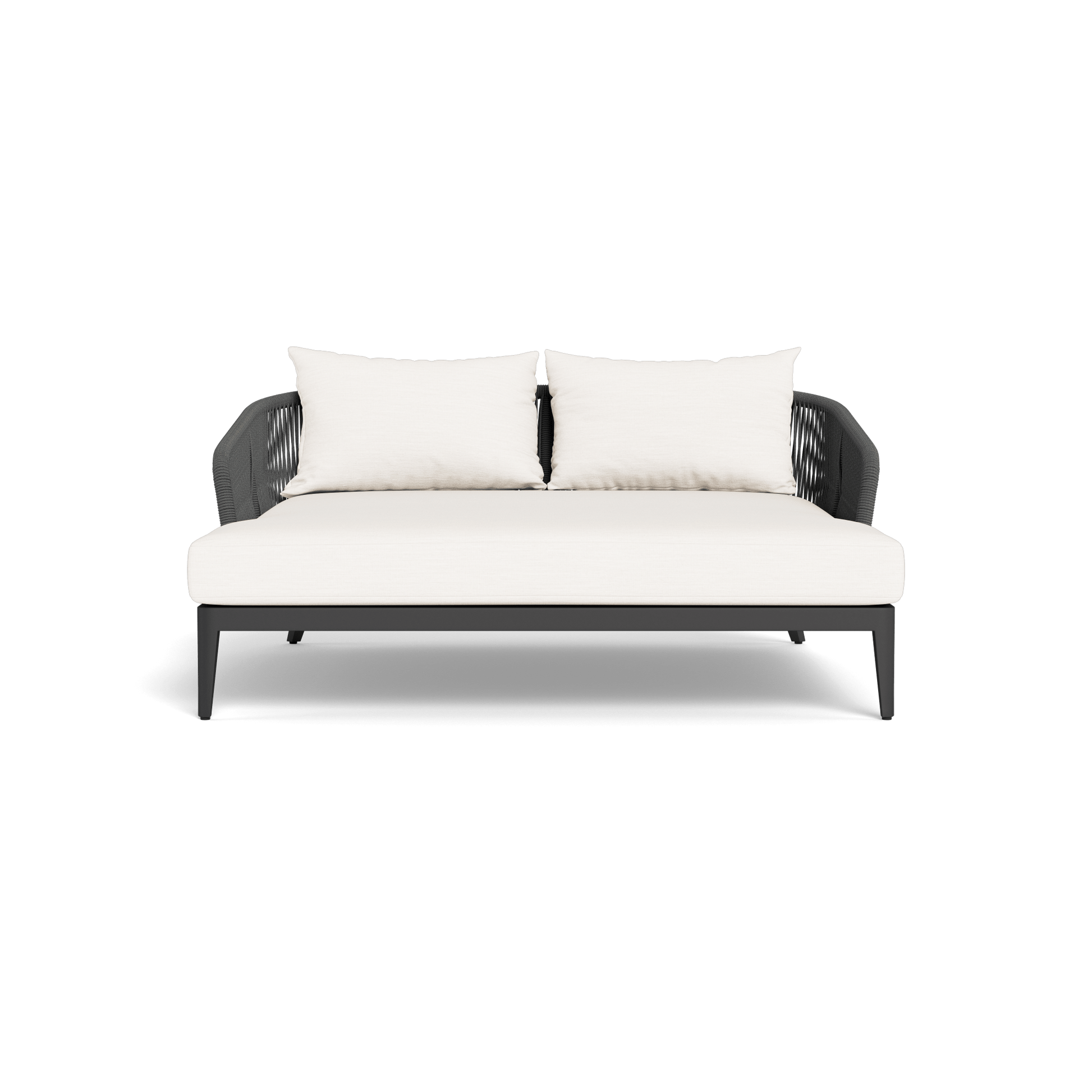 Our Hamilton collection pairs clean lines with practical design. The Hamilton Daybed is a relaxing escape — featuring an extruded aluminum frame in Asteroid or Taupe with tapered legs, sculptural back rest contours and double–layered woven Olefin rope accents in Dark or Light Grey. Lounge on a plush all–weather bench cushion with knife–edge back cushions available in a range of neutral tones for total comfort. Generous enough in size to host multiple people, this effortless contemporary outdoor daybed is made to be incredibly versatile, elevating any patio or poolside space.