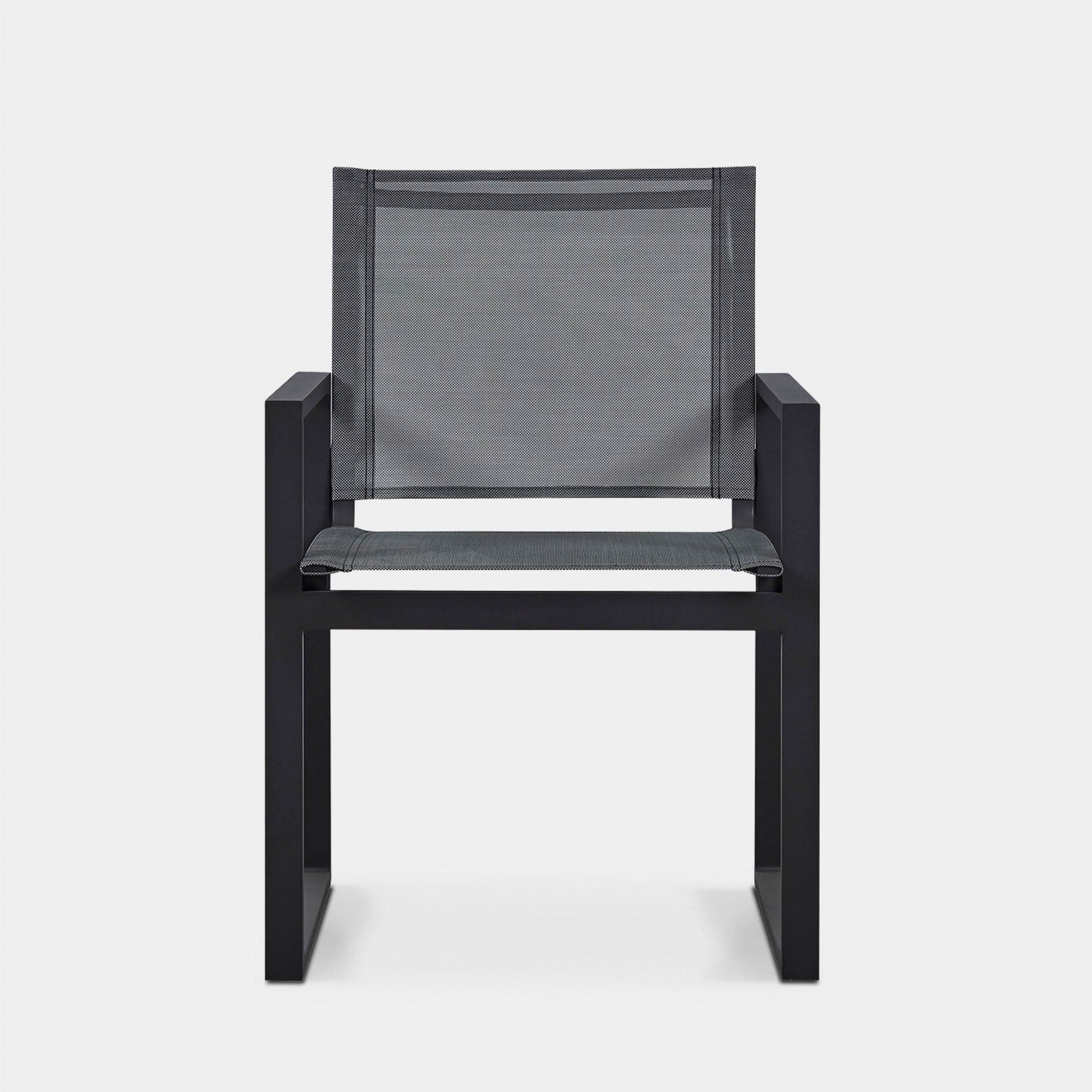 Our Hayman collection is a statement in simplicity with clean angles and modern styling. Our Hayman Dining Chair was designed as the perfect everyday seat — enjoy a simple, modern chair with an aluminum extrusion frame available in Asteroid of White supported by a Batyline sling suspension in Silver or White for added comfort and easy cleaning. Indoor–inspired comfort meets outdoor performance with this modern dining chair made for a variety of spaces. Pair it with any Hayman dining table to complete the outdoor dining set.