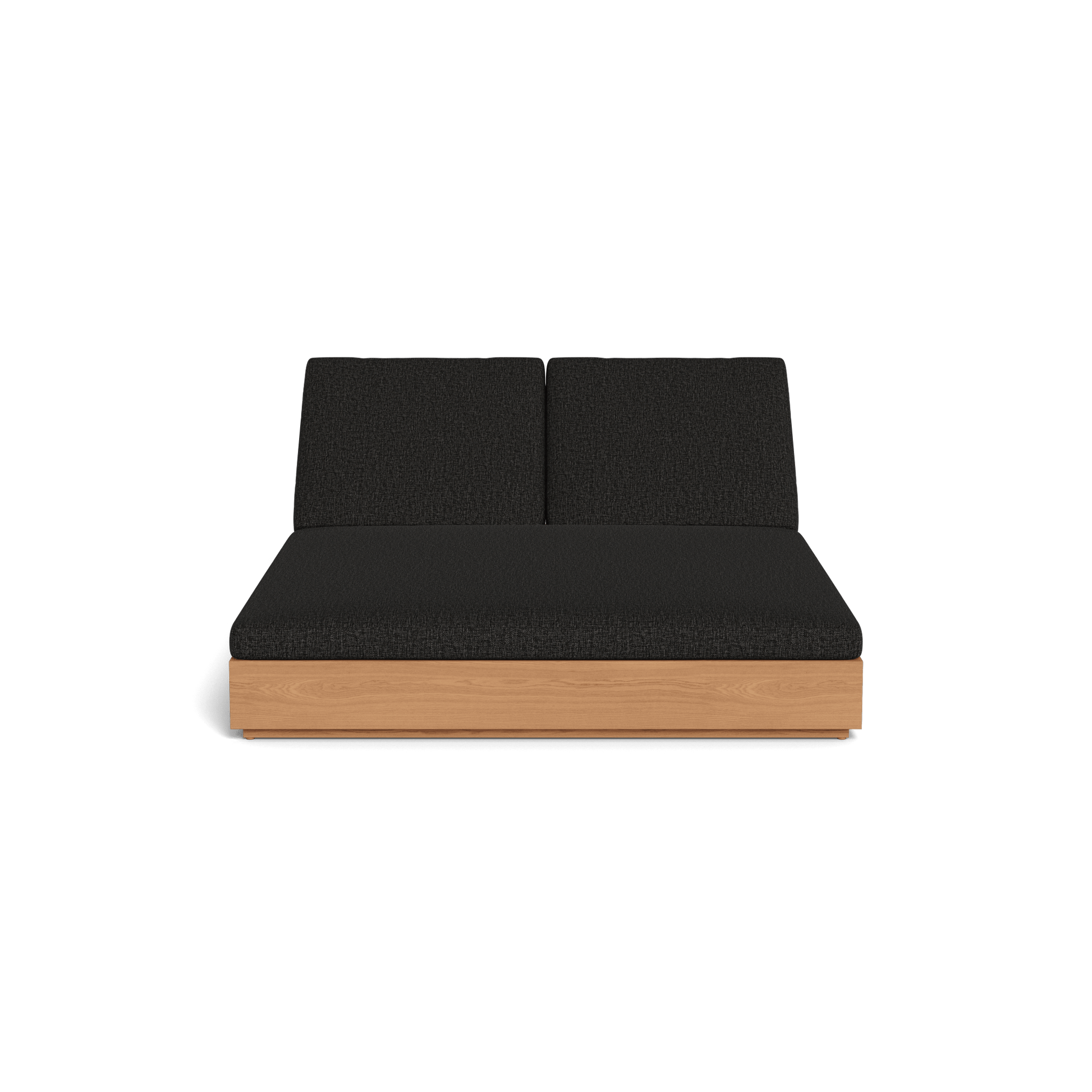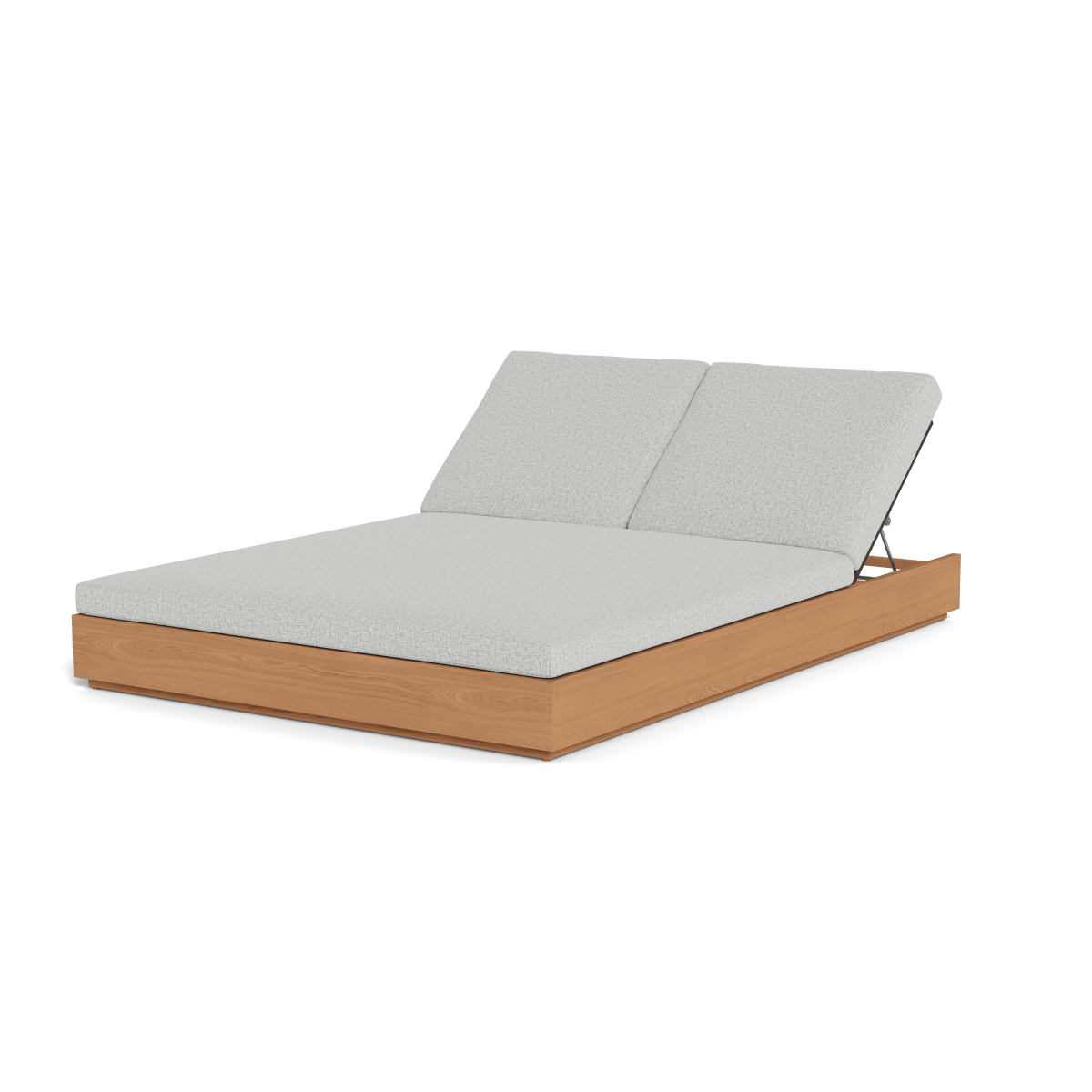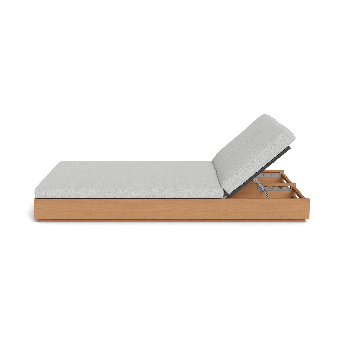Our Hayman collection is a statement in simplicity with clean angles and modern styling. Our low–profile Hayman Teak Double Sun Lounge was designed to be experienced — sink into ultimate relaxation with a plush hinged cushion for two supported by a Batyline sling suspension in White for added comfort, all floating on a squared solid natural teak base. Indoor comfort meets outdoor performance with this modern double sun lounge made for patio and pool spaces. Separate adjustable backs allow for varied settings simultaneously.