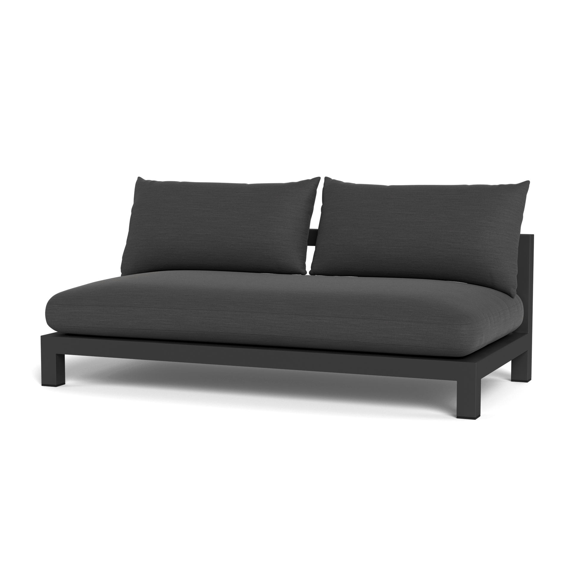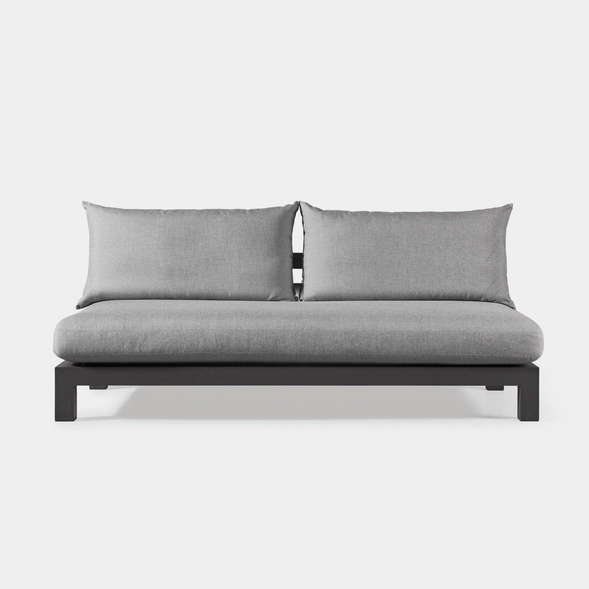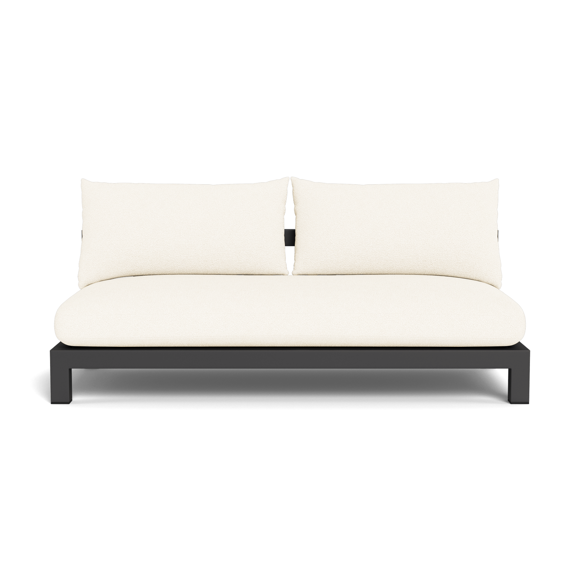 Our Pacific Aluminum collection features clean lines with a California rustic essence. Part of our sectional collection, the Pacific Aluminum 2 Seat Armless Sofa is streamlined comfort — elax on a plush domed bench cushion with a pair of knife-edge back cushions available in a range of neutral tones and supported by a Batyline sling suspension in Silver or White for added comfort. Handcrafted from powder coated extruded aluminum in White, Taupe or Asteroid, this modern sofa effortlessly fits in any smaller outdoor space. Use it as a stand-alone element, or pair it with a Corner to extend it as a sectional sofa.