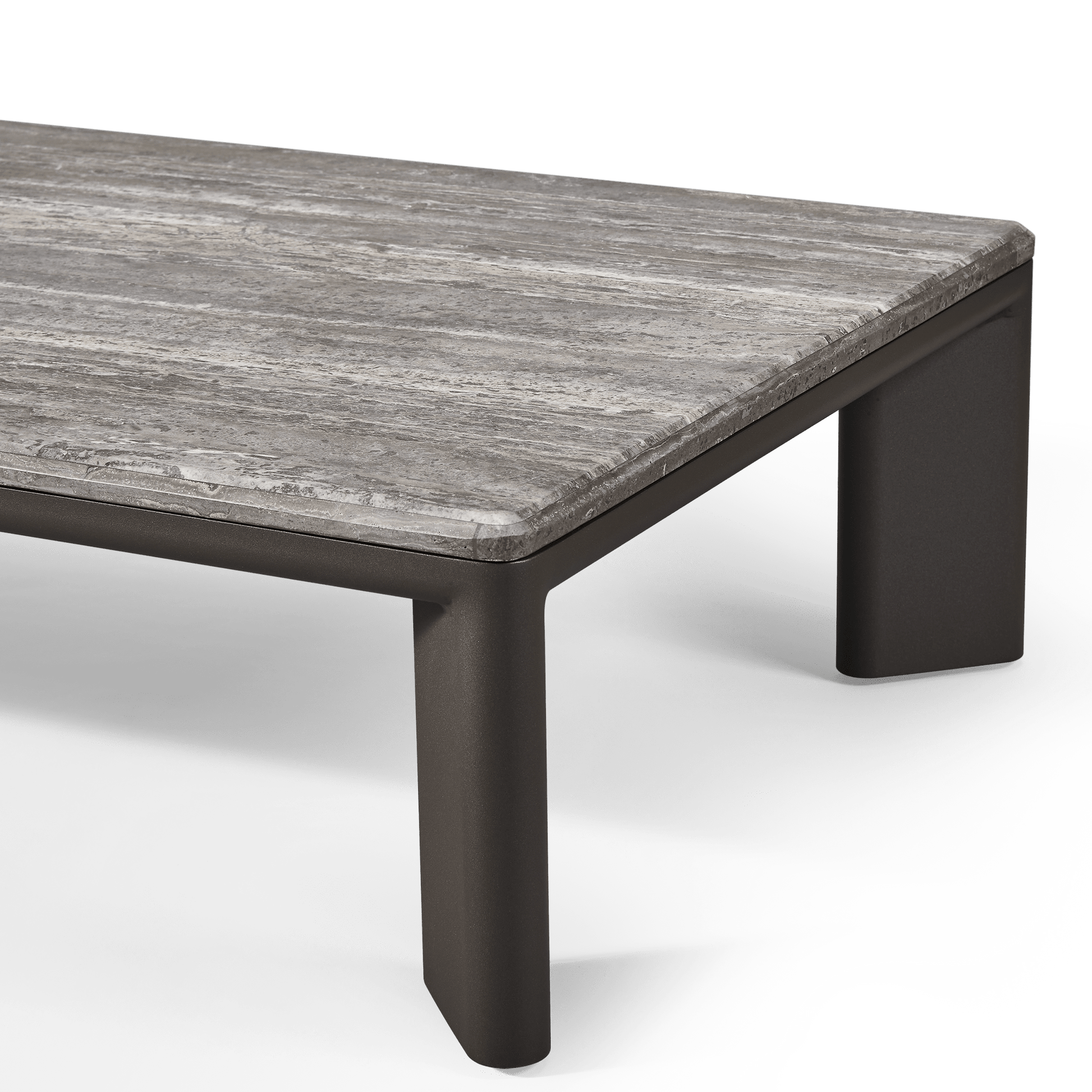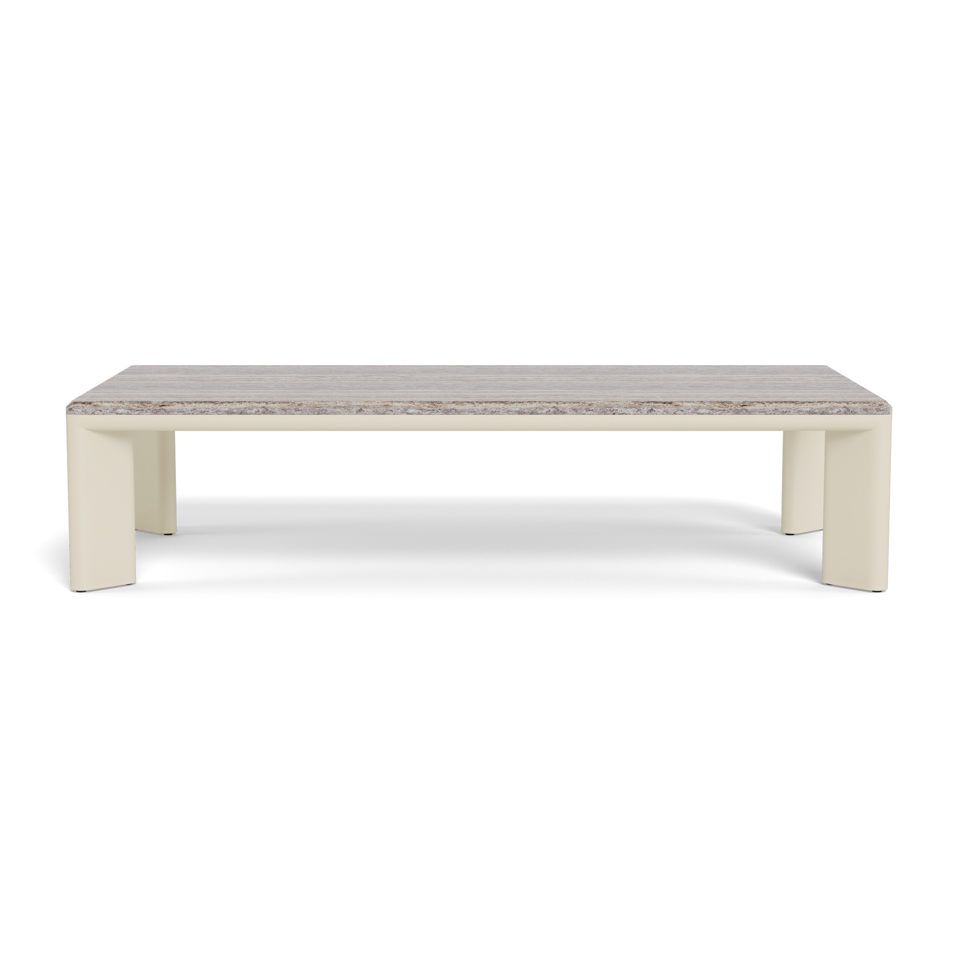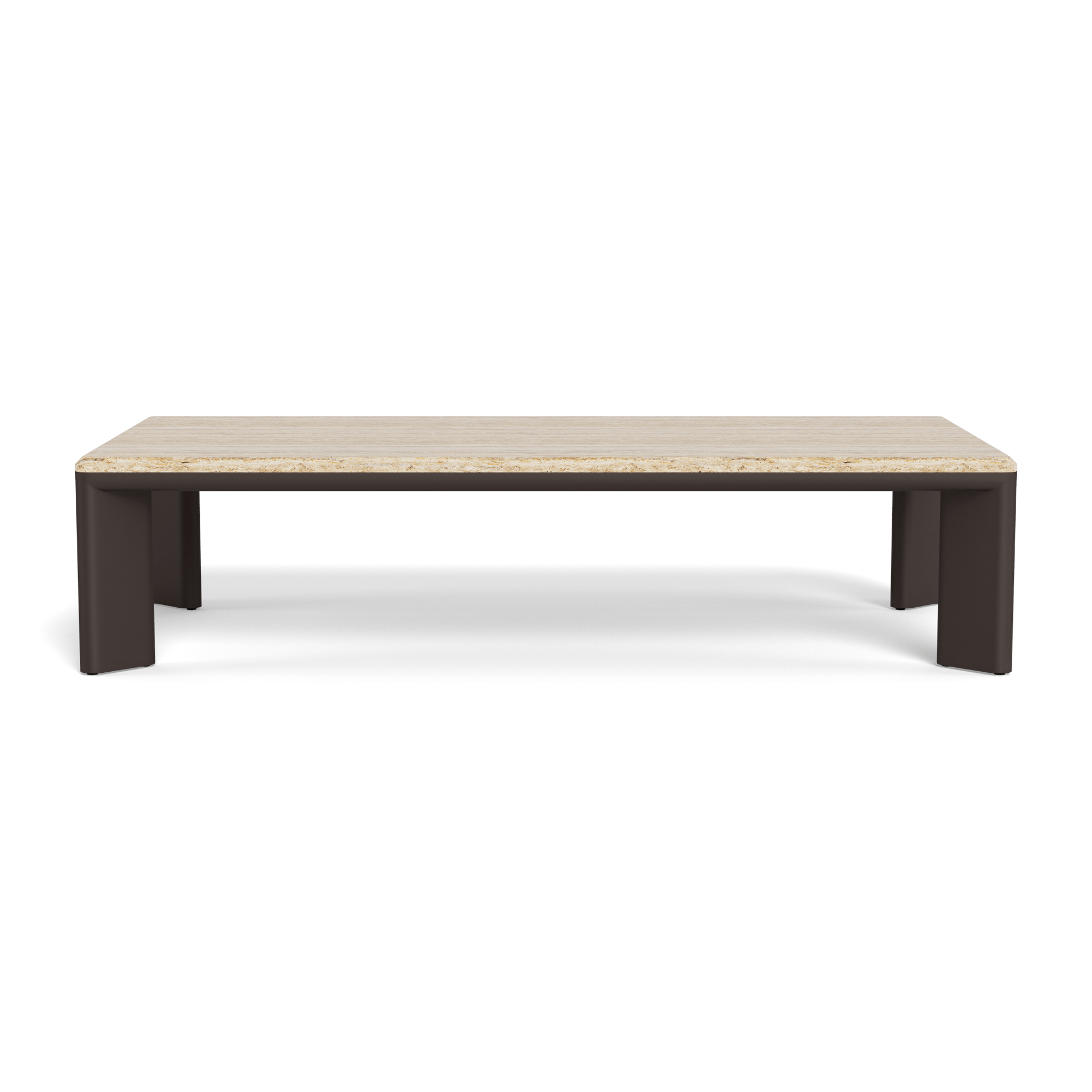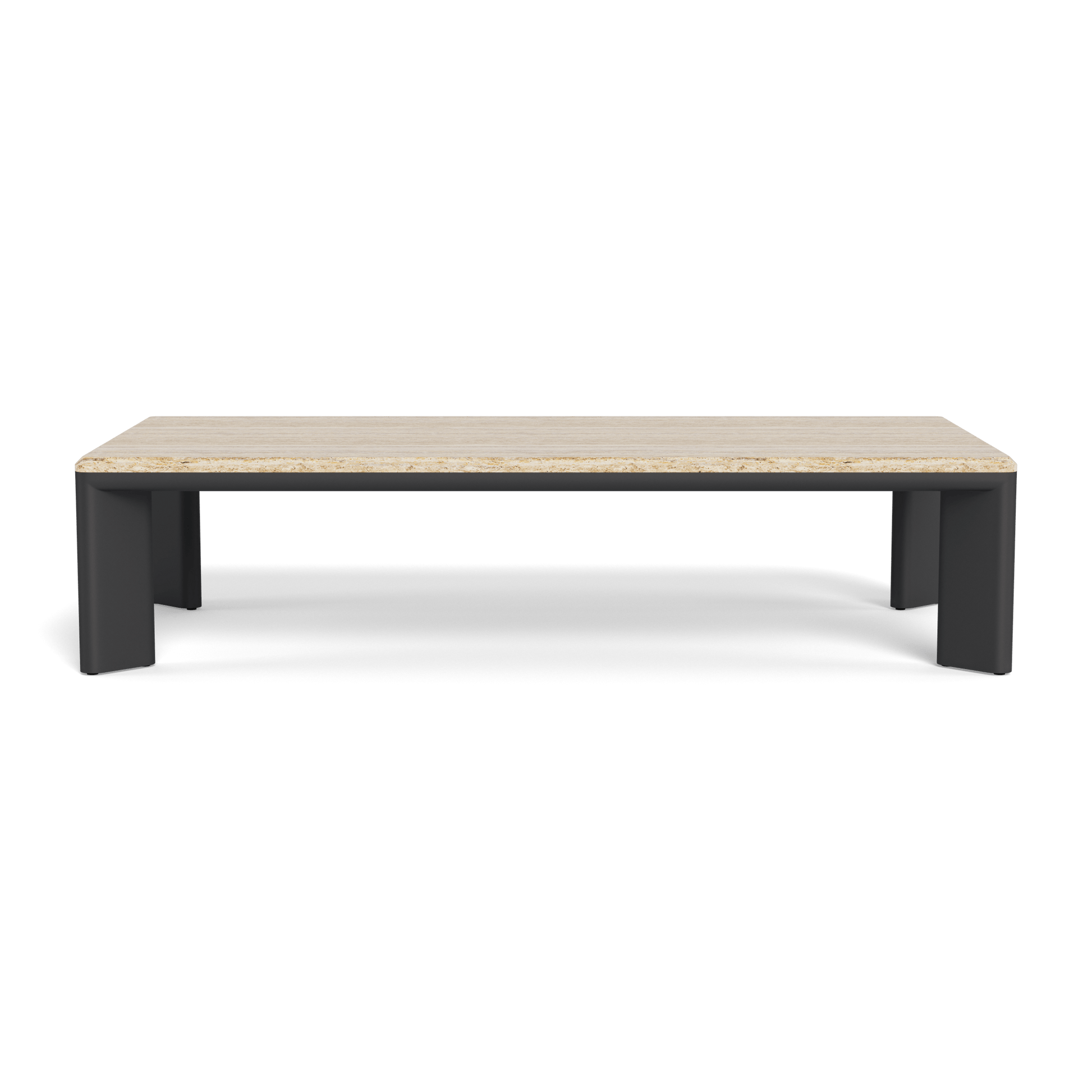 A nod to Sydney's iconic Palm Beach with its stately coastal pines. Rounded backs, vertical rope detailing and a harmonious mix of materials infuse classic silhouettes with modern elegance. Transitional in spirit, the Palm Beach Aluminum Rectangle Coffee Table is a refreshing update to our signature classics—a Parsons-style table crafted in solid teak, angled legs support a travertine top and spotlight a simple, but very thoughtfully connected, design. With mixed materials creating a luxe and dimensional design, this outdoor coffee table is perfect for entertaining and complements a range of styles.