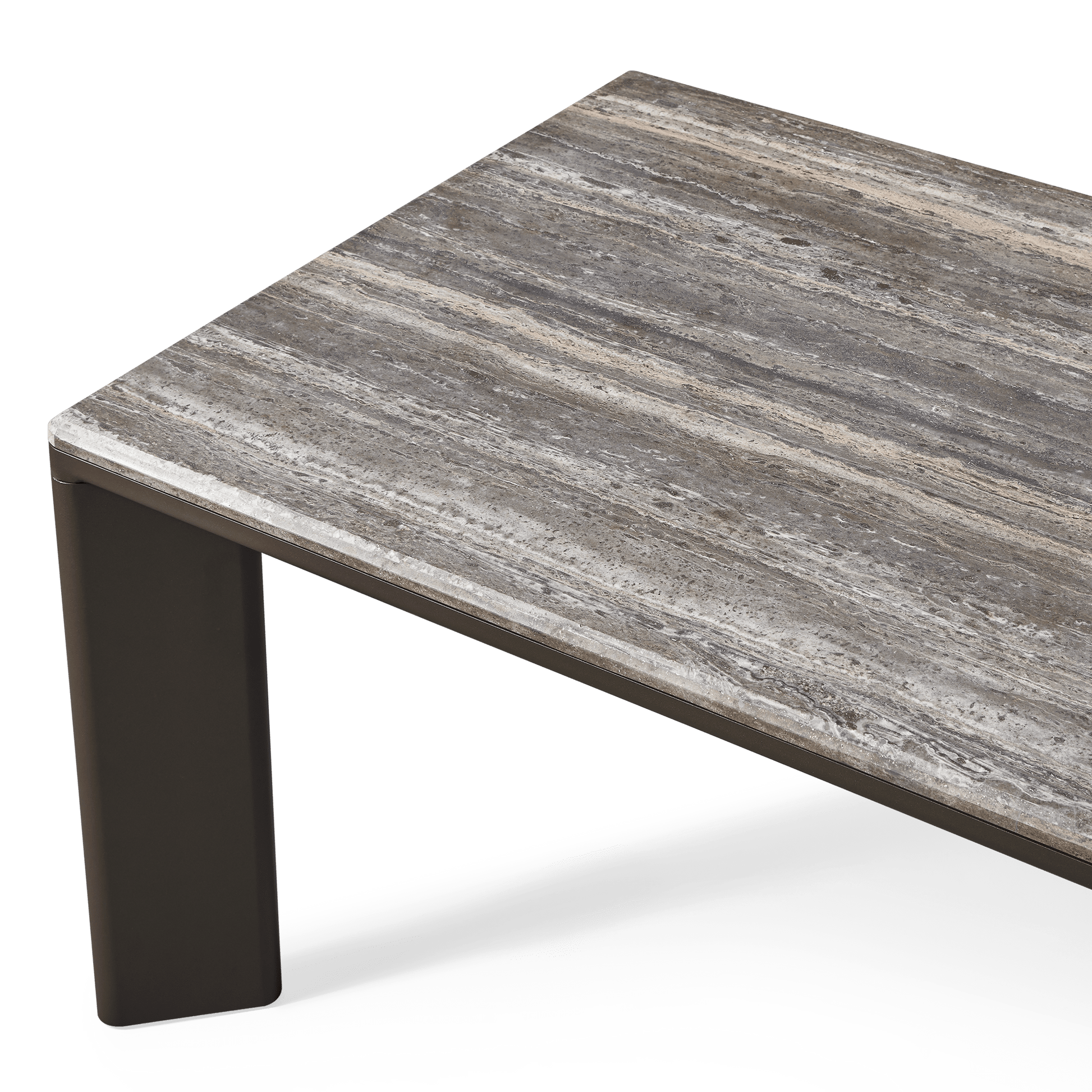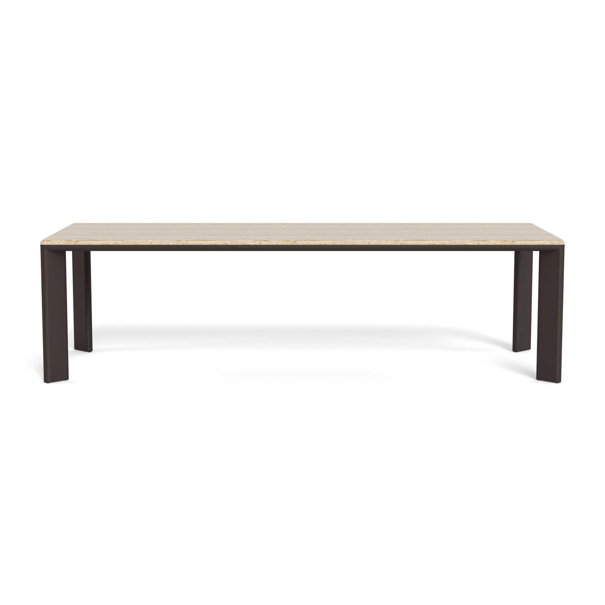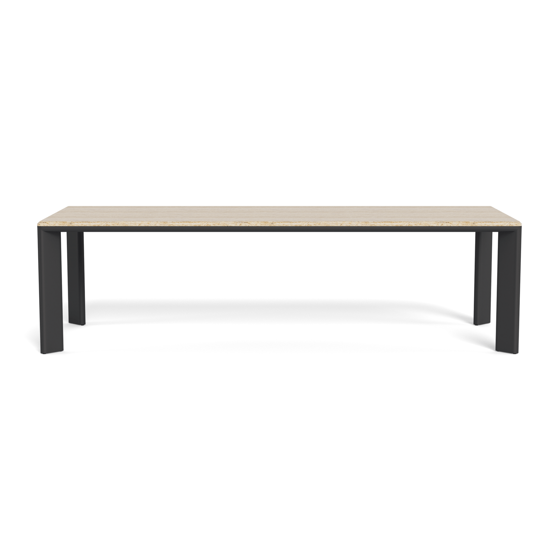 A nod to Sydney's iconic Palm Beach with its stately coastal pines. Rounded backs, vertical rope detailing and a harmonious mix of materials infuse classic silhouettes with modern elegance. Transitional in spirit, the Palm Beach Aluminum Rectangle Dining Table is a refreshing update to our signature classics—a Parsons-style table crafted in solid teak, angled legs support a travertine top and spotlight a simple, but very thoughtfully connected, design. With mixed materials creating a luxe and dimensional design, this outdoor dining table easily seats eight and complements a range of styles. Complete your outdoor dining set with the matching dining chairs.