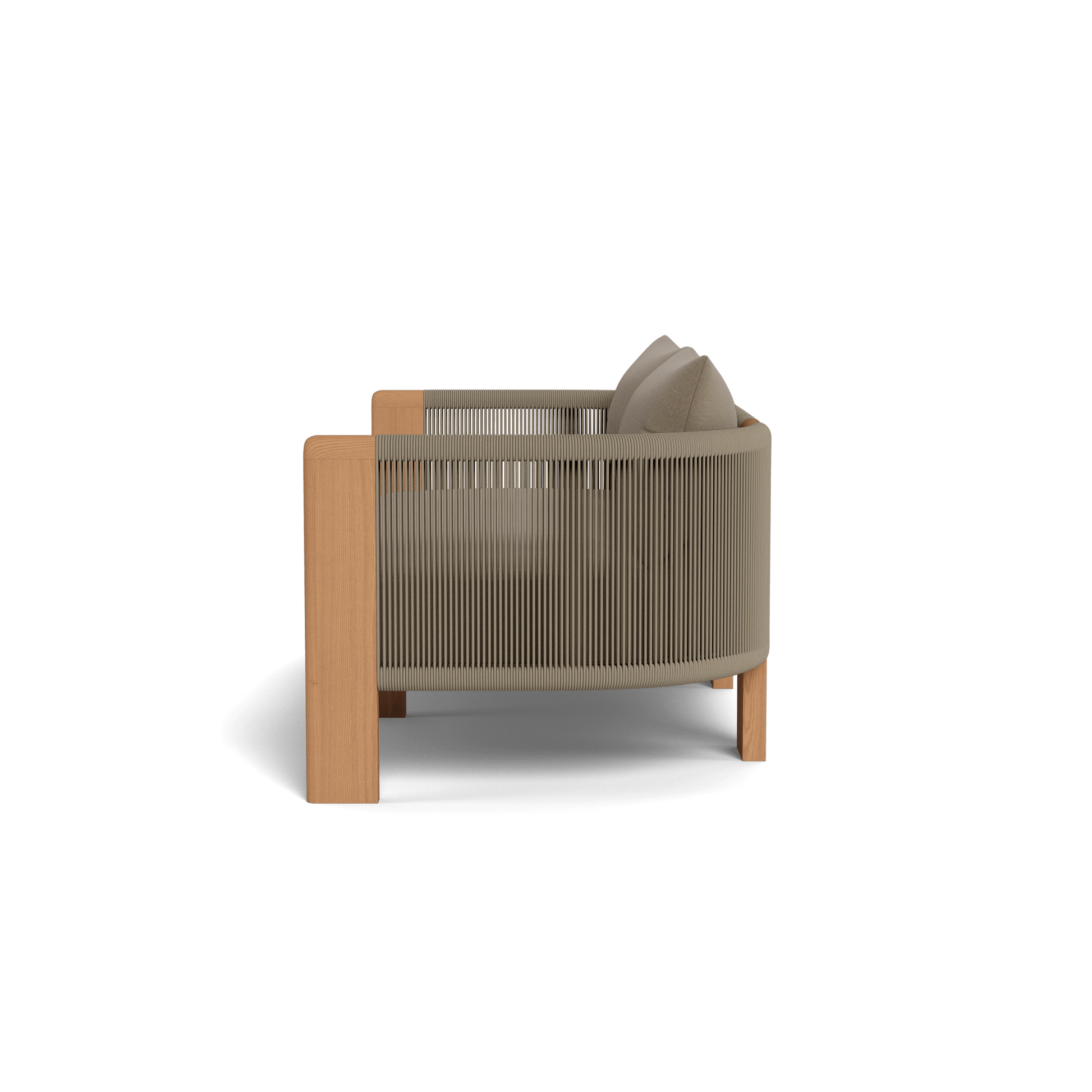 A nod to Sydney’s iconic Palm Beach with its stately coastal pines. Rounded backs, vertical rope detailing and a harmonious mix of materials infuse classic silhouettes with modern elegance. Transitional in spirit, the Palm Beach Teak 3 Seat Sofa is a refreshing update to our signature classics—enjoy a luxuriously low bench seat cushion with a pair of knife–edge back pillows on a supportive slatted suspension in the just–released colorway of Stone. The solid teak frame features vertically woven all–weather rope and plays with materials and form. In the back, two legs disrupt this rope pattern and echo the tripod construction of the collection’s chairs. Available in two versatile sizes, this comfort–driven piece seamlessly blends with many styles and in many outdoor spaces.