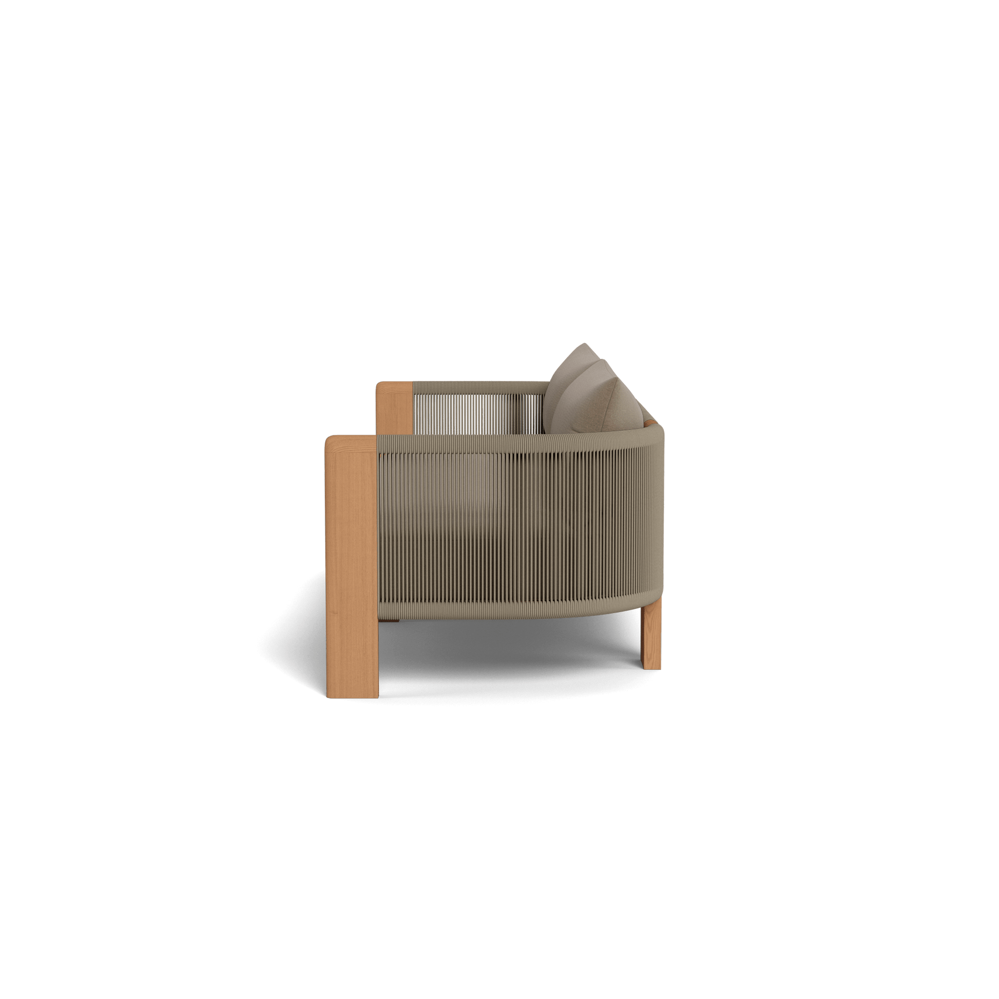 A nod to Sydney’s iconic Palm Beach with its stately coastal pines. Rounded backs, vertical rope detailing and a harmonious mix of materials infuse classic silhouettes with modern elegance. Transitional in spirit, the Palm Beach Teak 3 Seat Sofa is a refreshing update to our signature classics—enjoy a luxuriously low bench seat cushion with a pair of knife–edge back pillows on a supportive slatted suspension in the just–released colorway of Stone. The solid teak frame features vertically woven all–weather rope and plays with materials and form. In the back, two legs disrupt this rope pattern and echo the tripod construction of the collection’s chairs. Available in two versatile sizes, this comfort–driven piece seamlessly blends with many styles and in many outdoor spaces.