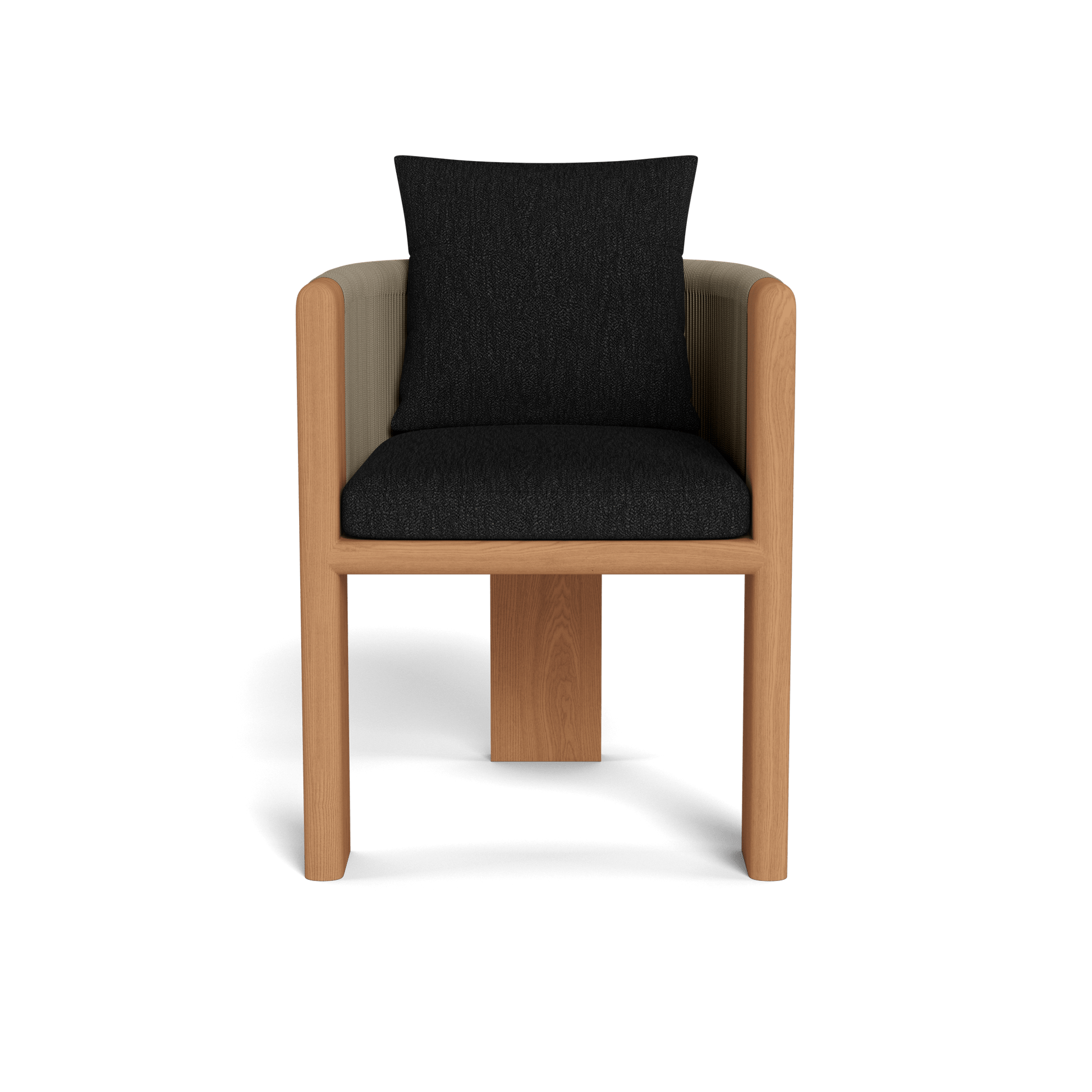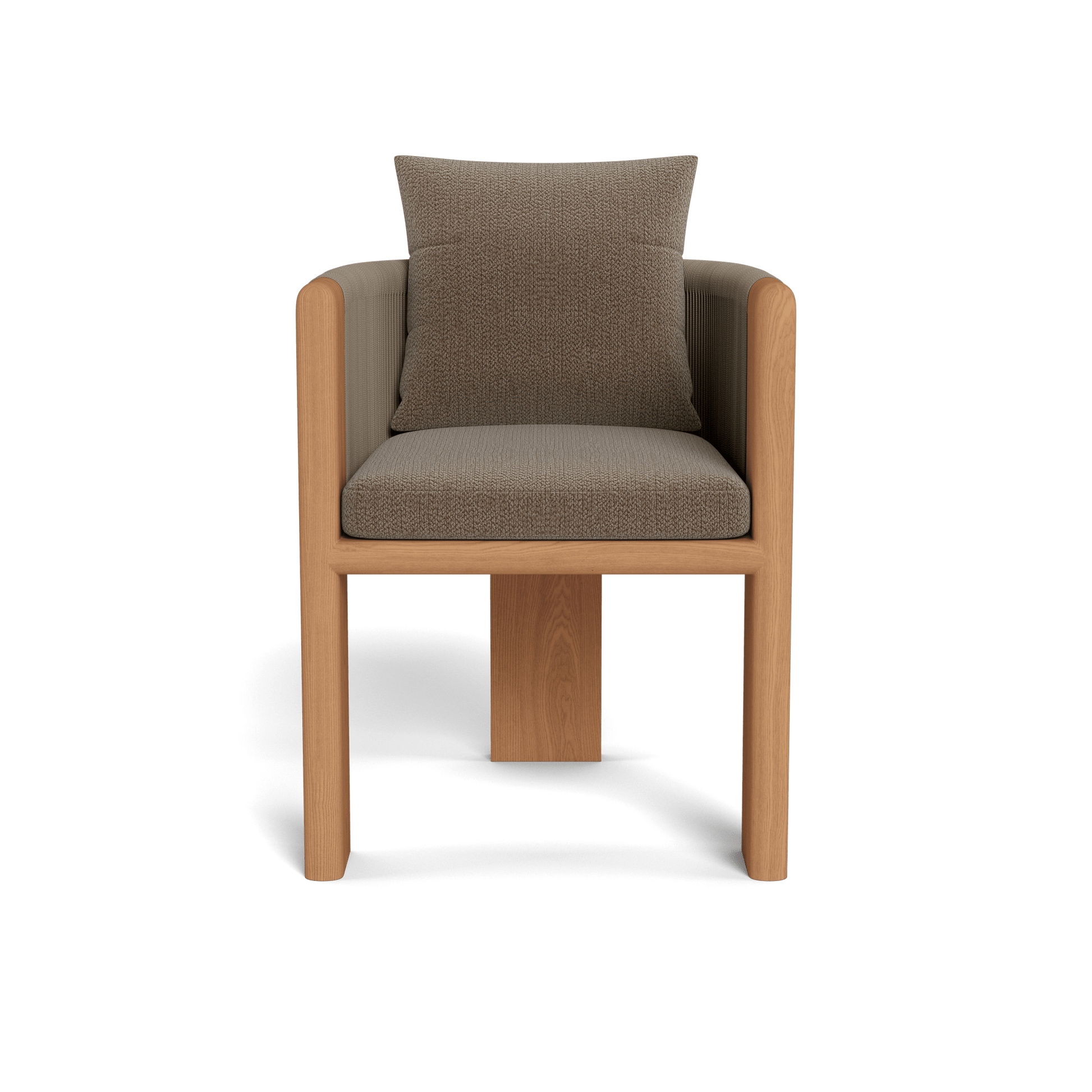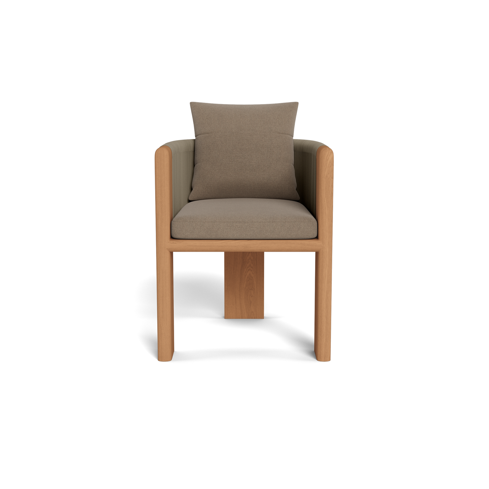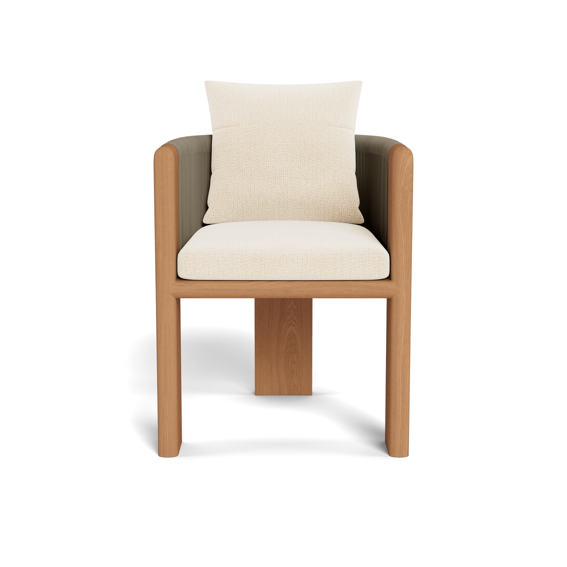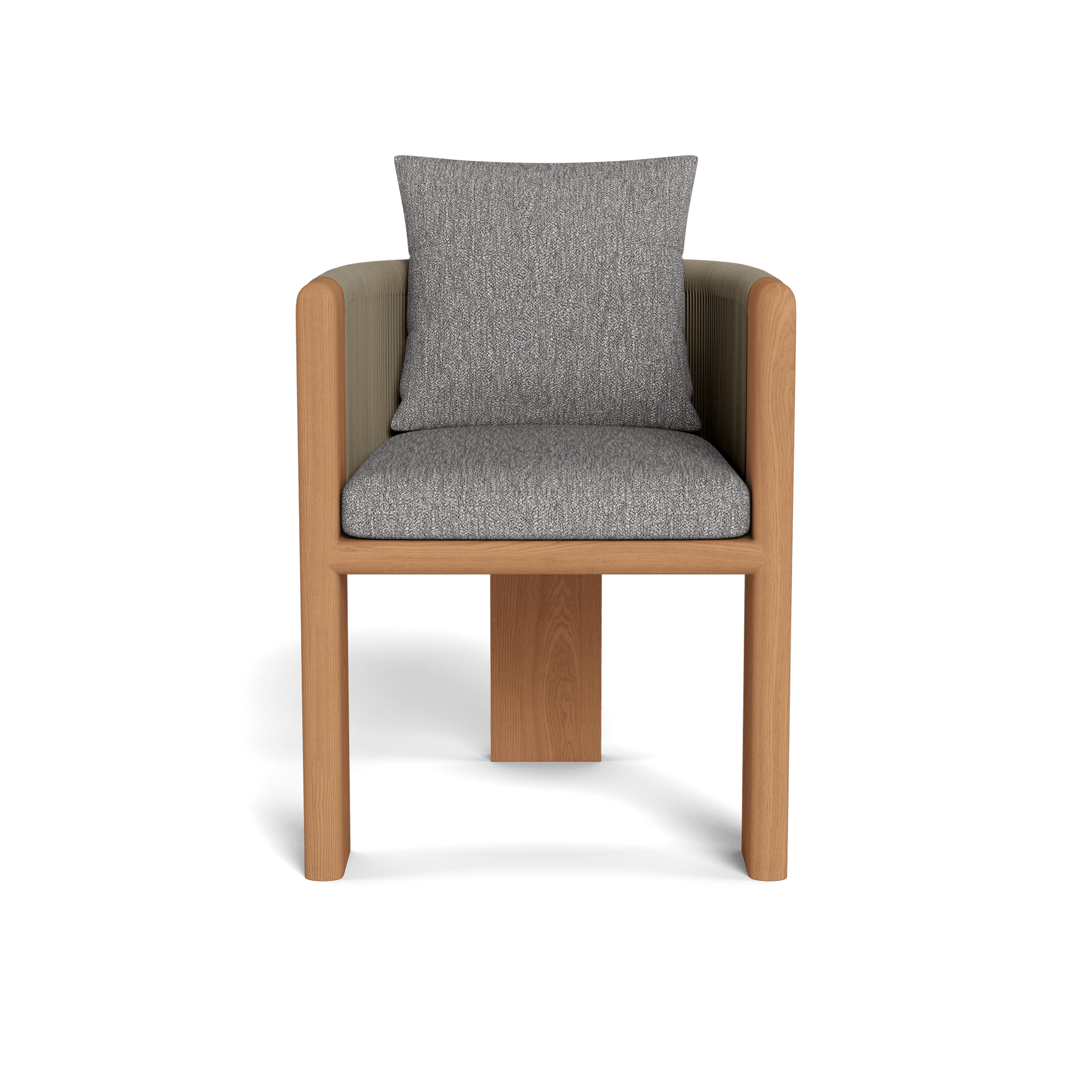 A nod to Sydney’s iconic Palm Beach with its stately coastal pines. Rounded backs, vertical rope detailing and a harmonious mix of materials infuse classic silhouettes with modern elegance. Transitional in spirit, the Palm Beach Teak Dining Chair is a refreshing update to our signature classics—enjoy a comfortable seat cushion with a knife–edge back pillow on a supportive slatted suspension in the just–released colorway of Stone. The solid teak frame features vertically woven all–weather rope and plays with materials and form. In the back, a single leg adds style and interest, echoing the tripod construction of the collection’s chairs. This comfort–driven piece seamlessly blends with many styles and in many outdoor spaces. Complete your outdoor dining set with the matching dining table.