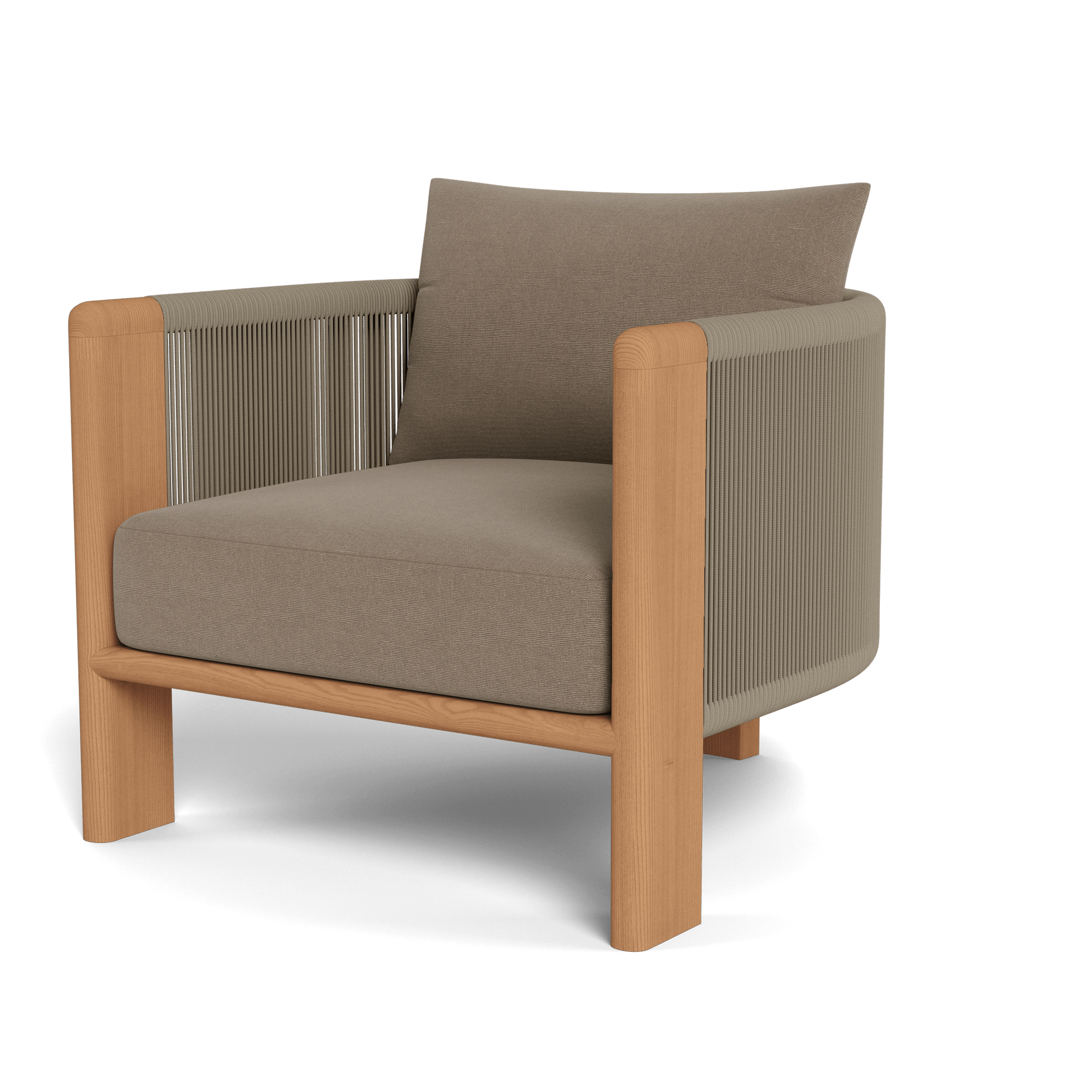 A nod to Sydney’s iconic Palm Beach with its stately coastal pines. Rounded backs, vertical rope detailing and a harmonious mix of materials infuse classic silhouettes with modern elegance. Transitional in spirit, the Palm Beach Teak Lounge Chair is a refreshing update to our signature classics—enjoy a luxuriously low seat cushion with a knife–edge back pillow on a supportive slatted suspension in the just–released colorway of Stone. The solid teak frame features vertically woven all–weather rope and plays with materials and form. In the back, a single leg adds style and interest, echoing the tripod construction of the collection’s chairs. Available in a swivel style, this comfort–driven piece seamlessly blends with many styles and in many outdoor spaces.
