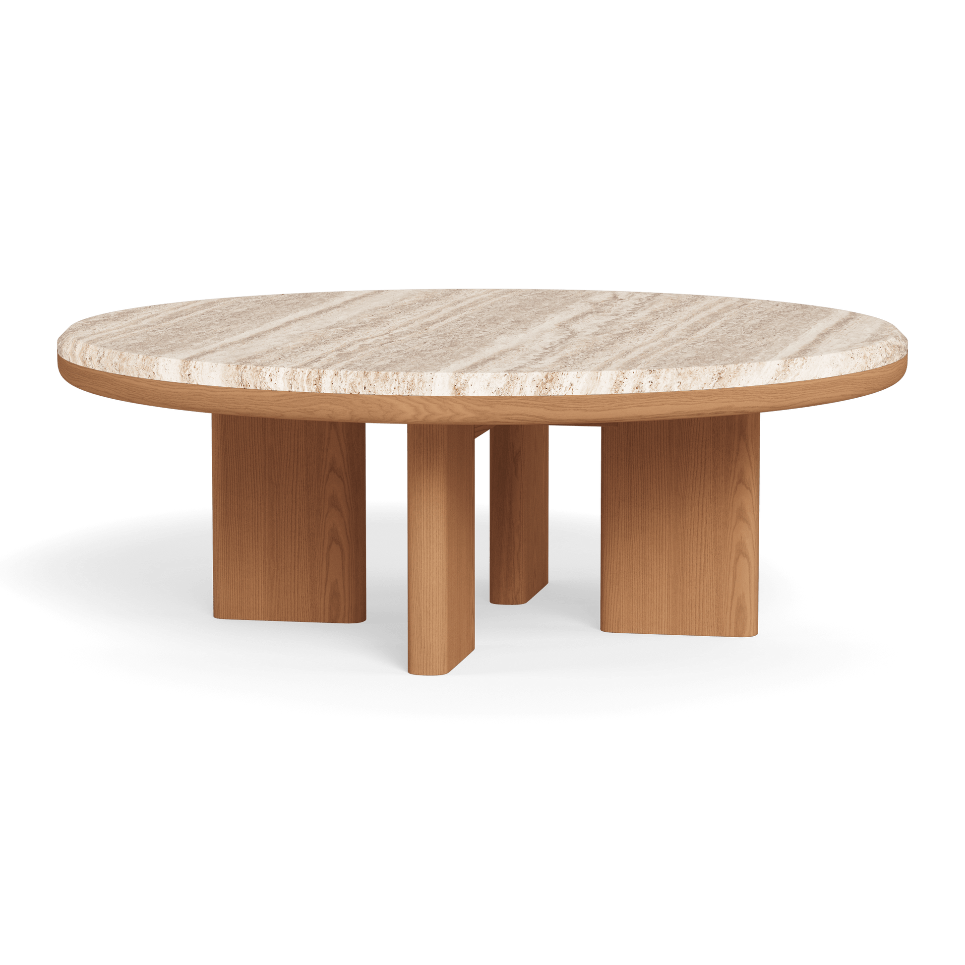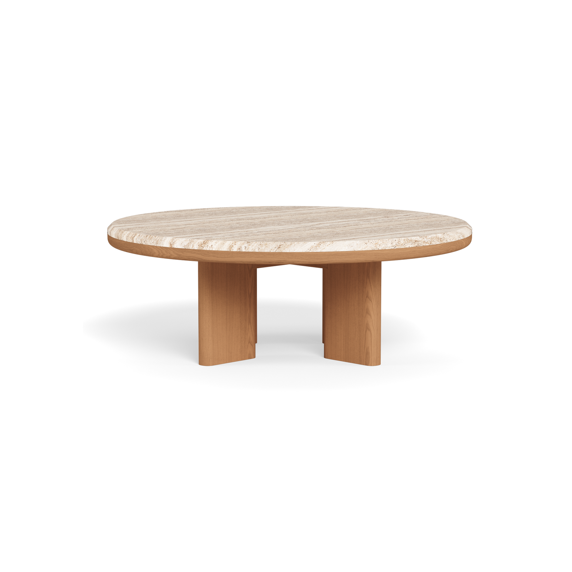 A nod to Sydney's iconic Palm Beach with its stately coastal pines. Rounded backs, vertical rope detailing and a harmonious mix of materials infuse classic silhouettes with modern elegance. Transitional in spirit, the Palm Beach Teak Round Coffee Table is a refreshing update to our signature classics—a Parsons-style table crafted in solid teak, angled legs support a travertine top and spotlight a simple, but very thoughtfully connected, design. With mixed materials creating a luxe and dimensional design, this outdoor coffee table is perfect for entertaining and complements a range of styles.