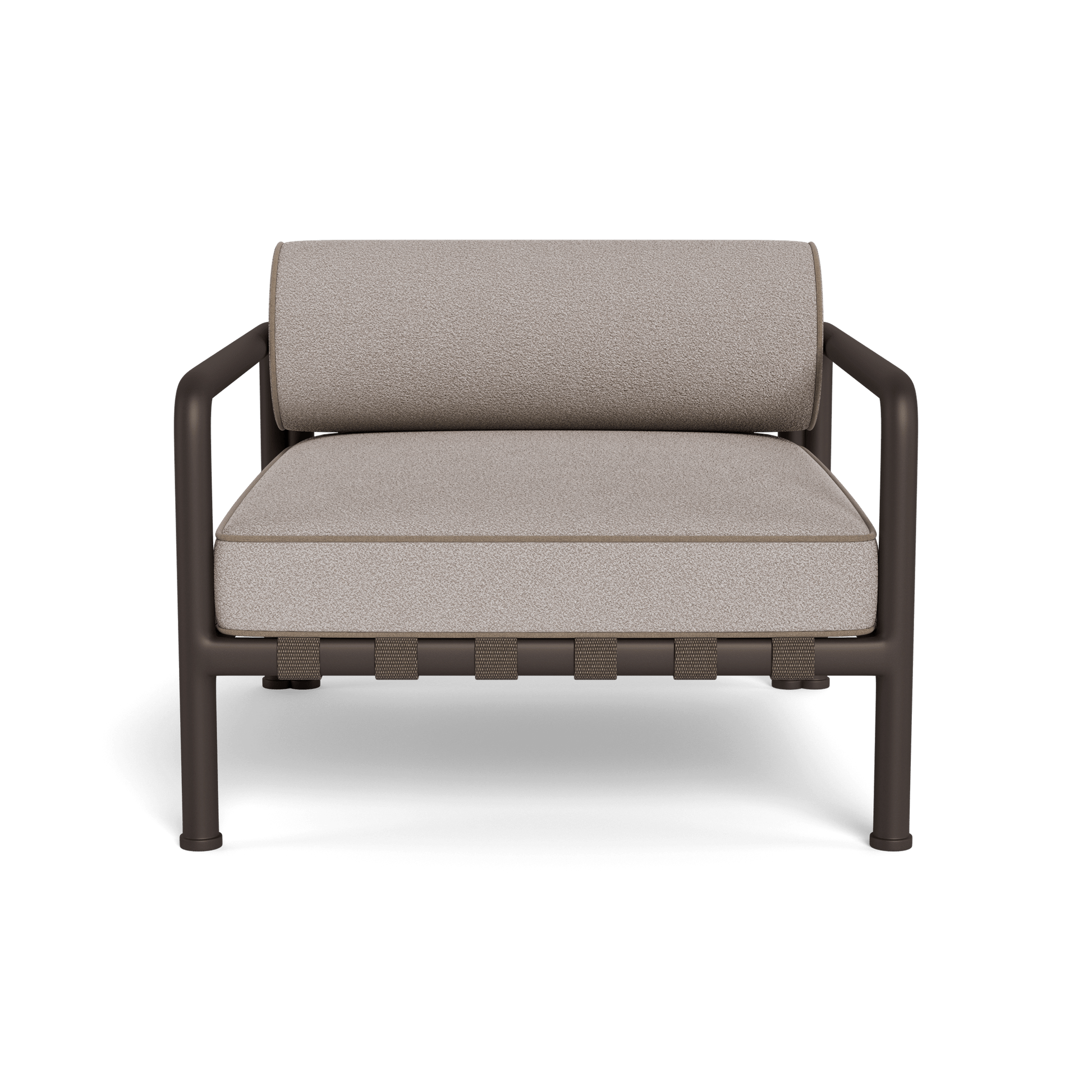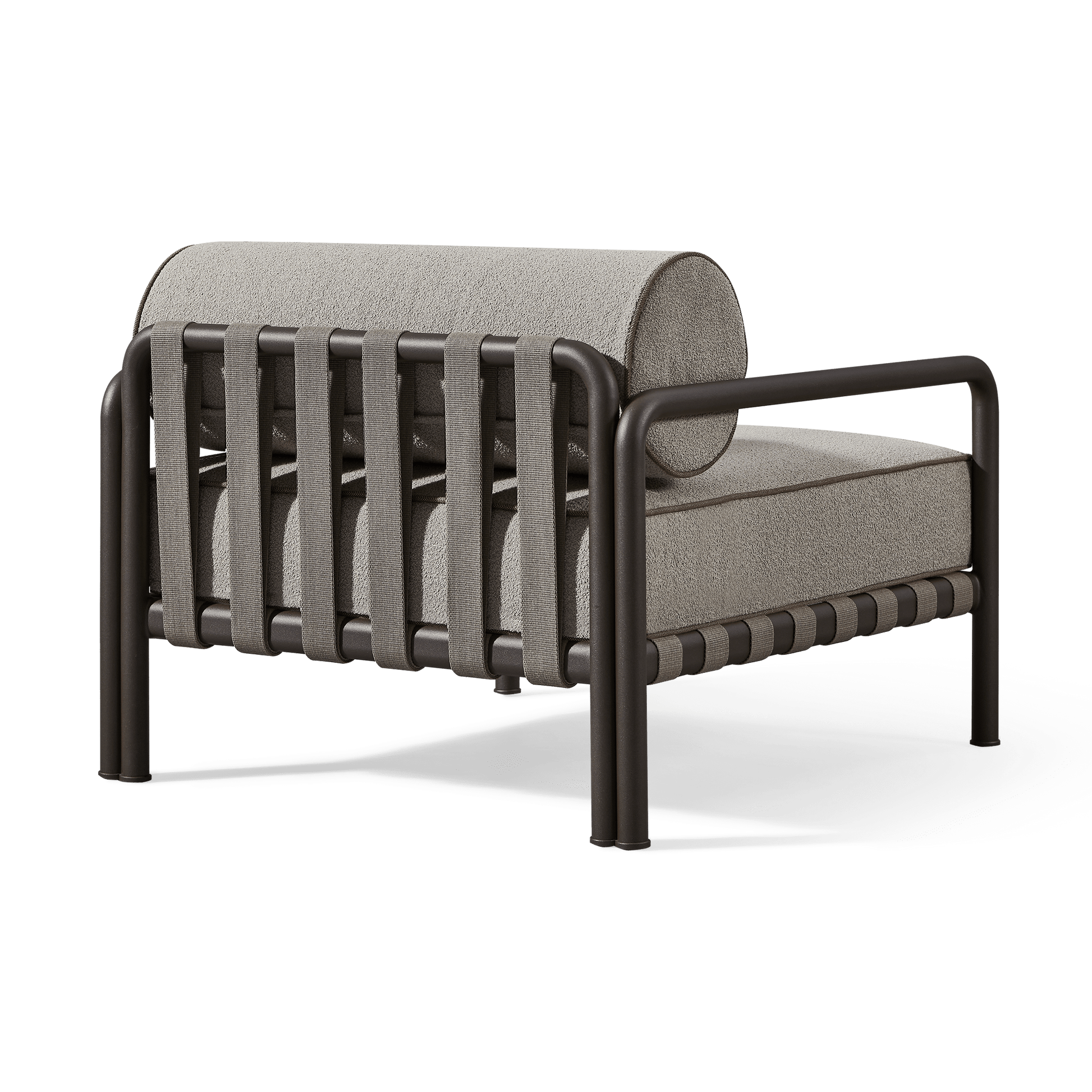 Tubular bronze aluminum, thick strapping and refined piping effortlessly update mid–century charm with contemporary sophistication for any outdoor space. The Parker Lounge Chair is a bold design statement—enjoy a comfort–driven seat cushion and bolster back, supported by a tubular metal frame and high–quality strapping woven in parallel lines in both directions for added interest as it’s spotted through the seat deck or back. Details like contrast piping and a subtle shape placed at the foot complete this design–forward low seating collection. A gorgeous and intricately crafted piece, this outdoor lounge chair brings a touch of tradition into modern day.