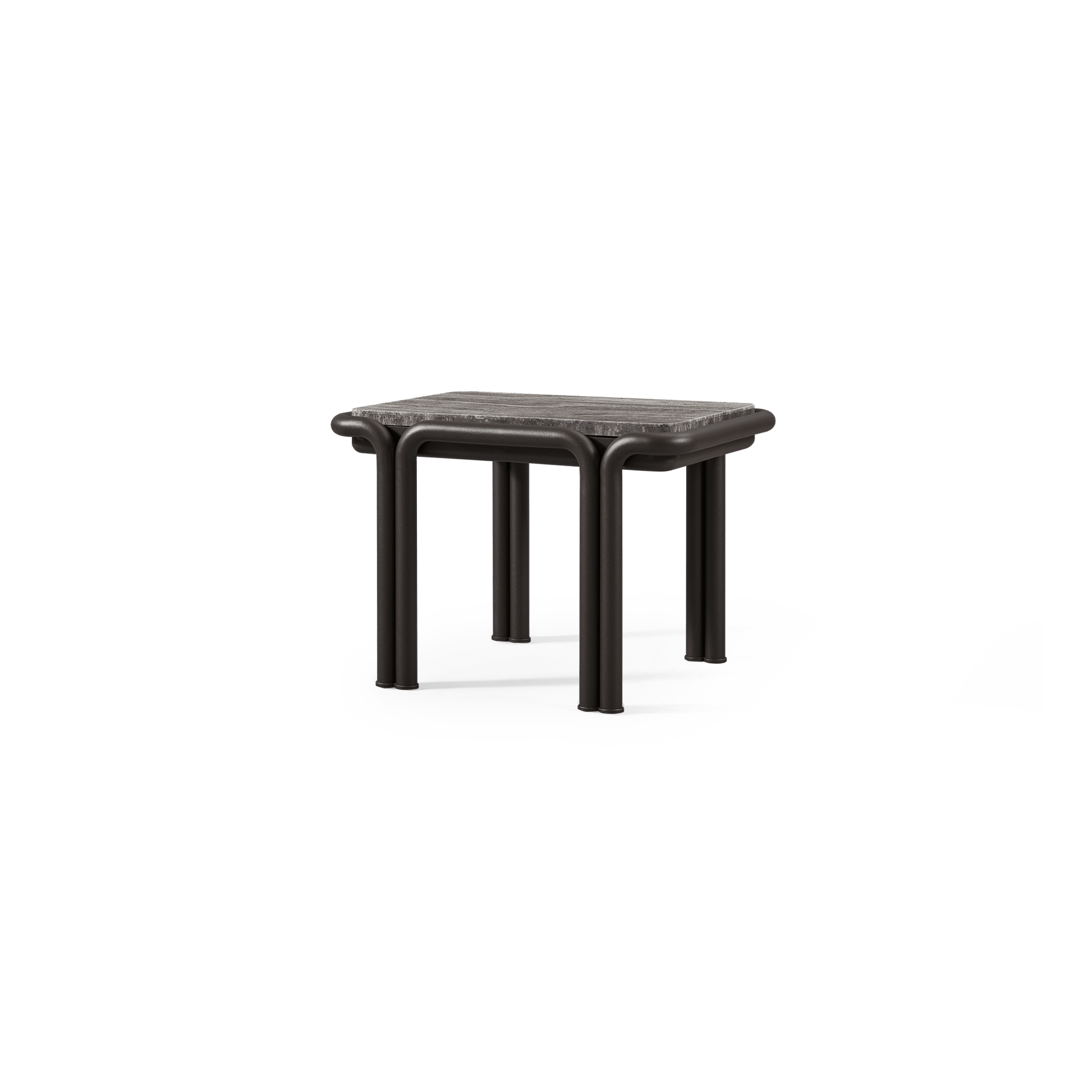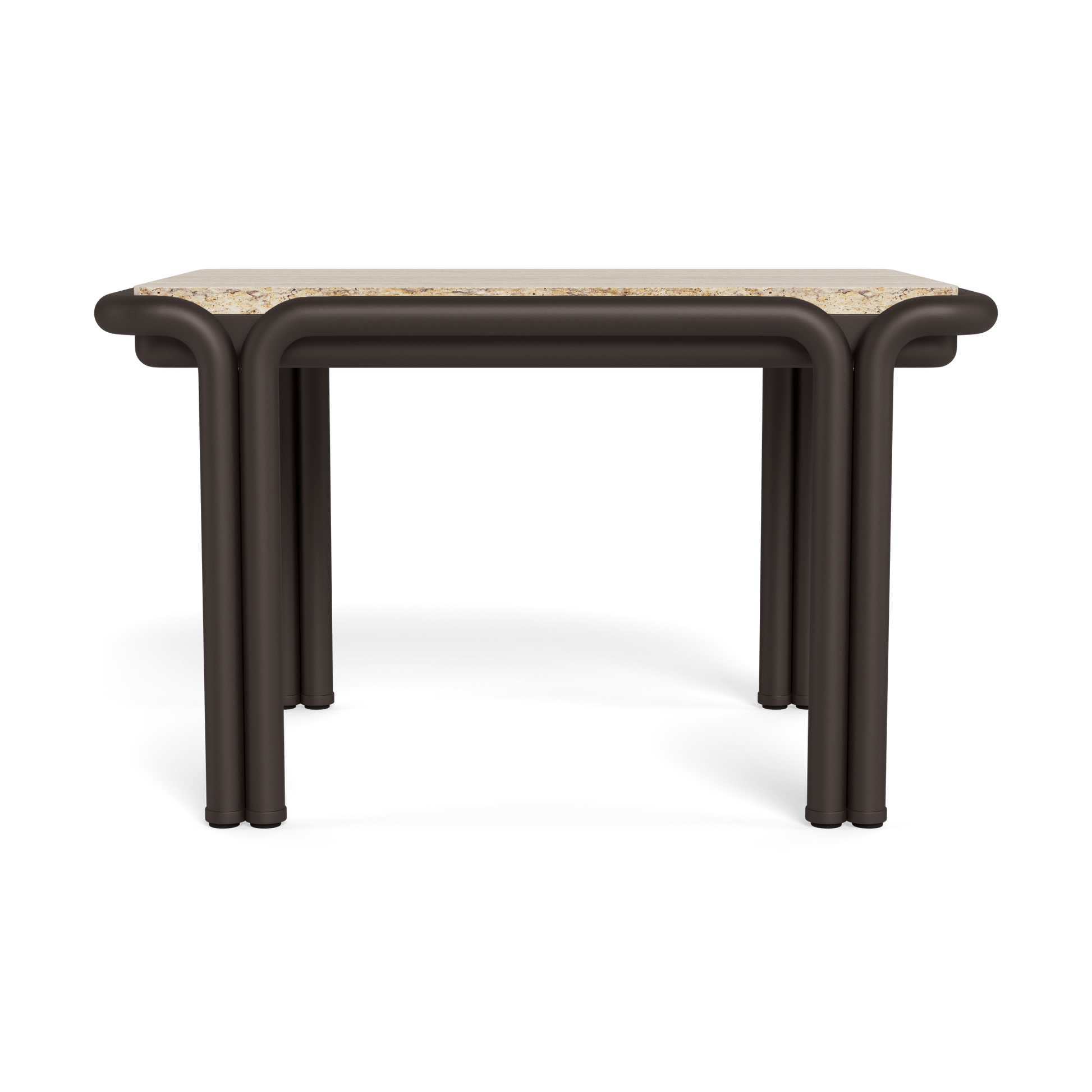 Tubular bronze aluminum, thick strapping and refined piping effortlessly update mid-century charm with contemporary sophistication for any outdoor space. The Parker Side Table is a bold design statement—crafted in tubular bonze powder coated aluminum with natural slabs of grey travertine stone, reinforced with our aluminum honeycomb structure. The legs mirror the collection's tubed details, where legs merge beautifully with backs, here creating a nice double leg detail with a subtle curve. With mixed materials creating a luxe and versatile design, this outdoor side table complements a range of styles.