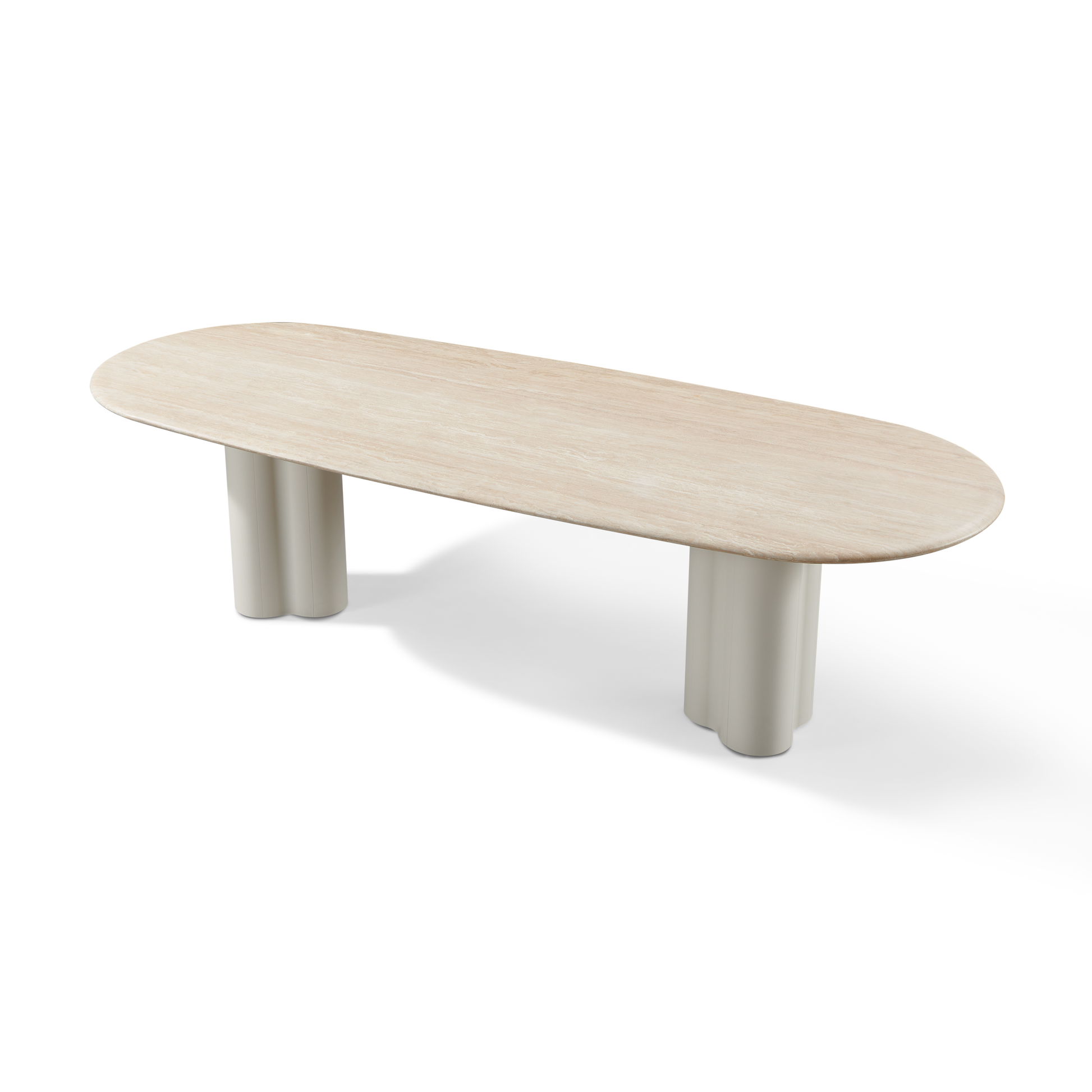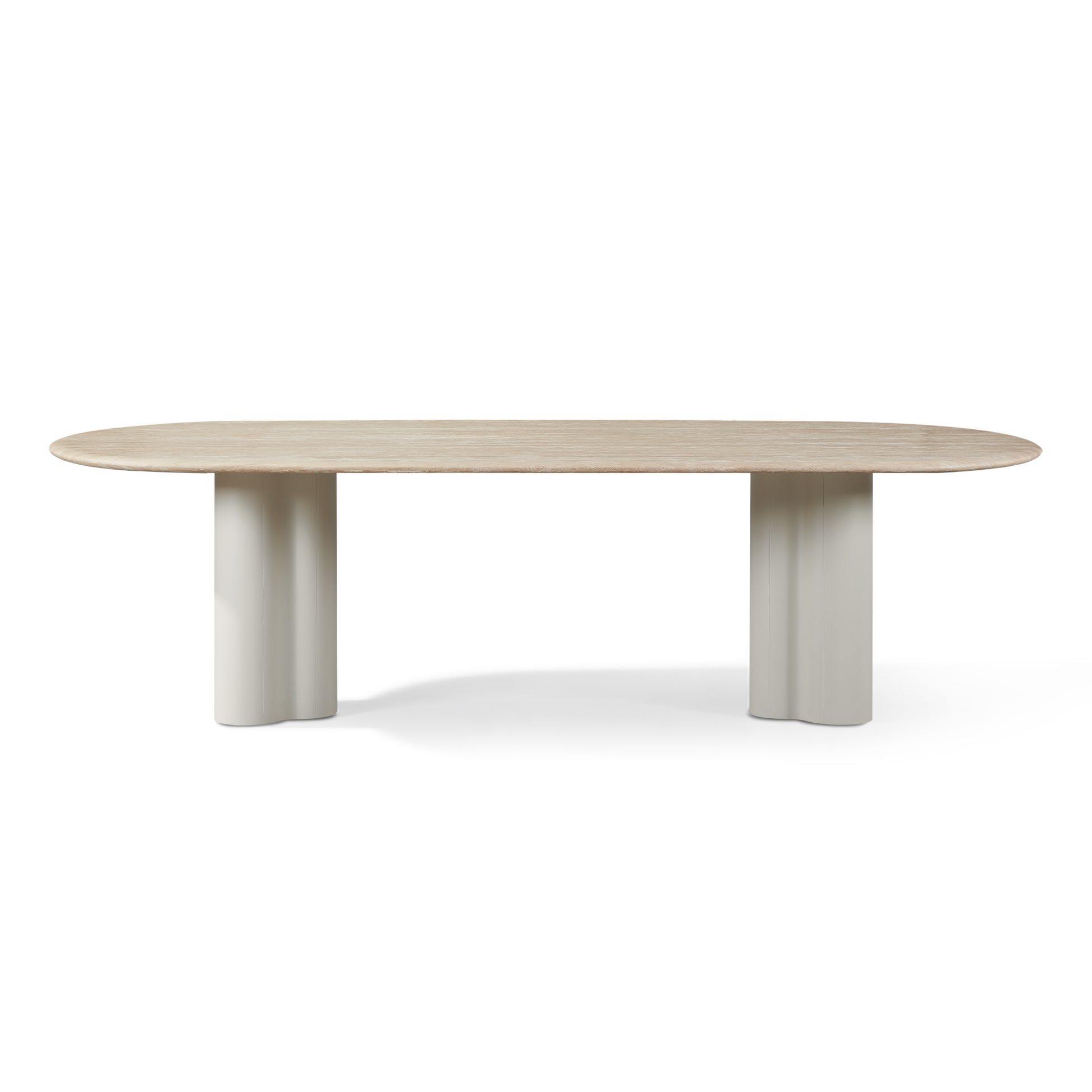 • Pill–Shaped Design: The curved ends to the dining table add a distinctive shape – the travertine top features a bullnose edge, adding a soft, modern silhouette to the outdoor dining setting.