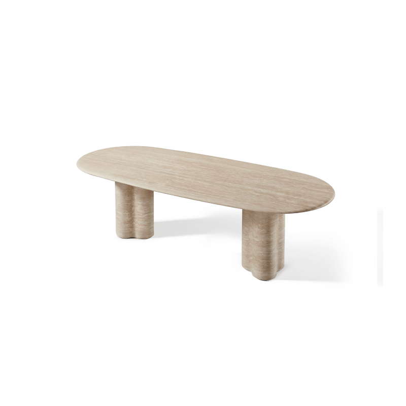 Modern Outdoor Stone Dining Table with Sculptural Travertine Bases and Organic Curves. The Porto Travertine Pill Dining Table 96” blends organic curves with architectural structure, featuring dual travertine pedestal bases and a pill–shaped travertine stone top with a soft bullnose edge. A refined statement piece for patios, terraces, and alfresco dining areas, this 96–inch table showcases natural material beauty and timeless craftsmanship.