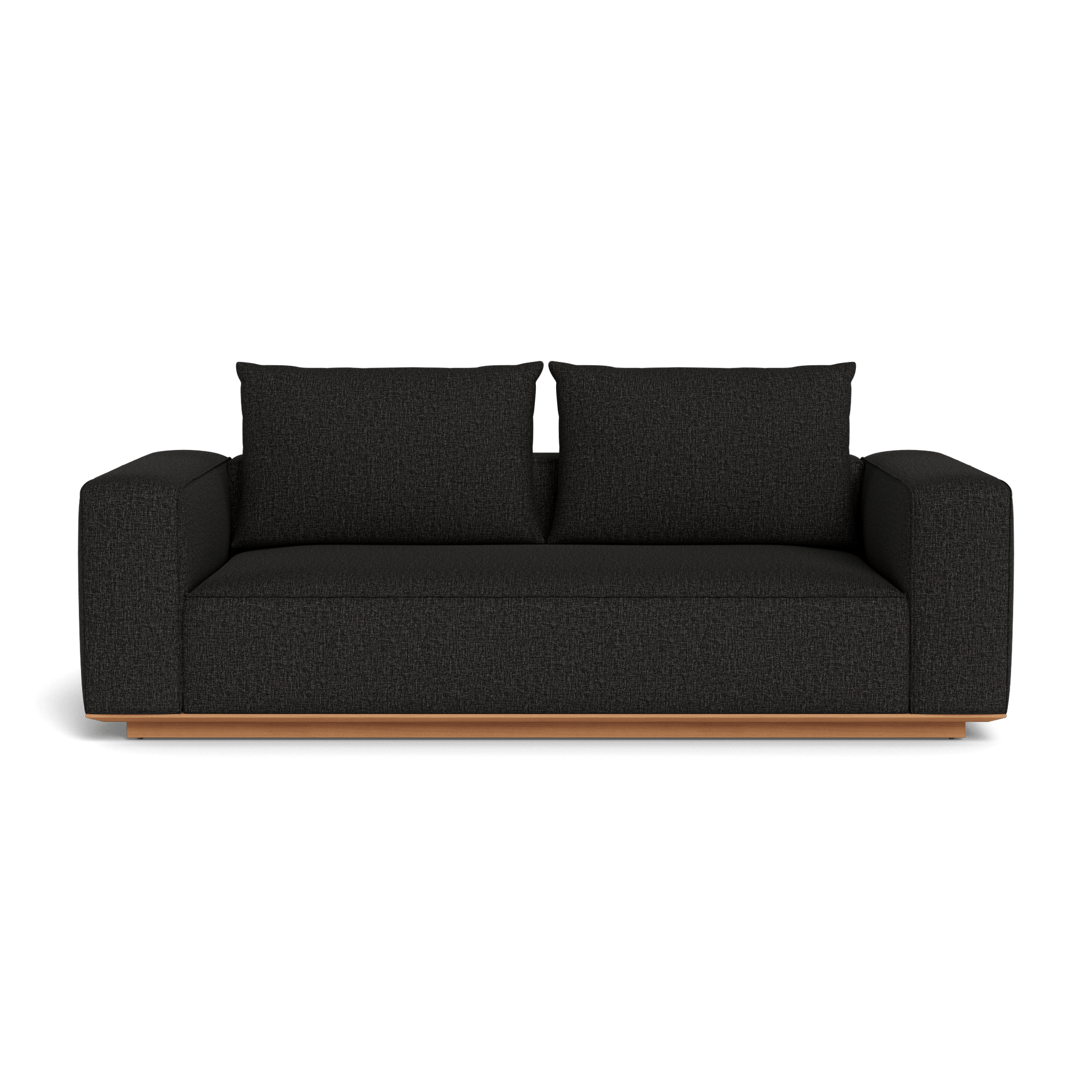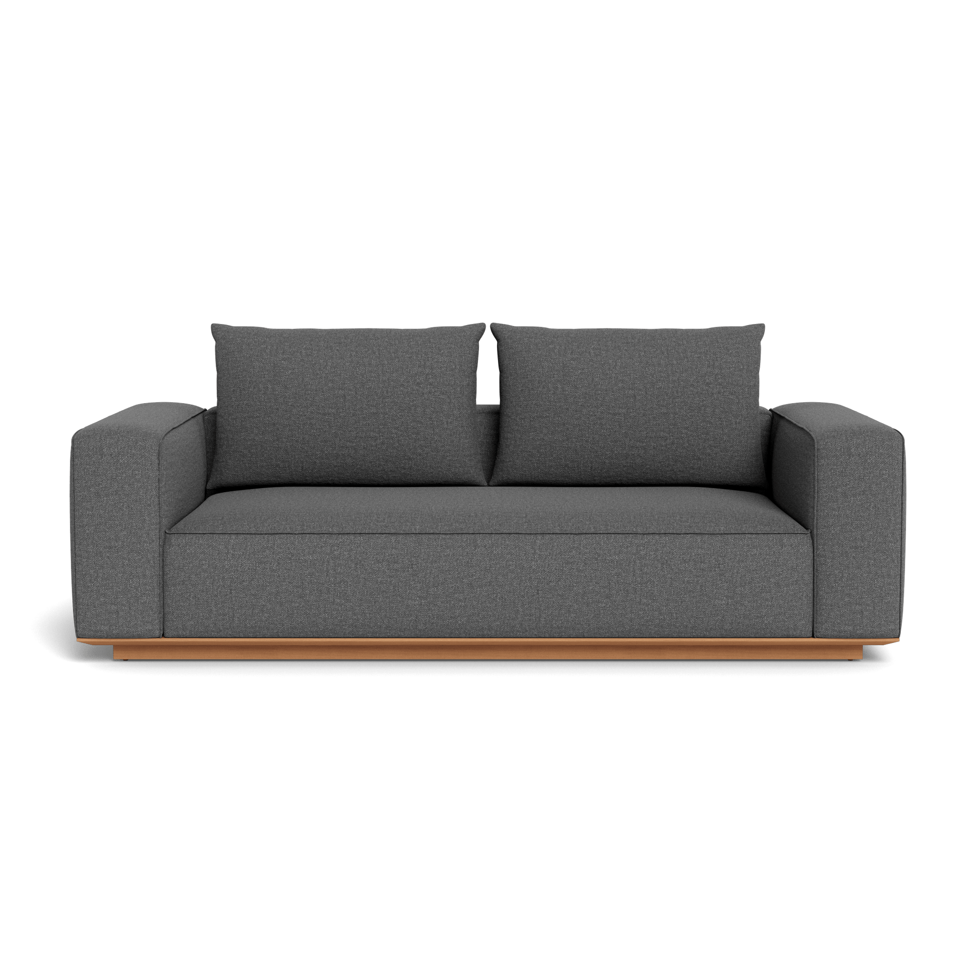 Building on our years of experience in outdoor design, the popular fully upholstered Santorini collection offers versatility in modular seating. Our smaller sofa, the Santorini Outdoor 2 Seat Sofa, is pure comfort — sink into an extra generous tight seat cushion available in a range of neutral tones with an all–weather suspension system and accent pillows, all floating on a plinth base in a choice of Asteroid aluminum or Natural teak. This easygoing modular sofa can be configured to fit an existing smaller space — and is always adaptable to the next space.