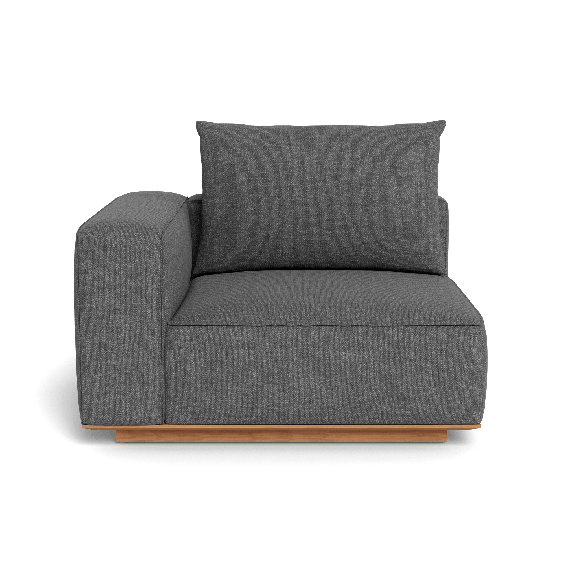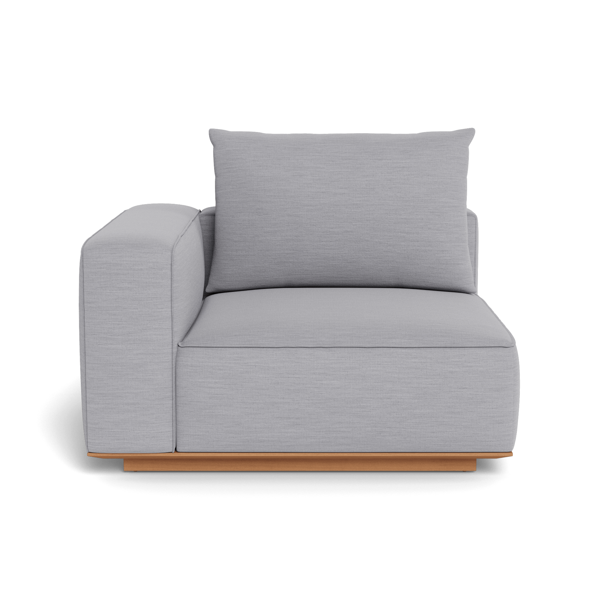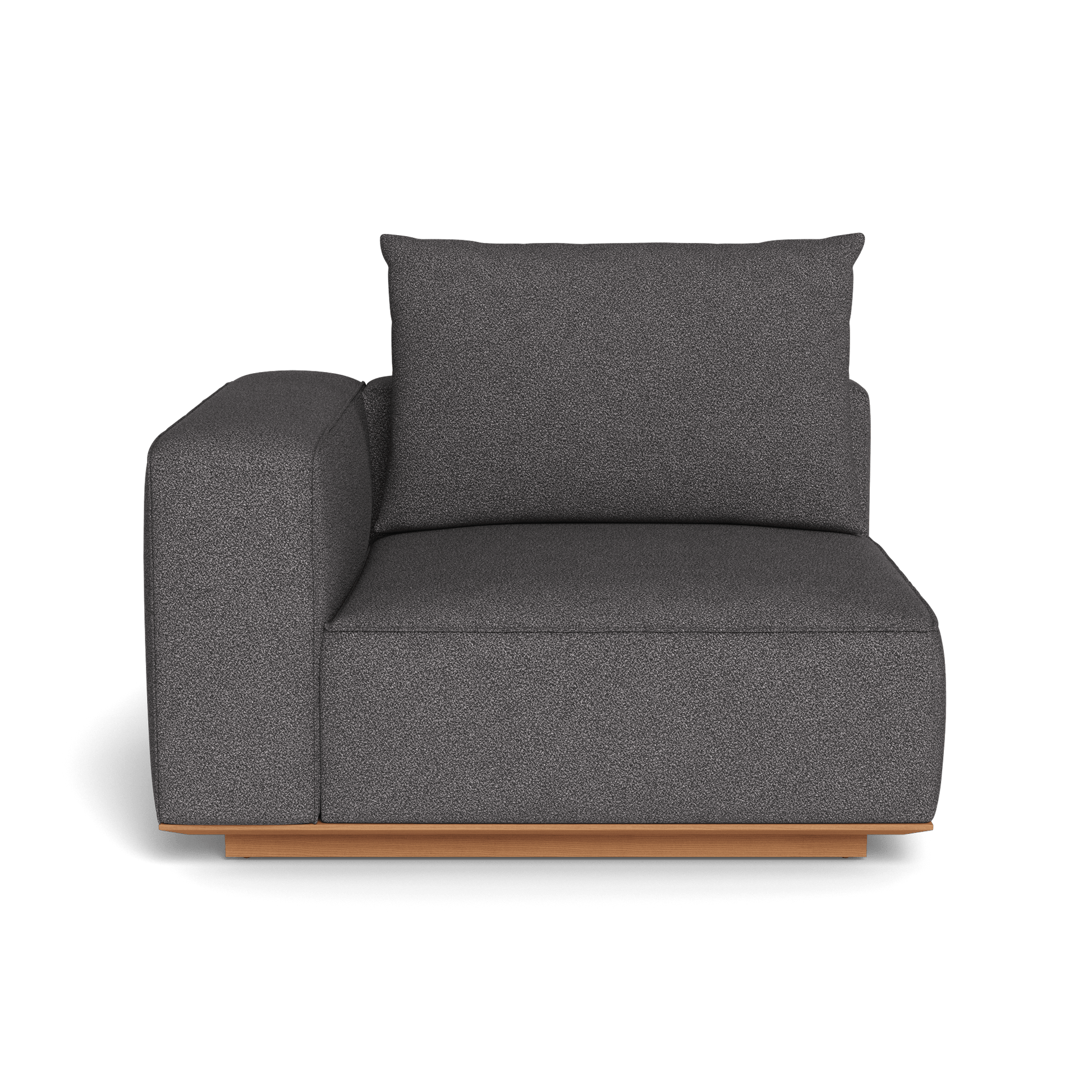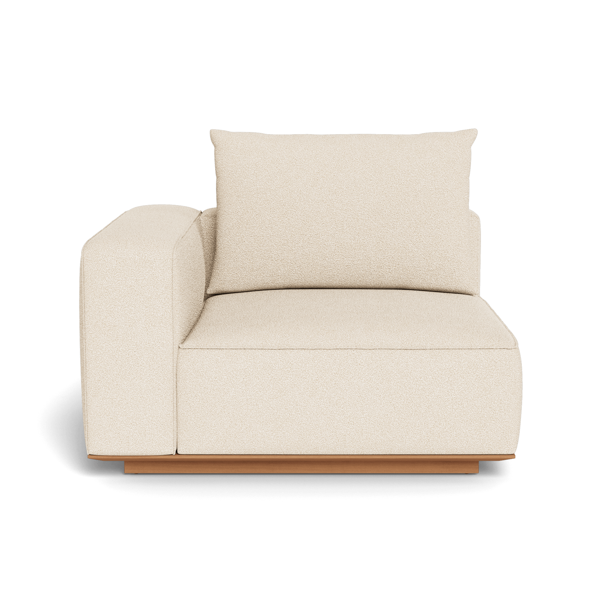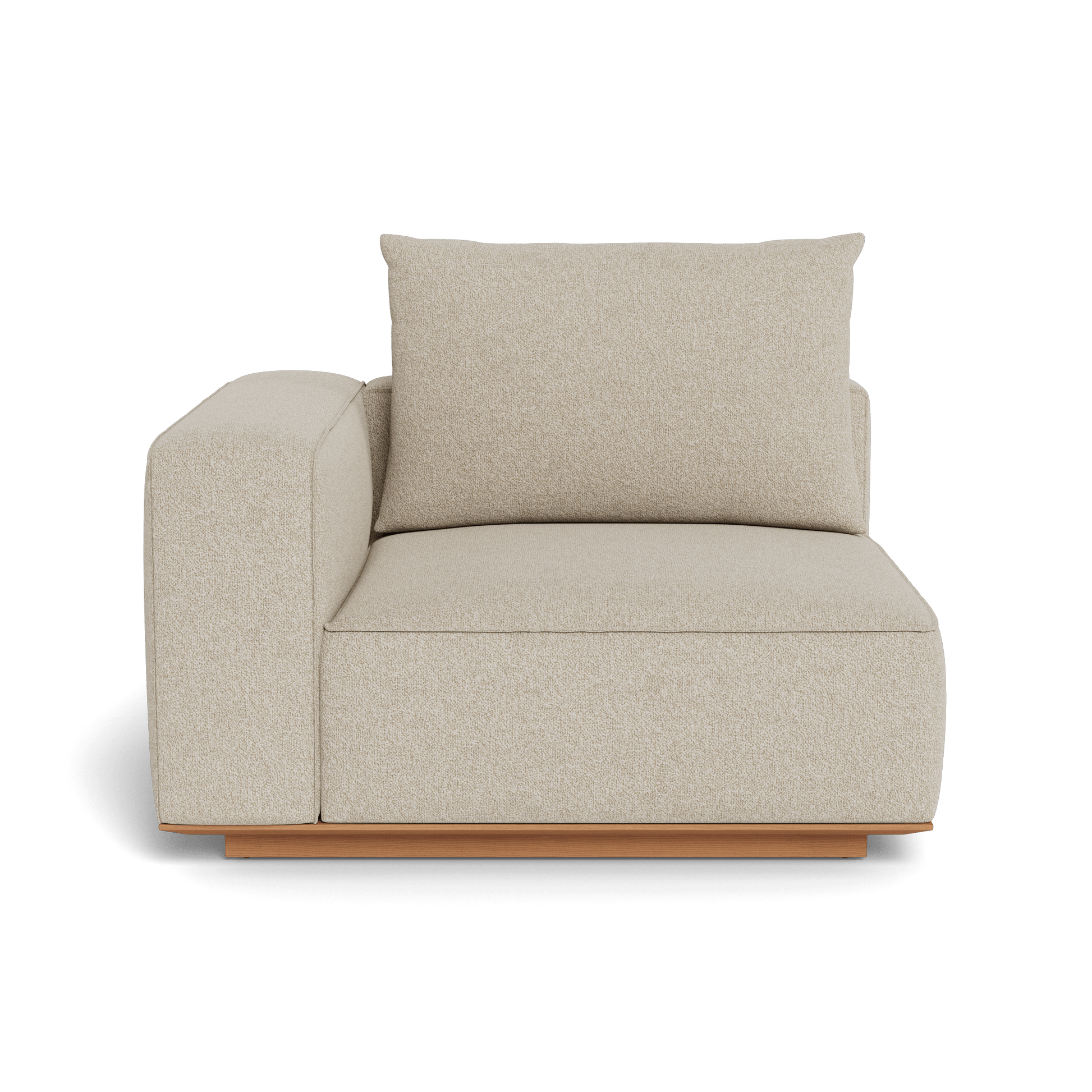 Building on our years of experience in outdoor design, the popular fully upholstered Santorini collection offers versatility in modular seating. Our Santorini Outdoor Corner Left is pure comfort — sink into an extra generous tight seat cushion available in a range of neutral tones with an all–weather suspension system and accent pillows, all floating on a plinth base in a choice of Asteroid aluminum or Natural teak. This easygoing modular sofa can be configured with unlimited Armless Singles and Ottomans to build a moveable, flexible sectional sofa for an existing space — and is always adaptable to the next space.