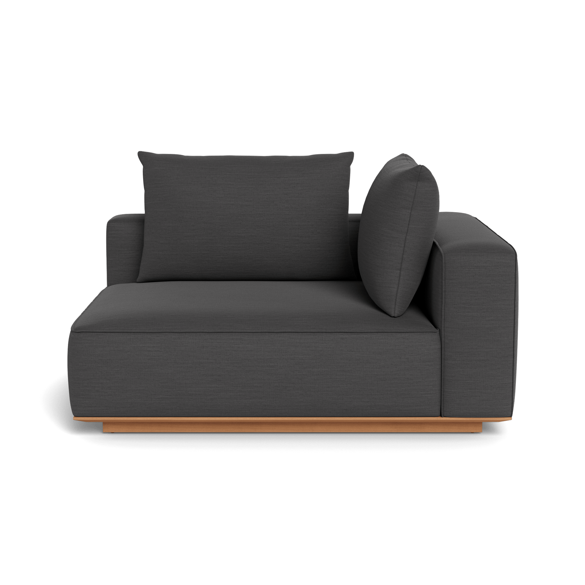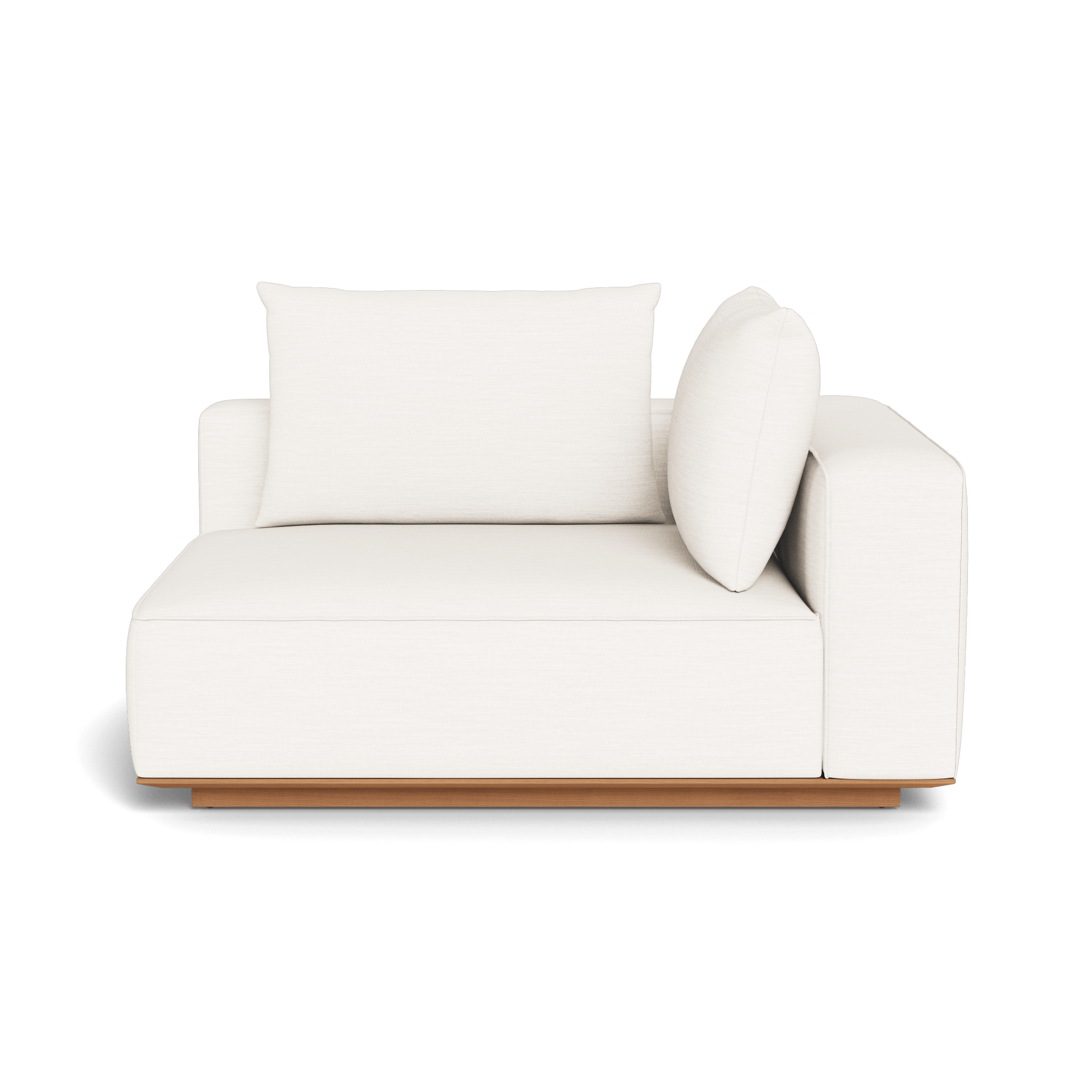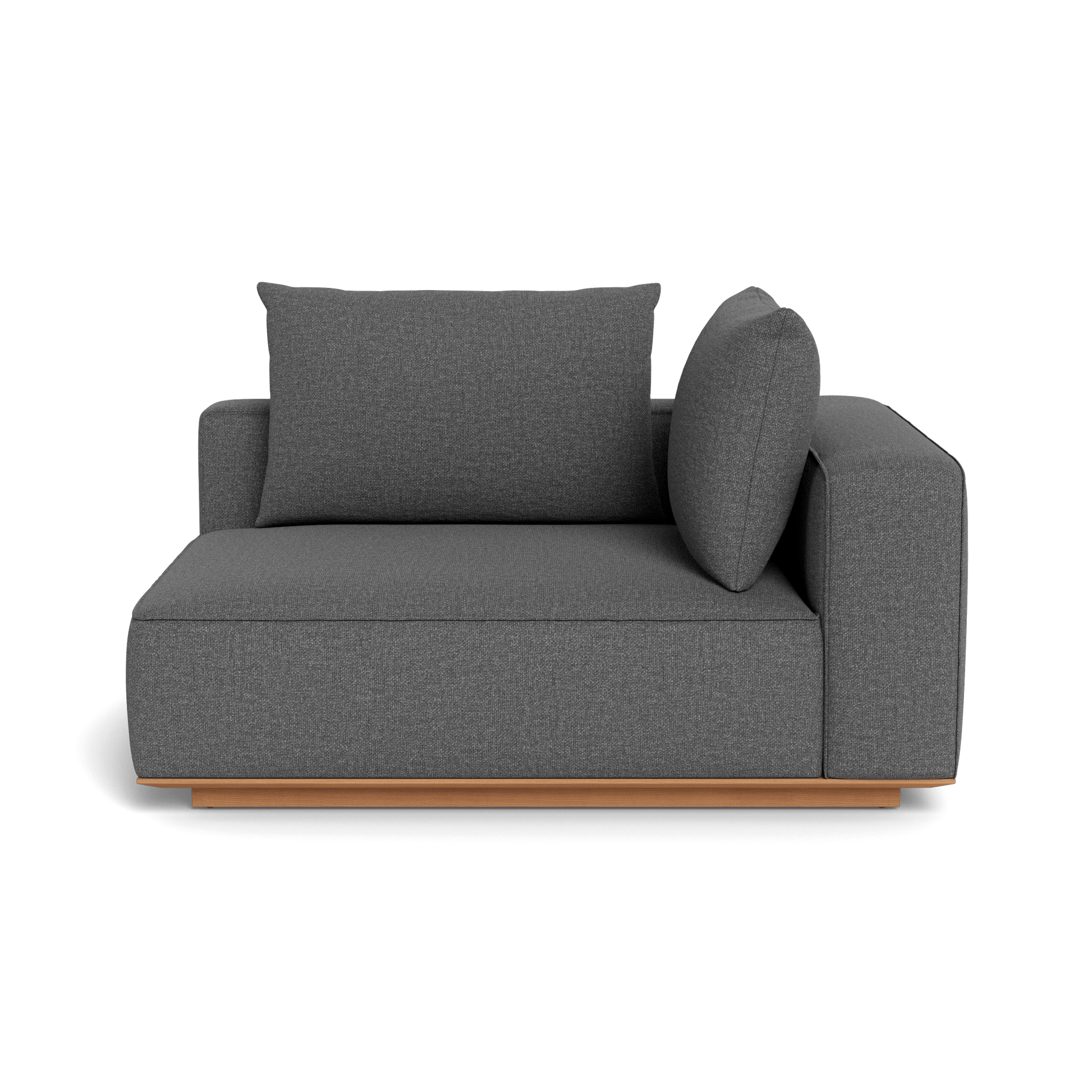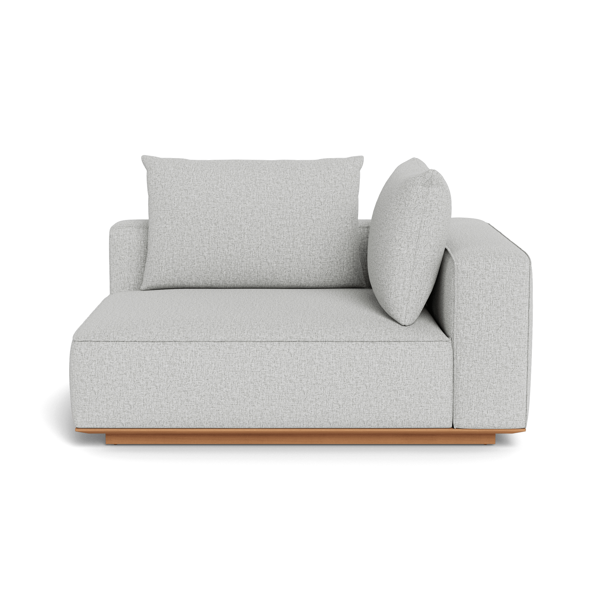 Building on our years of experience in outdoor design, the popular fully upholstered Santorini collection offers versatility in modular seating. Our Santorini Outdoor Return Right is pure comfort — sink into an extra generous tight seat cushion available in a range of neutral tones with an all–weather suspension system and accent pillows, all floating on a plinth base in a choice of Asteroid aluminum or Natural teak. This easygoing modular sofa can be configured with Armless Singles, Ottomans and other Returns to fit an existing space — and is always adaptable to the next space.